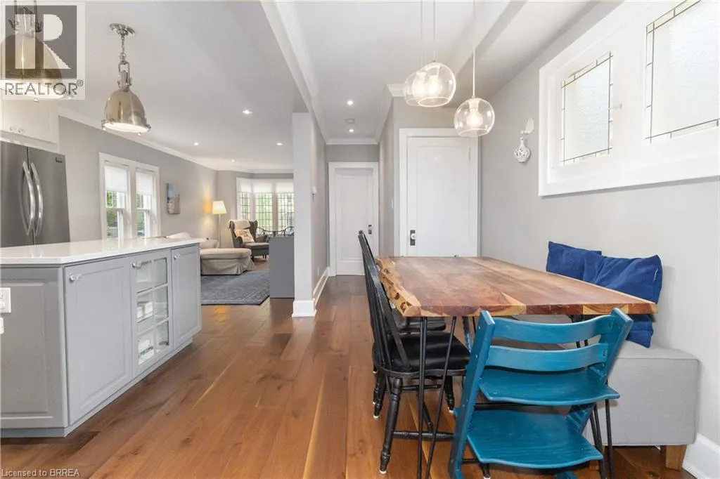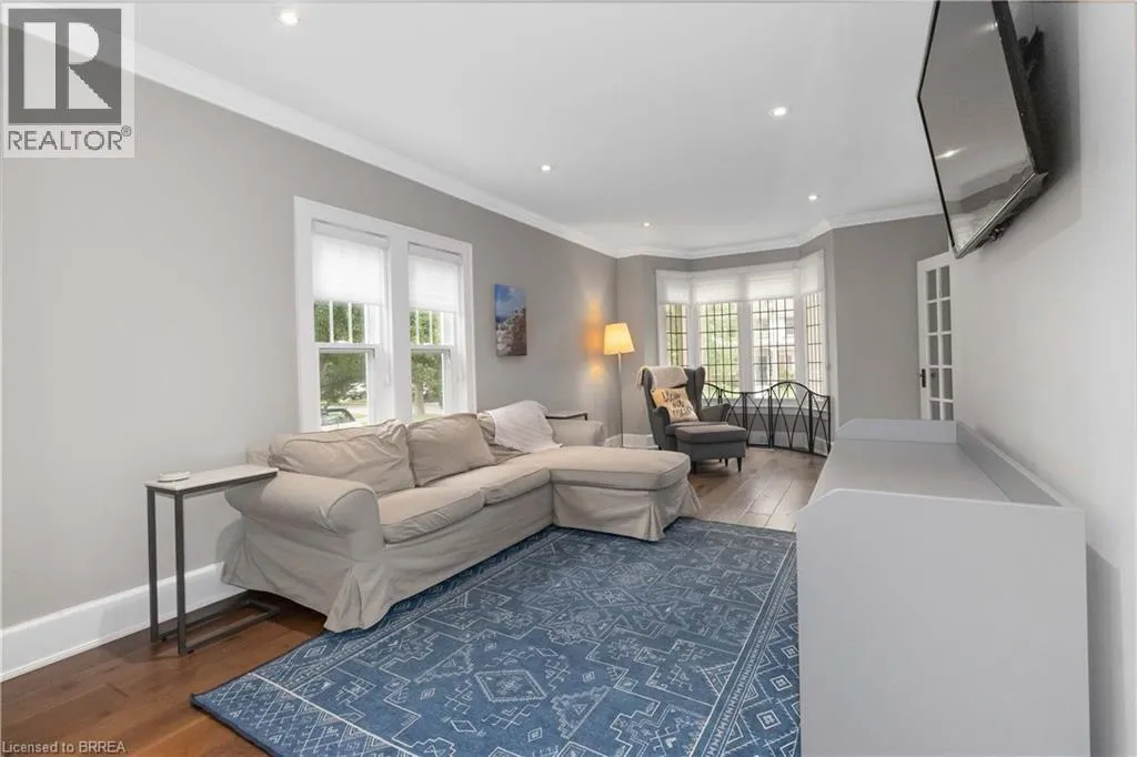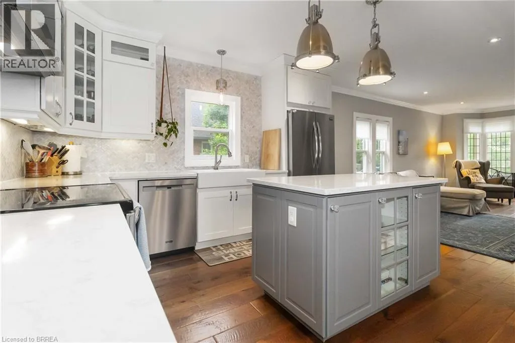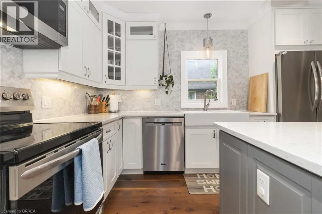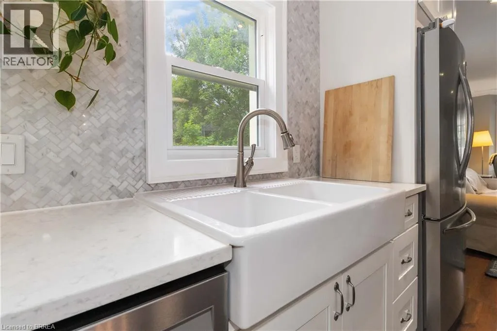From Highway 403 - take exit 36 toward Cambridge, Hwy 24 North - in 300m - left onto Fairview Dr - in 150m - left onto King George Rd - in 2.6kms - right onto Dufferin Ave - in 400m - left onto Morrell St - in 100m - right onto Lincoln Ave to #19 19 Lincoln Ave represents a shining example of handsome curb appeal & historic charm combined with modern updates from top to bottom. This family home is situated in the heart of Brantford's sought after Dufferin neighbourhood. Welcoming and alluringâfor those who appreciate an abundance of natural light complemented by a contemporary colour scheme. This seldom offered home also affords many upgrades such as FA gas furnace (2011), shingles (spring of 2014), an extensive renovation in 2015 resulted in an attractive open main level floor plan the welcomes you entering from the bright front foyer. It's hard not to smile with eyes wide when entering the living room at front of the house featuring classic leaded glass bay windows. Turning to the modern yet classic kitchen with white cabinetry, a large island with an abundance of added storage, all complimented by premium quartz surfaces and shining stainless appliances framed by resilient engineered hardwood. The rear of the main level features more storage, double doors leading to the back yard and a practical and convenient 2 piece washroom. Upstairs features 3 bedrooms, all in soothing neutral tones, original oak hardwood in excellent condition updated vinyl windows. The 2nd level is complete with a 4 piece washroom. In the basement - you will also find newer windows, resilient vinyl plank flooring in the Rec Room and renovated Laundry area. Well thought out storage is also featured in the lower level along with updated mechanicals. The back yard features a newer deck (2019), enough grass and gardens to enjoy but won't take your entire weekend maintaining - and a detached single car garage (recently painted) with shingles replaced in 2013. I dare you not to fall in love with this truly lovely home in a highly desired area. (id:27476)