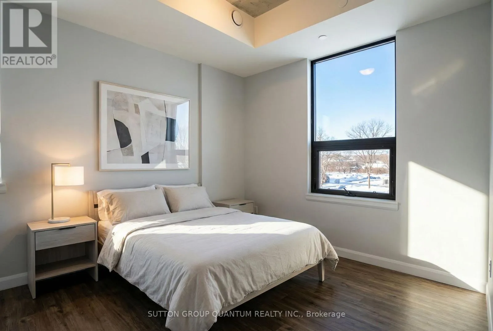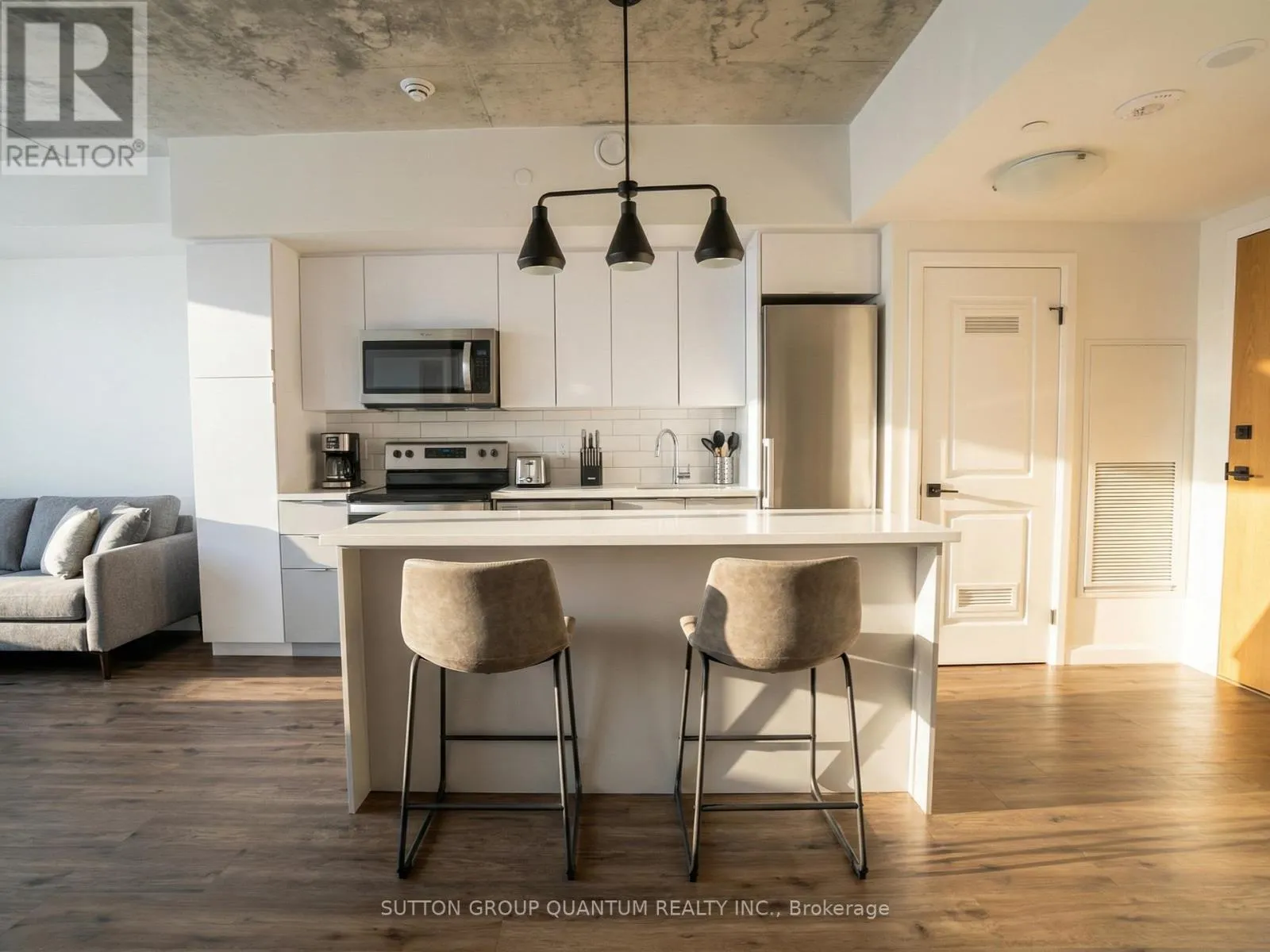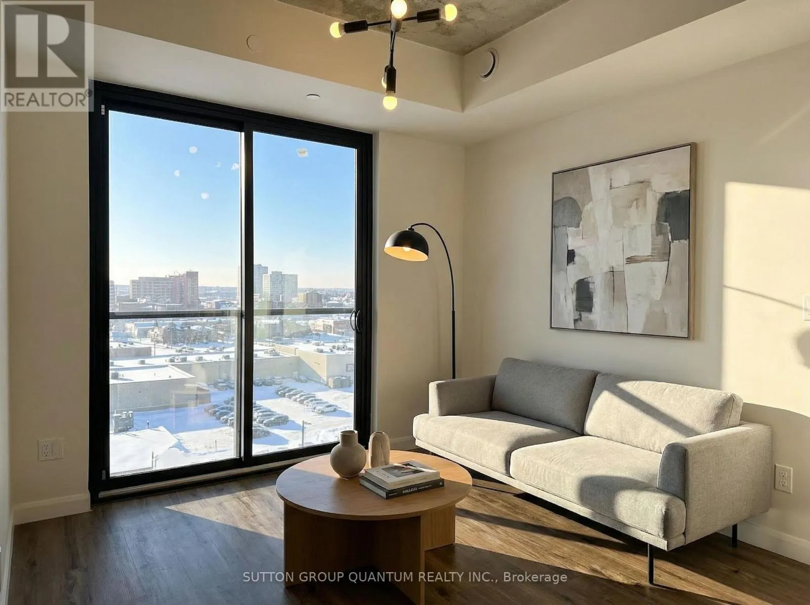 Cross Streets: Market Street. ** Directions: MARKET ST S TO ERIE AVE. Welcome to Grand Bell Condos at 7 Erie Avenue, one of Brantford's most desirable addresses. This bright and well-designed 1-bedroom plus den, 1-bathroom suite offers functional open-concept living with soaring 9-foot ceilings and large windows that fill the space with natural light and showcase open north views over downtown. The contemporary kitchen features quartz countertops, stainless steel appliances, a large island ideal for dining or entertaining, and ample storage. The spacious living area flows seamlessly, creating an airy and comfortable atmosphere. The living room includes Juliet balcony doors bringing in even more light, while the versatile den provides the perfect flex space for a home office, guest room, or second bedroom. This unit also includes in-suite laundry, one covered parking space, and an owned storage locker for added convenience. Grand Bell Condos is a boutique-style building located in Brantford's first master-planned community, offering residents premium amenities including a rooftop terrace with BBQ area, fully equipped fitness center, stylish social lounge, co-working space, meeting room, and private party room. Steps to the Grand River and scenic trails, minutes to Laurier University, downtown Brantford, transit, shopping, and everyday conveniences including Fresh Co, Tim Hortons, The Beer Store, and Boston Pizza. An excellent opportunity for professionals, students, or investors seeking modern living in a growing and well-connected community. Very attractive DISCOUNTED price. (id:27476)