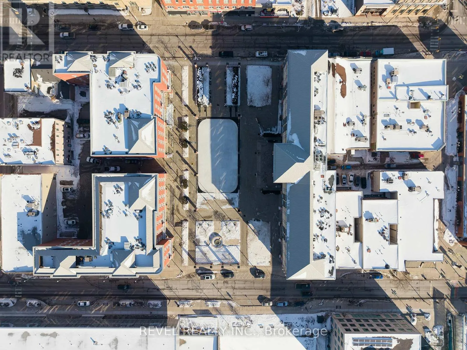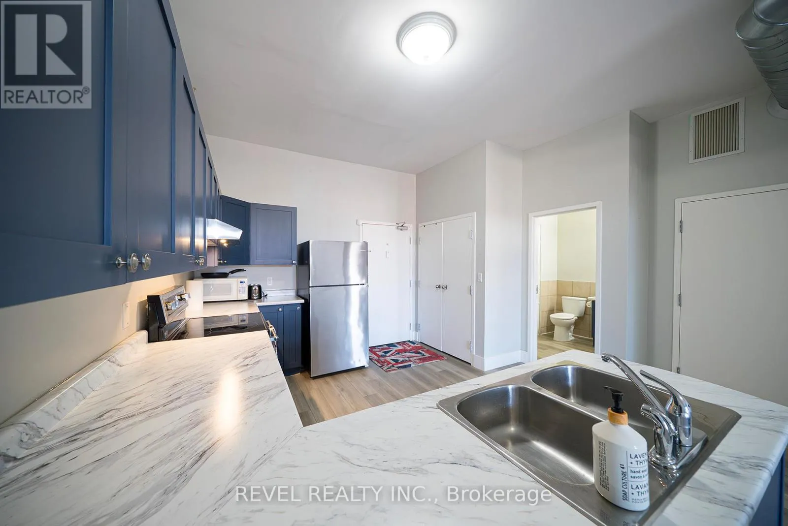 Cross Streets: Brant Avenue & Colborne Street. ** Directions: From Brant Ave, head east on Colborne Street. Building on left hand side. Located Downtown at Harmony Square. Welcome to 150 Colborne Street, Unit 407 - Downtown Brantford Living at Its Best! Step into style, comfort, and convenience with this fully renovated, loft-style 1-bedroom, 1-bathroom condo, ideally situated in the heart of downtown Brantford, directly overlooking vibrant Harmony Square. This stunning unit offers an unbeatable combination of modern living and prime location.Boasting high ceilings, a spacious private balcony, and sophisticated finishes throughout, this unit is designed to impress. The kitchen is a true showstopper, featuring rich navy cabinetry, ample storage and counter space, and stainless steel appliances - perfect for home chefs and entertainers alike. The open-concept layout seamlessly connects the kitchen, dining, and living areas, making entertaining both effortless and elegant. Step through French doors to your oversized balcony, large enough to accommodate outdoor dining or a cozy lounge setup - the perfect space to unwind while enjoying views of Harmony Square and all its seasonal events. The bright and airy bedroom is bathed in natural light thanks to a charming arched window and includes a generous closet. The updated 4-piece bathroom continues the modern aesthetic with stylish finishes and thoughtful design.Additional features include coin-operated laundry facilities conveniently located within the building, eliminating the need for off-site trips. The air conditioner was replaced in 2024. Location is everything - and this property delivers. Just steps from Wilfrid Laurier University's Brantford campus, the Conestoga College campus, and the new YMCA/Laurier Recreation Complex. With countless restaurants, cafes, shops, and year-round festivals right outside your door, you'll be at the centre of it all. Amazing opportunity to experience one of Brantford's most dynamic and walkable neighbourhoods. (id:27476)