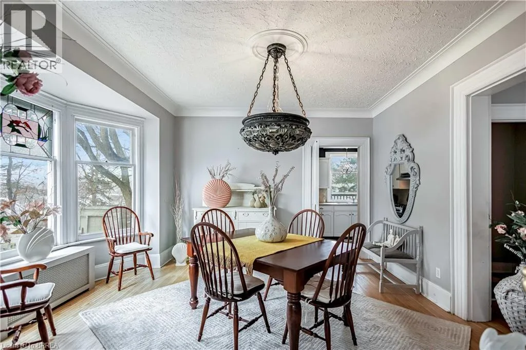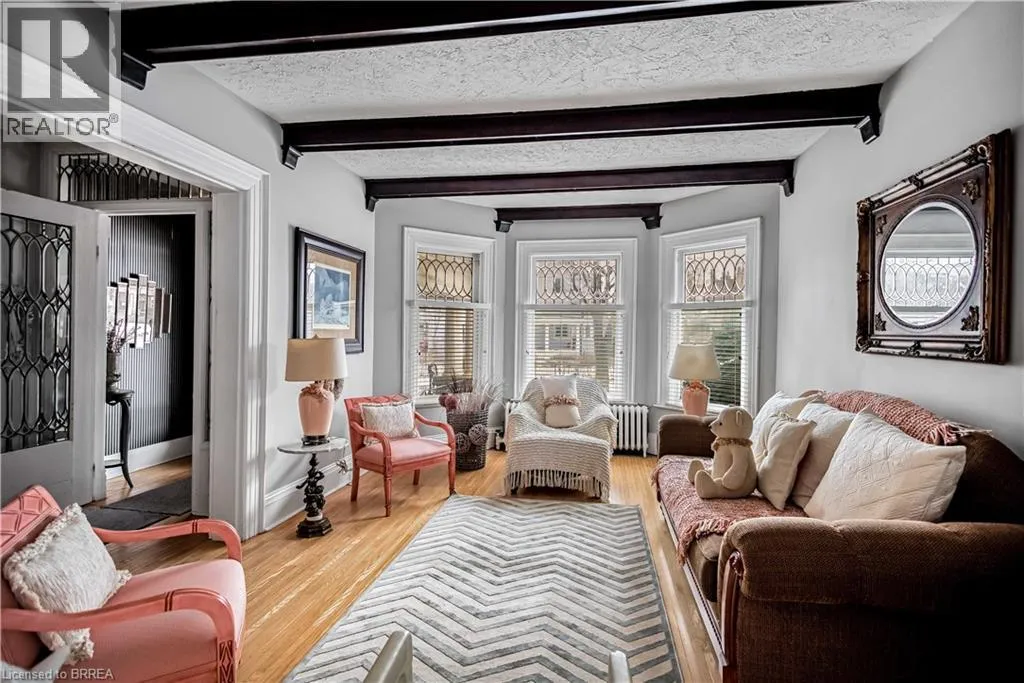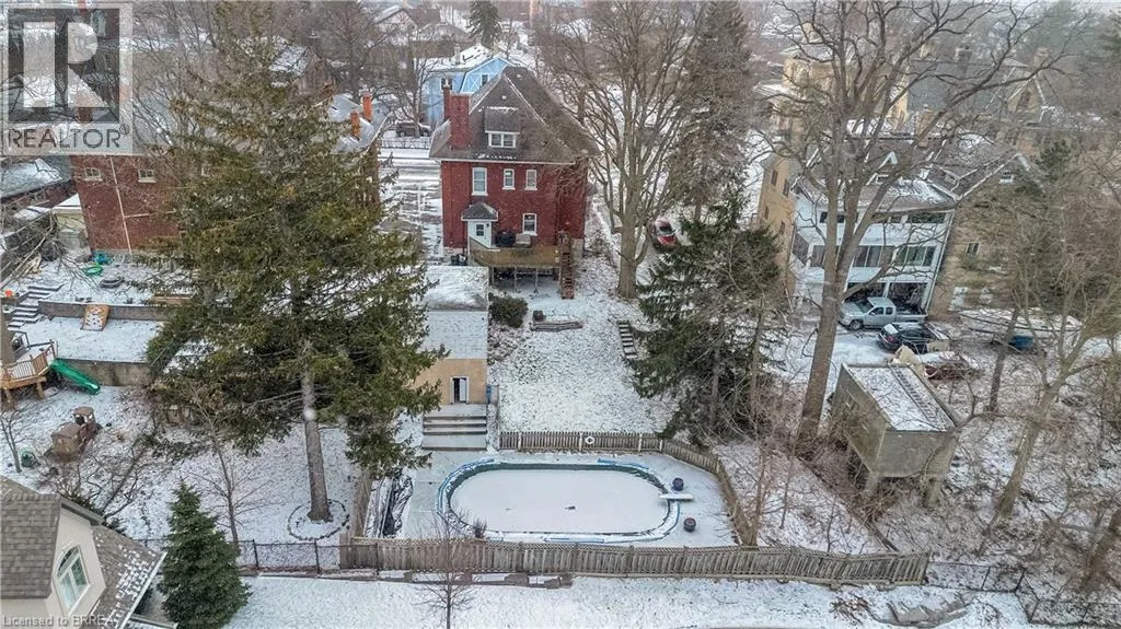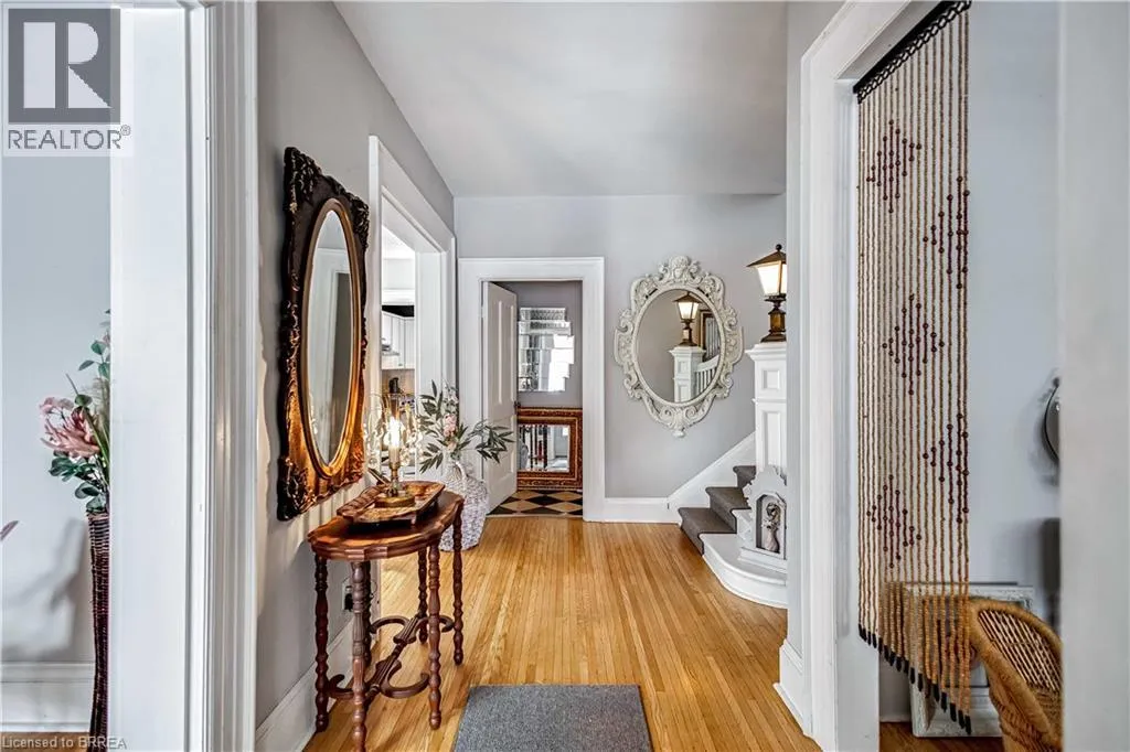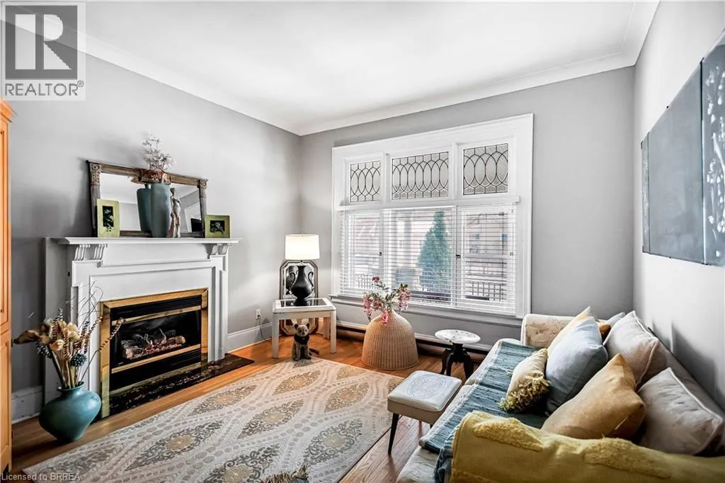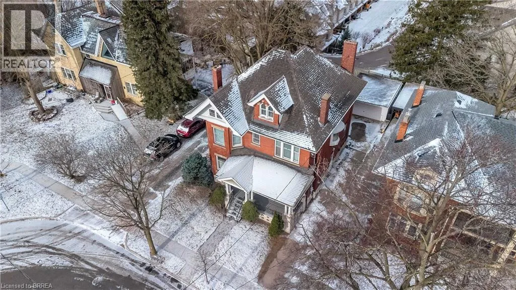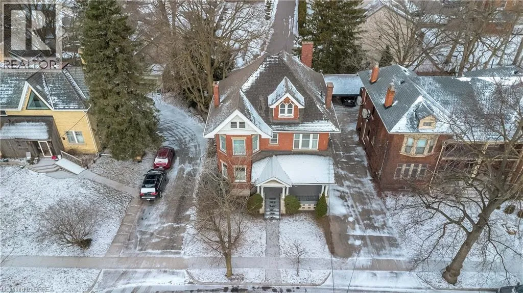South on King George Rd. which turns into St. Paul's Ave, left onto Brant Avenue and right onto Lorne Cresent. Location, location, location! Nestled in the heart of Brantfordâs historic district, this impressive Victorian-era 2½-storey home is rich in character and timeless charm. Step through stunning leaded glass doors into a spacious, inviting foyer, where youâre immediately welcomed by three interconnected principal rooms and a striking Edwardian-style staircase. With over 3,300 sq. ft. of above-grade living space, the main floor features a formal living room, cozy sitting room with gas fireplace, elegant dining room with ornate chandelier, and an eat-in kitchen overlooking the backyard. From the detailed craftsmanshipâintricate woodwork, curved and bay windowsâto soaring ceilings, cove mouldings, and gleaming hardwood floors, every inch reflects classic architectural beauty. Offering 6 bedrooms and 4 bathrooms, this home is perfectly suited for a large or growing family. The second level hosts four spacious bedrooms, a built-in wardrobe dresser linen closet, a main bath with walk-in shower and double vanity, and a primary bedroom with a 2-piece ensuite. The third level adds two additional bedrooms and a versatile entertainment spaceâperfect for kids, guests, or a home office setup. The walk-out basement provides excellent potential for an in-law suite or accessory unit and already includes a 3-piece bathroom. Notable updates include a new boiler (2021), upgraded wiring with a 200-amp breaker panel, and durable fiberglass shingles. Set on a generous 0.21-acre lot, the property features a classic detached garage, a sprawling front porch, and a rear deck overlooking the in-ground poolâideal for summer entertaining. Located in the sought-after Dufferin area, enjoy picturesque tree-lined streets just steps from parks, schools, tennis and pickleball courts, and the Brantford Golf & Country Club. (id:27476)