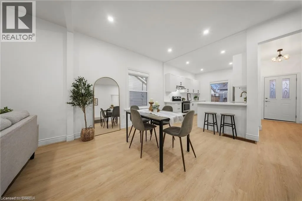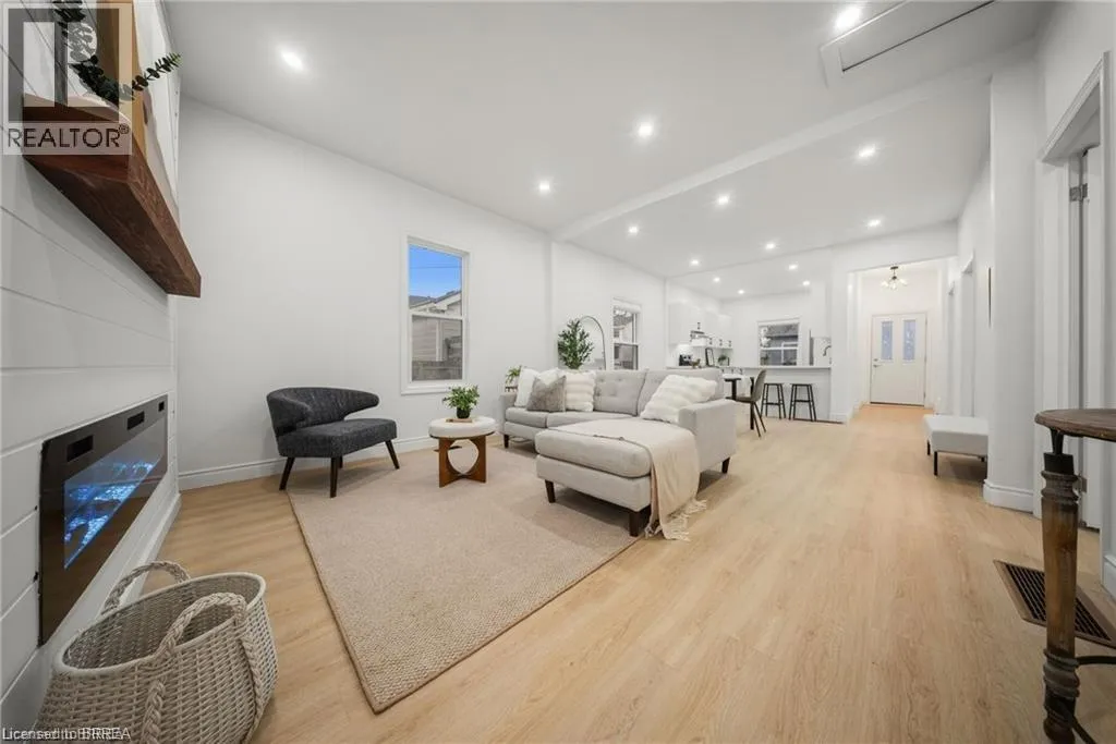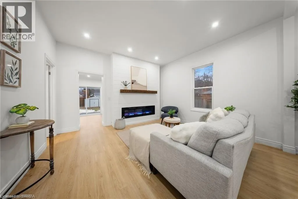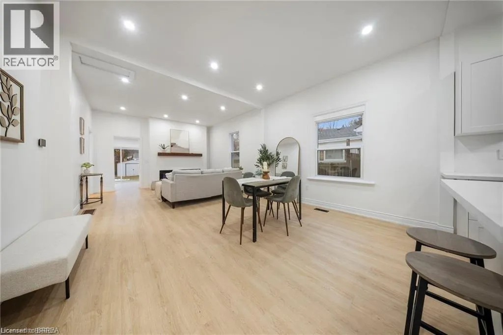 Main Street and Terrace Hill St Welcome to 8 Main Street in the City of Brantford. This spacious, fully renovated bungalow offers over 1,300 square feet of move-in-ready living space, perfect for you and your family. The home features 3 bedrooms (all with closets) and 2 bathrooms, along with a bright open-concept main floor that includes a separate dining area and a large living room highlighted by an accent wall with a built-in fireplace. The modern kitchen is equipped with quartz countertops, a breakfast peninsula, and ample cabinetry, while high ceilings and large windows create a bright and inviting atmosphere throughout. Convenient main floor laundry adds to the homeâs functionality. A second main-floor living room or rec-room offers additional space for relaxing or entertaining and features a patio door with direct access to the back deck. Recent updates include luxury vinyl plank flooring throughout, LED lighting, updated windows and doors, a 100-amp breaker panel, furnace, central air conditioning, and more. The unfinished basement offers excellent potential to add up to 1,000 square feet of additional living space, ideal for extra bedrooms, an in-law set-up, recreation space, or additional storage. Step outside to enjoy the large stamped concrete patio overlooking the expansive, private fenced backyard, perfect for entertaining on warm summer evenings. Schedule your private viewing today! (id:27476)