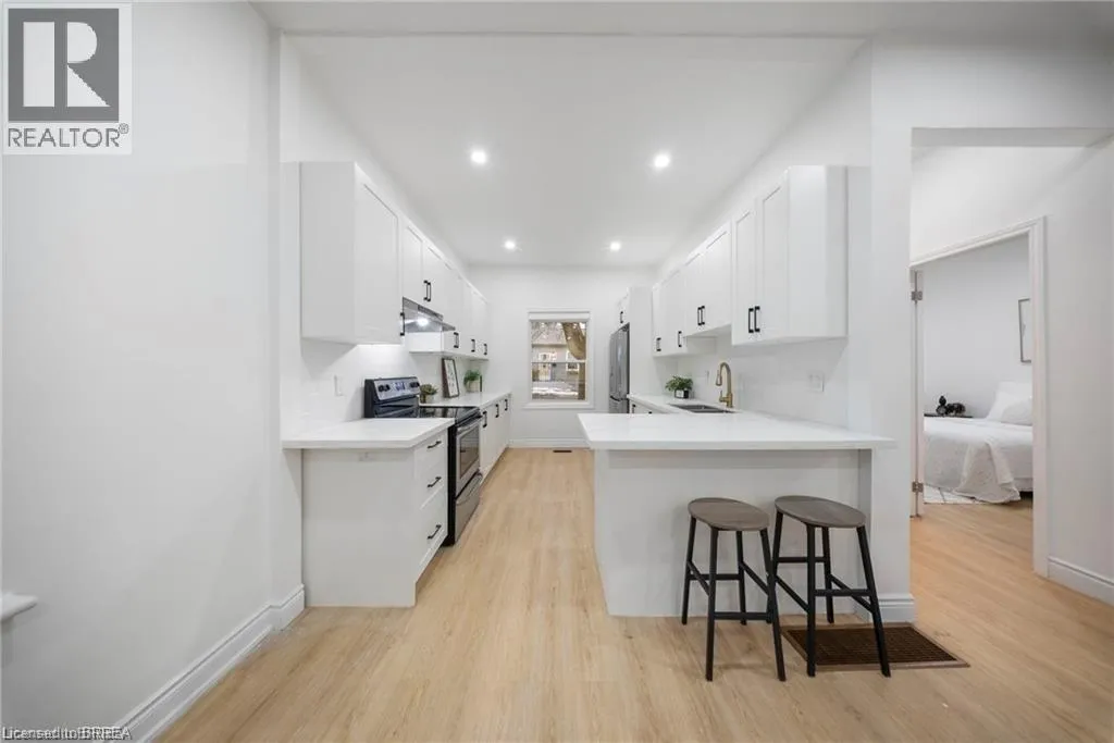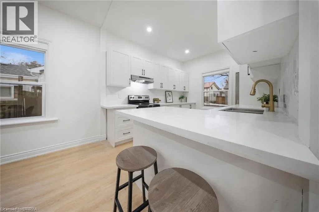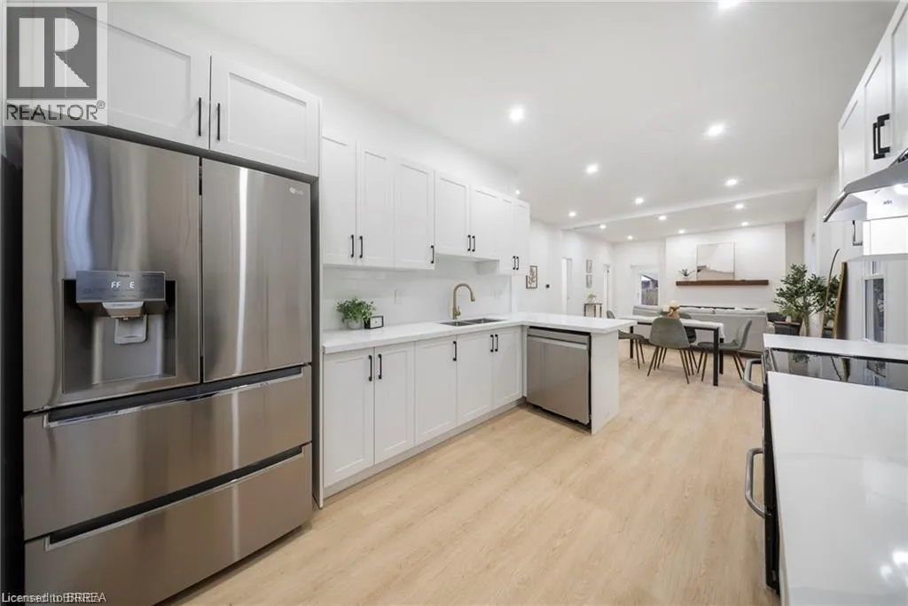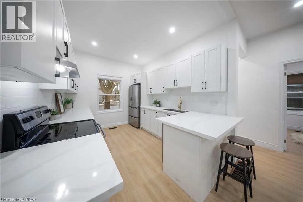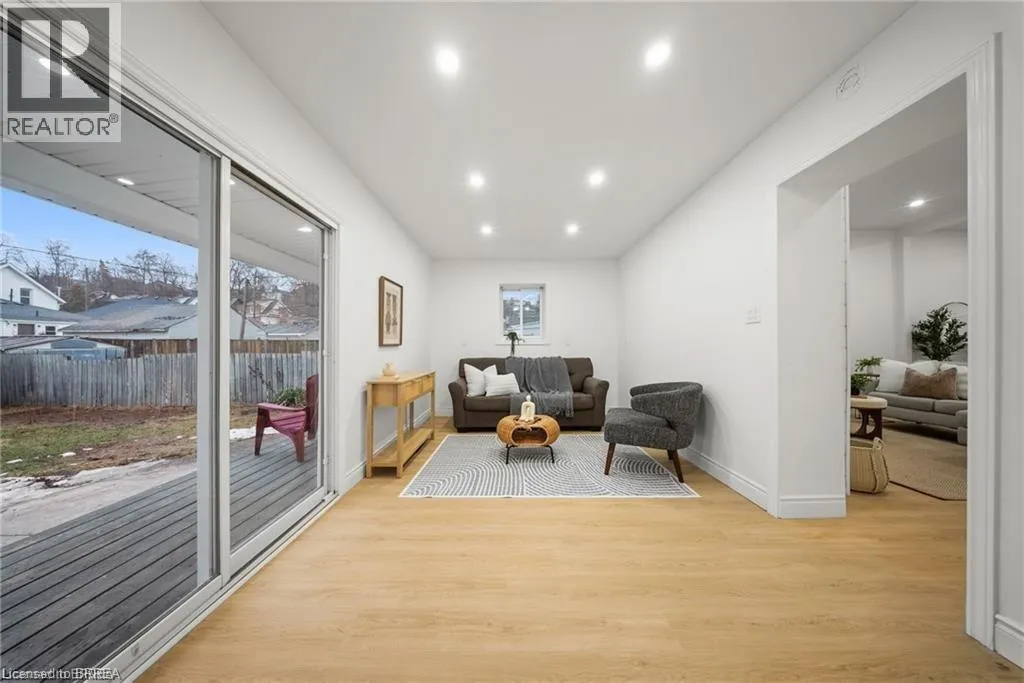 Main Street and Terrace Hill St Welcome to 8 Main Street in the City of Brantford. This spacious, fully renovated bungalow offers over 1,300 square feet of move-in-ready living space, perfect for you and your family. The home features 3 bedrooms (all with closets) and 2 bathrooms, along with a bright open-concept main floor that includes a separate dining area and a large living room highlighted by an accent wall with a built-in fireplace. The modern kitchen is equipped with quartz countertops, a breakfast peninsula, and ample cabinetry, while high ceilings and large windows create a bright and inviting atmosphere throughout. Convenient main floor laundry adds to the homeâs functionality. A second main-floor living room or rec-room offers additional space for relaxing or entertaining and features a patio door with direct access to the back deck. Recent updates include luxury vinyl plank flooring throughout, LED lighting, updated windows and doors, a 100-amp breaker panel, furnace, central air conditioning, and more. The unfinished basement offers excellent potential to add up to 1,000 square feet of additional living space, ideal for extra bedrooms, an in-law set-up, recreation space, or additional storage. Step outside to enjoy the large stamped concrete patio overlooking the expansive, private fenced backyard, perfect for entertaining on warm summer evenings. Schedule your private viewing today! (id:27476)