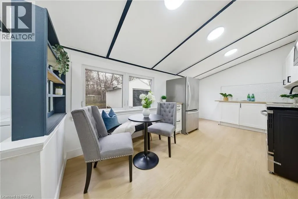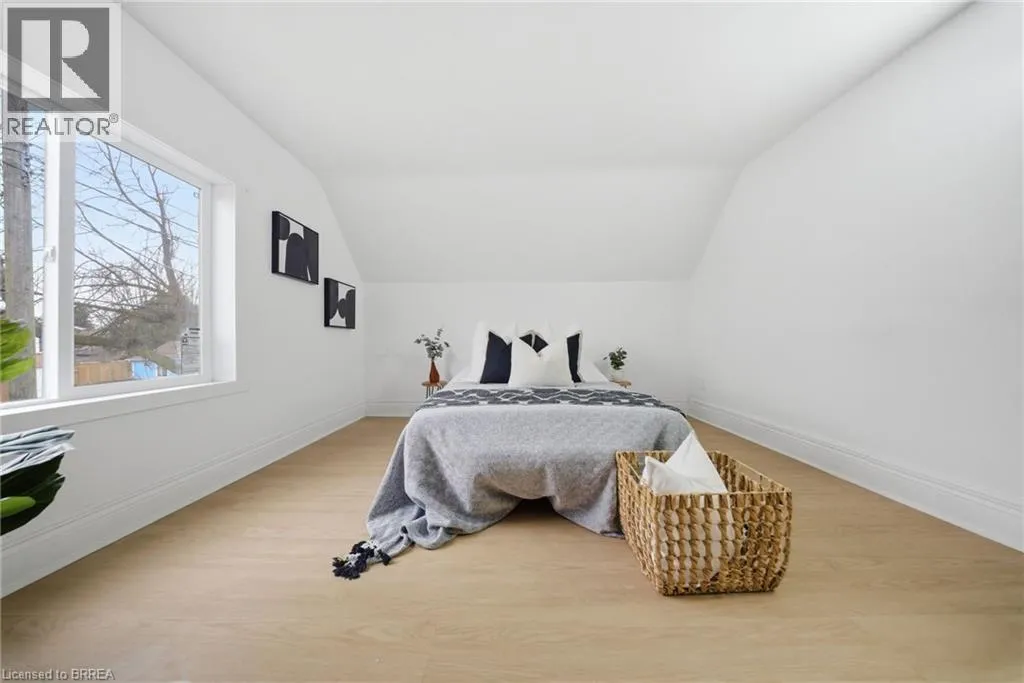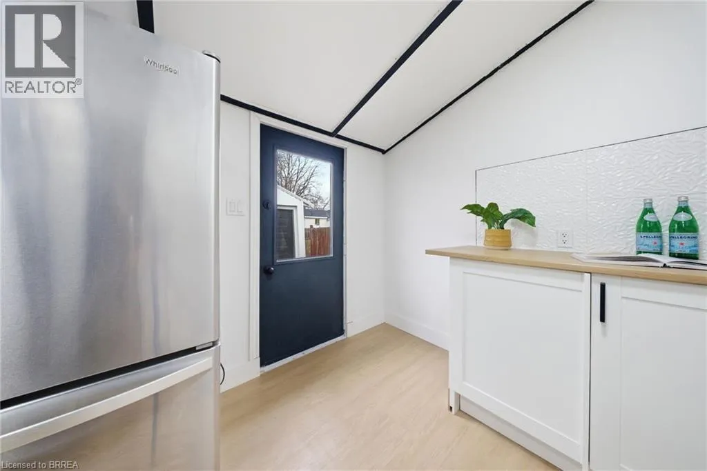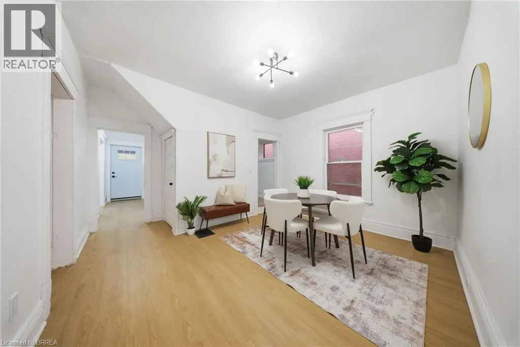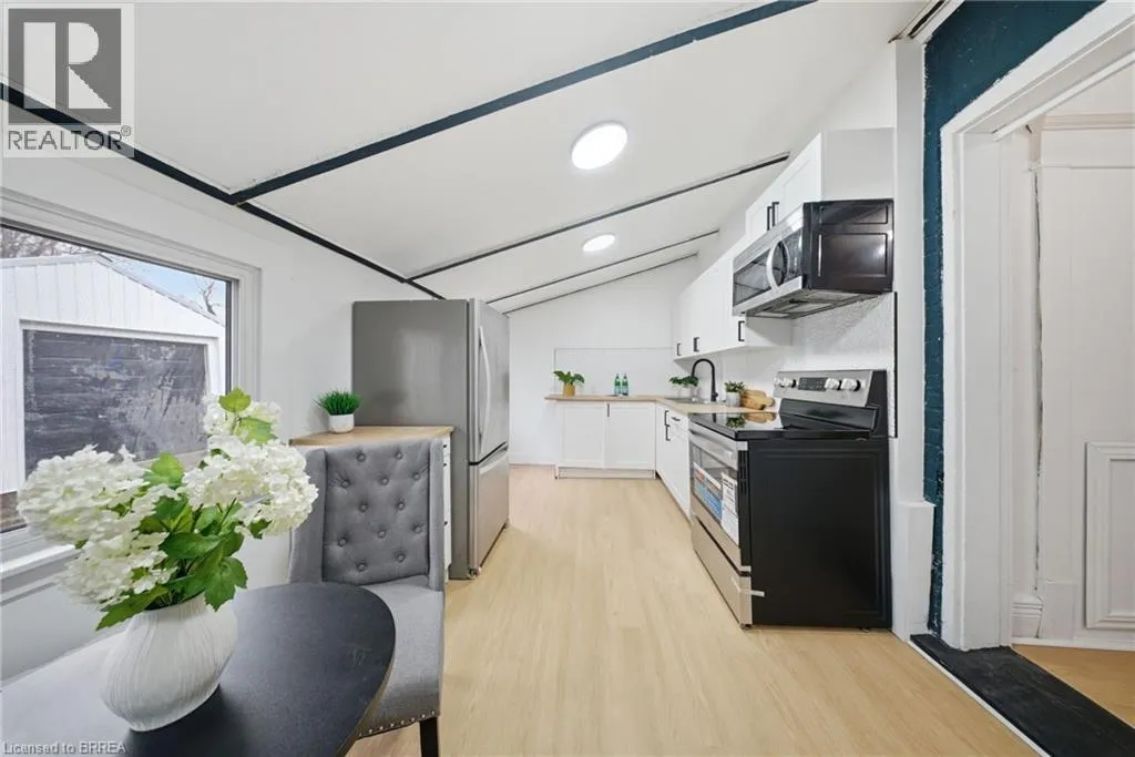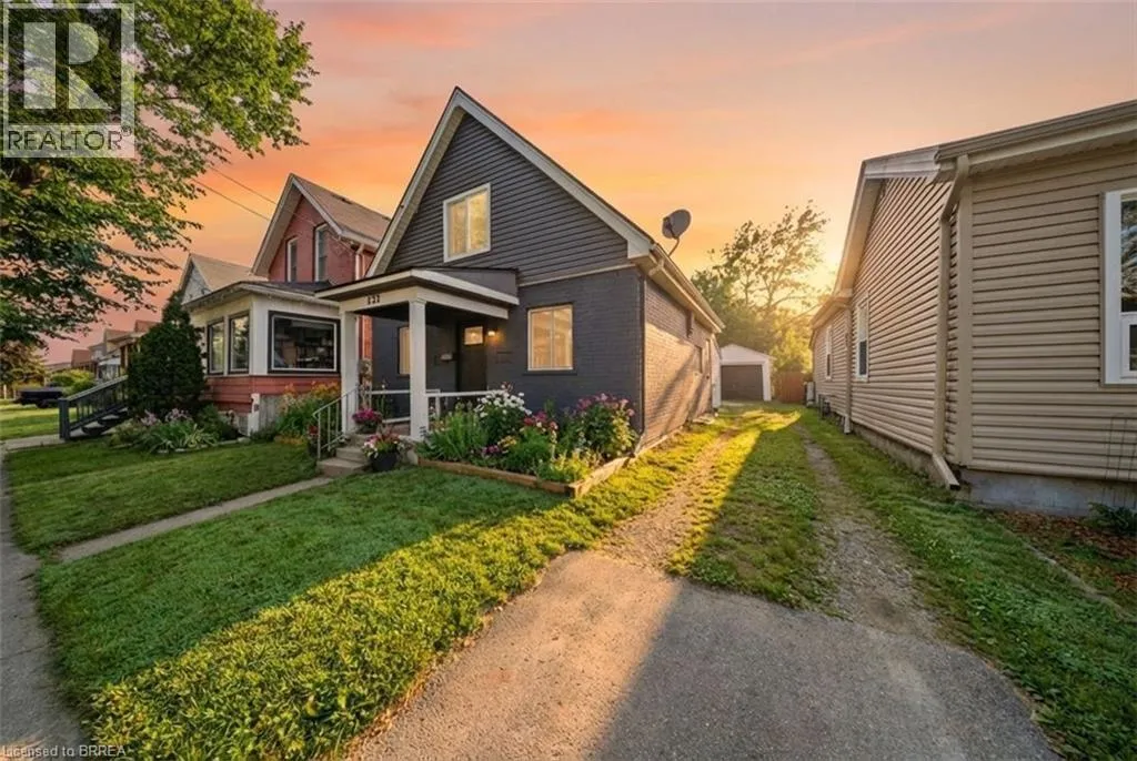 West off Rawdon East off Brock Welcome to 232 Grey Street, a beautifully remodeled 1.5 storey home in the heart of Brantford that perfectly blends charm and modern updates. With fresh paint and brand-new flooring throughout, this inviting home offers a bright and refreshed living space that is ready for you to move in and enjoy. As you enter the home, you are greeted by a spacious foyer featuring attractive wall paneling that adds warmth and character. Just off the entryway is a convenient main-floor bedroom along with a newly updated 3-piece bathroom, creating an ideal setup for guests or those seeking the convenience of one-floor living. The bright and welcoming living room features large windows that allow natural light to pour in, creating a comfortable space to relax and unwind. The dining area provides ample room for larger family gatherings and flows seamlessly into the beautifully updated eat-in kitchen. The kitchen is sure to impress with its loft-style ceiling, recessed lighting, stylish backsplash, brand-new stainless steel appliances, and plenty of workspace, while offering direct access to the backyard for easy indoor-outdoor living. Upstairs you will find two generously sized bedrooms along with an additional 3-piece bathroom, providing a comfortable space for all family members. The fully fenced backyard offers privacy and plenty of room for outdoor enjoyment, gardening, or entertaining. A large detached garage provides excellent storage or workspace possibilities. This home has seen many important updates, including a newer roof on the main house (2025) with the addition roof completed a few years prior, updated vinyl siding, soffits, fascia, and eavestroughs, a 100-amp breaker panel, and a newer furnace. The basement plumbing has also been updated and properly tied into the main line, providing added peace of mind. Conveniently located close to all amenities, this charming and extensively updated home offers comfort, functionality, and value in a great Brantford location. (id:27476)