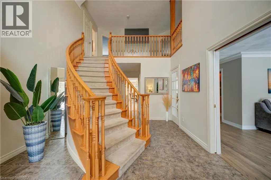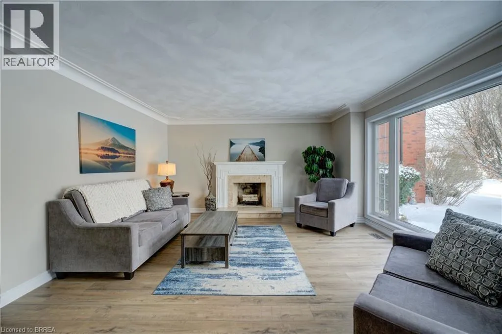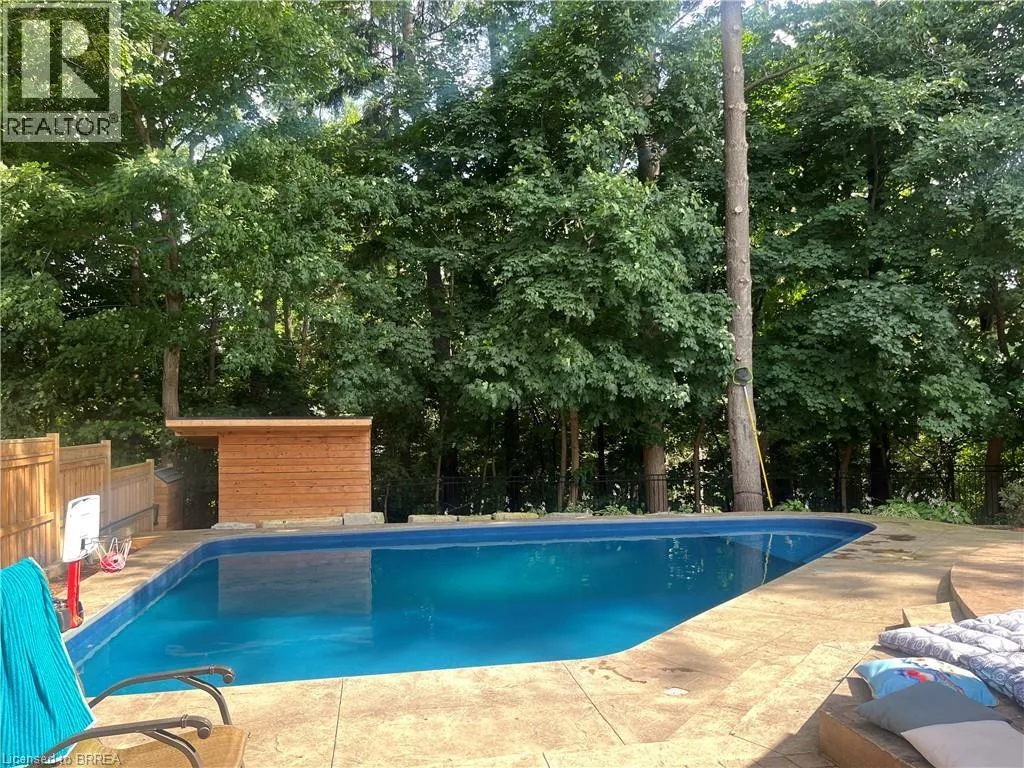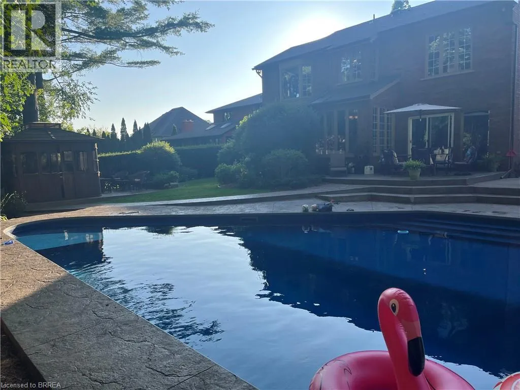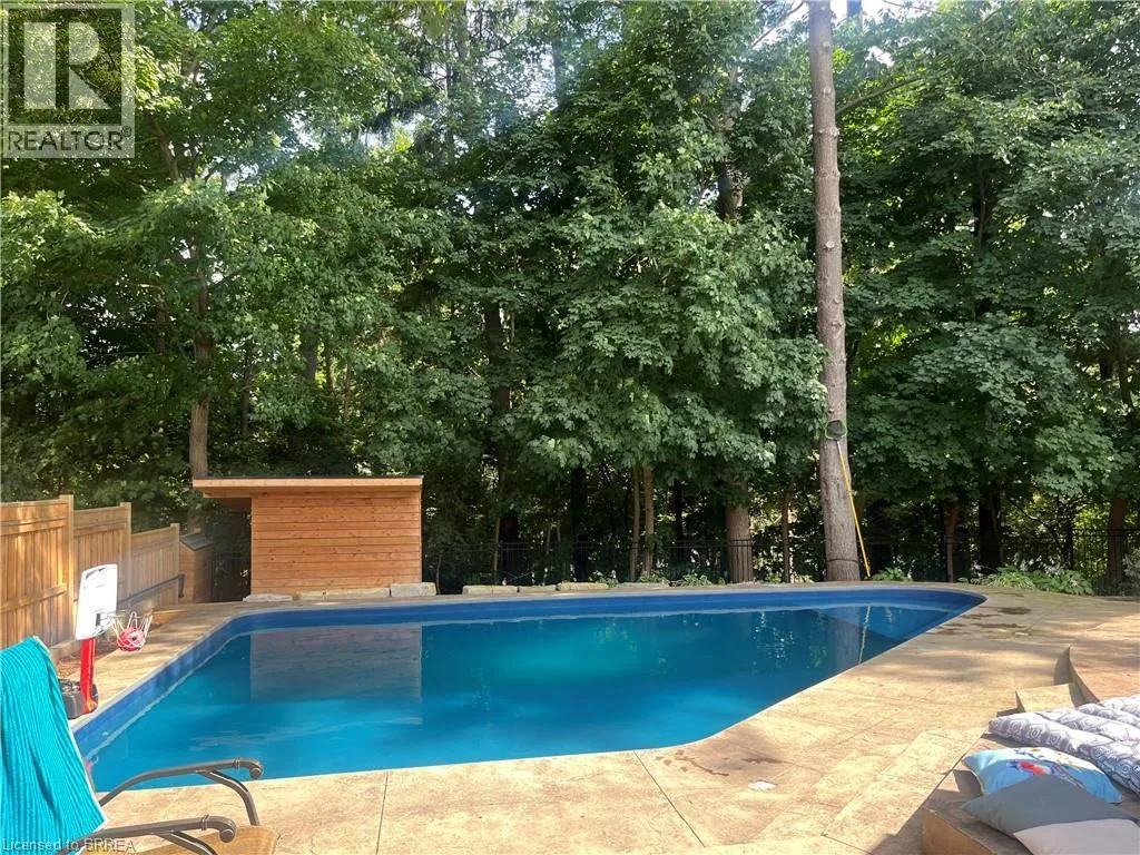 Ava Rd. and Scarfe Gardens Prestigious Court location close to Brantford Golf and Country Club. Private ravine lot with newer inground pool. Grand entranceway with spiral staircase and vaulted ceilings. Front sitting room with large window and natural wood fireplace. Main floor office with beautiful wood inlays and built-in shelves and cabinets. Large formal dining room with bay window overlooking rear wooded area. Newly renovated kitchen, eat-in area with three walls of windows overlooking inground pool. Sunken main floor family room with natural wood fireplace. Beautiful main floor, laundry room with built-in overhead cabinets and lowers. Upper level: Four spacious bedrooms. Large primary suite with bay window overlooking ravine, recently renovated 4pc bathroom with jet, soaker tub, and glass shower, his and her sinks and walk-in closet. Second level: 4pc bathroom recently renovated. Large renovated bright lower level. Rec room with gas fireplace and pool table area, separate home gym and three-piece bathroom. Fully fenced rear yard with newer, inground pool 2023, hot tub with gazebo and stamped concrete; all overlooking picturesque private wooded ravine. (id:27476)