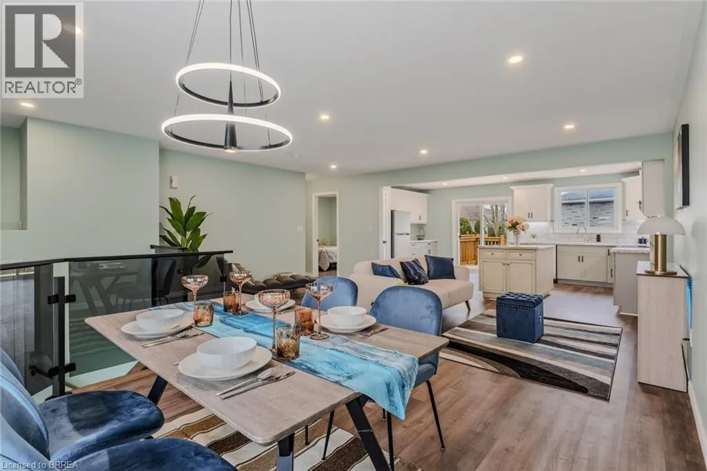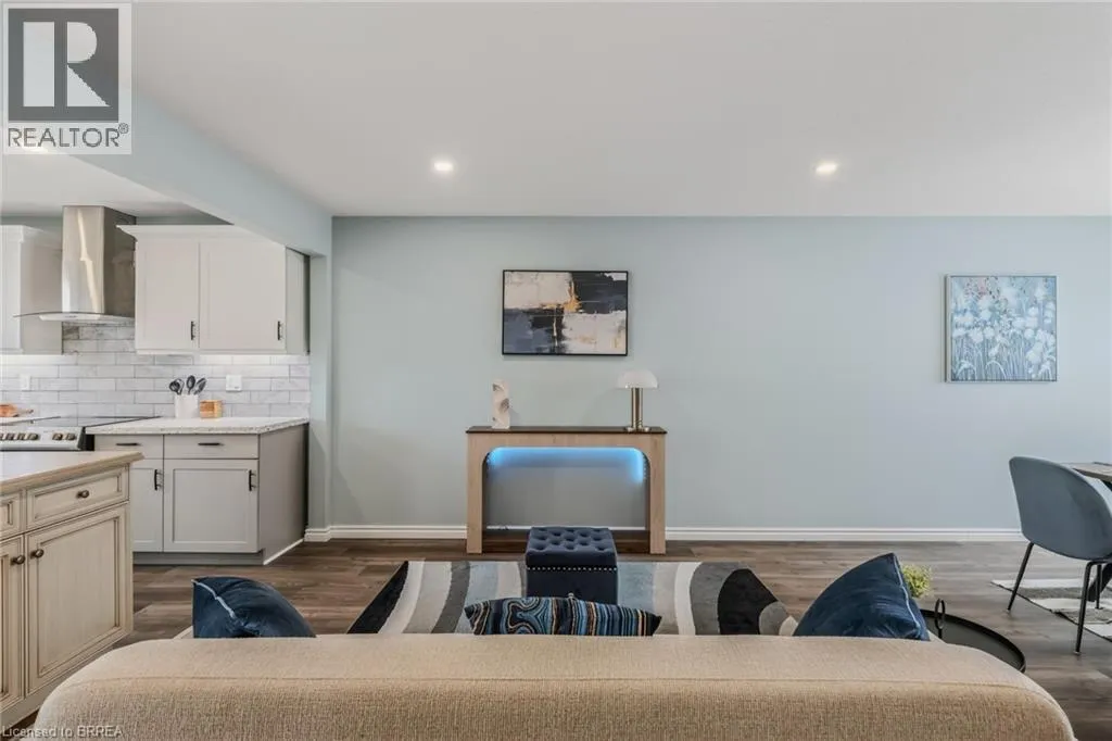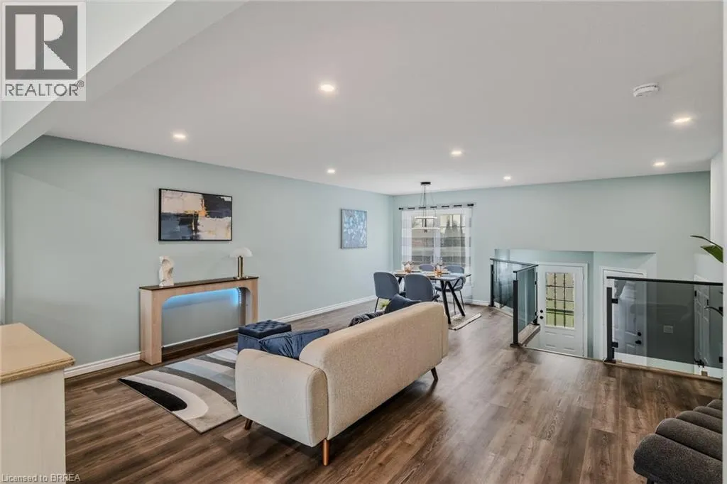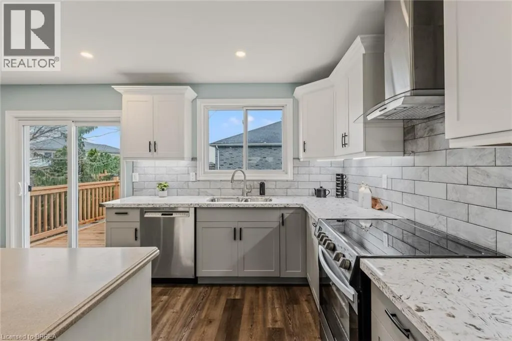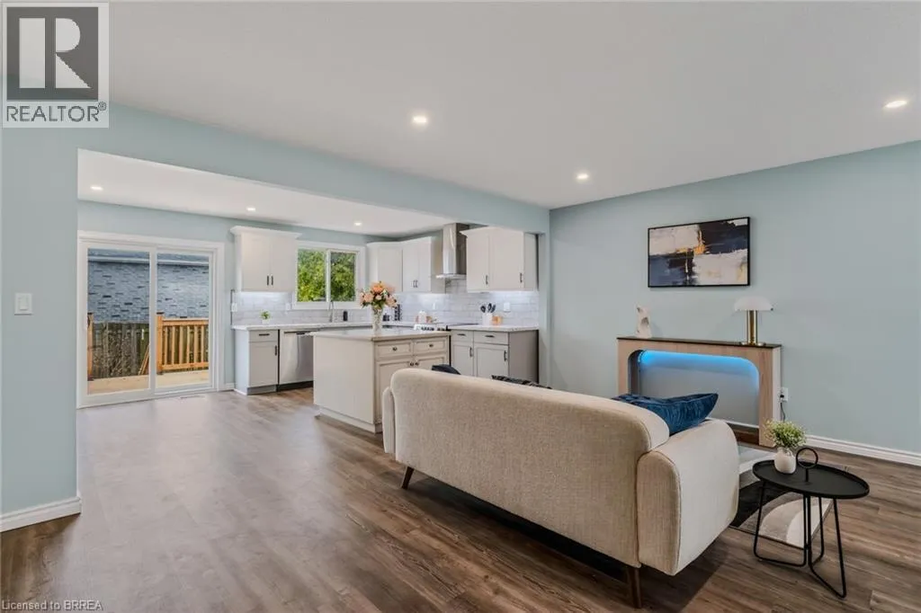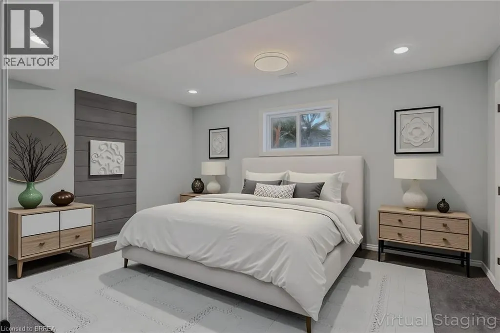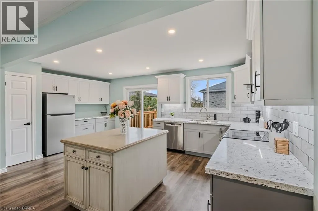 South on Rest Acres Rd, left on Robinson Rd. Fully renovated brick raised bungalow in sought-after West Brant! This move-in ready home offers 2+2 bedrooms, 2 full bathrooms, and a double car attached garage, all set on a fully fenced backyardâperfect for families and entertaining. Step inside to a bright, welcoming foyer that leads into a spacious open-concept living and dining area, ideal for both everyday living and hosting guests. The stunning modern kitchen features a large island, sleek finishes, and a sliding door walkout to the backyard and brand-new deckâperfect for summer gatherings. The main level also includes two well-sized bedrooms and a beautifully updated 4-piece bathroom. The fully finished basement expands your living space with a generous recreation room, two additional bedrooms, another 4-piece bathroom, and a utility room with laundryâoffering flexibility for guests, a home office, or growing families. This home has been thoughtfully updated throughout, including new flooring and carpets, fresh paint from top to bottom, a brand-new kitchen and bathrooms, stylish glass railing on the stairs, and a newly built back deck. Located in a family-friendly neighbourhood close to schools, shopping, trails, and all the amenities Brantford has to offer, this is a fantastic opportunity you donât want to miss. Some images include virtual staging. (id:27476)