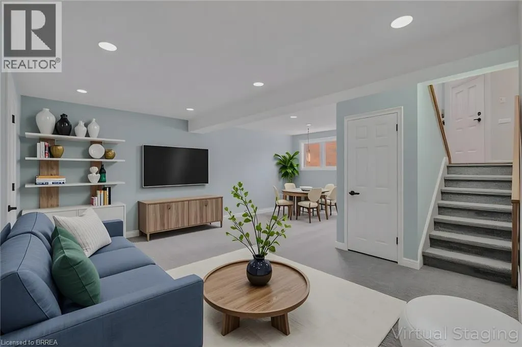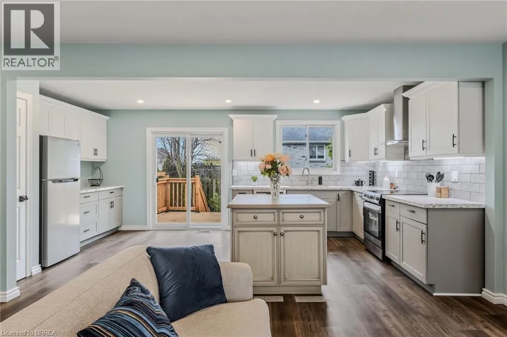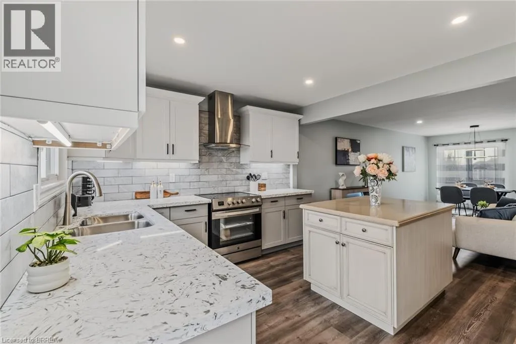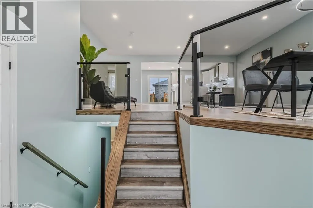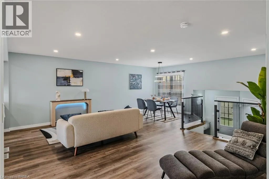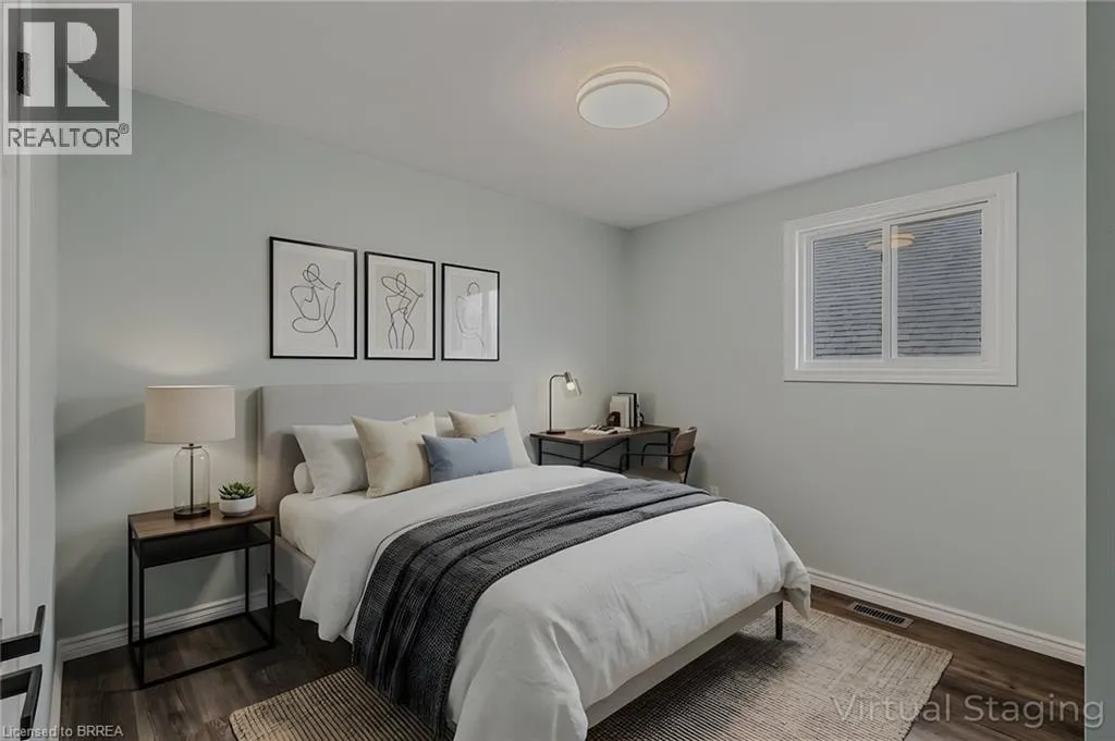 South on Rest Acres Rd, left on Robinson Rd. Fully renovated brick raised bungalow in sought-after West Brant! This move-in ready home offers 2+2 bedrooms, 2 full bathrooms, and a double car attached garage, all set on a fully fenced backyardâperfect for families and entertaining. Step inside to a bright, welcoming foyer that leads into a spacious open-concept living and dining area, ideal for both everyday living and hosting guests. The stunning modern kitchen features a large island, sleek finishes, and a sliding door walkout to the backyard and brand-new deckâperfect for summer gatherings. The main level also includes two well-sized bedrooms and a beautifully updated 4-piece bathroom. The fully finished basement expands your living space with a generous recreation room, two additional bedrooms, another 4-piece bathroom, and a utility room with laundryâoffering flexibility for guests, a home office, or growing families. This home has been thoughtfully updated throughout, including new flooring and carpets, fresh paint from top to bottom, a brand-new kitchen and bathrooms, stylish glass railing on the stairs, and a newly built back deck. Located in a family-friendly neighbourhood close to schools, shopping, trails, and all the amenities Brantford has to offer, this is a fantastic opportunity you donât want to miss. Some images include virtual staging. (id:27476)