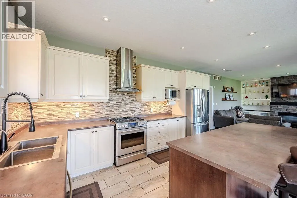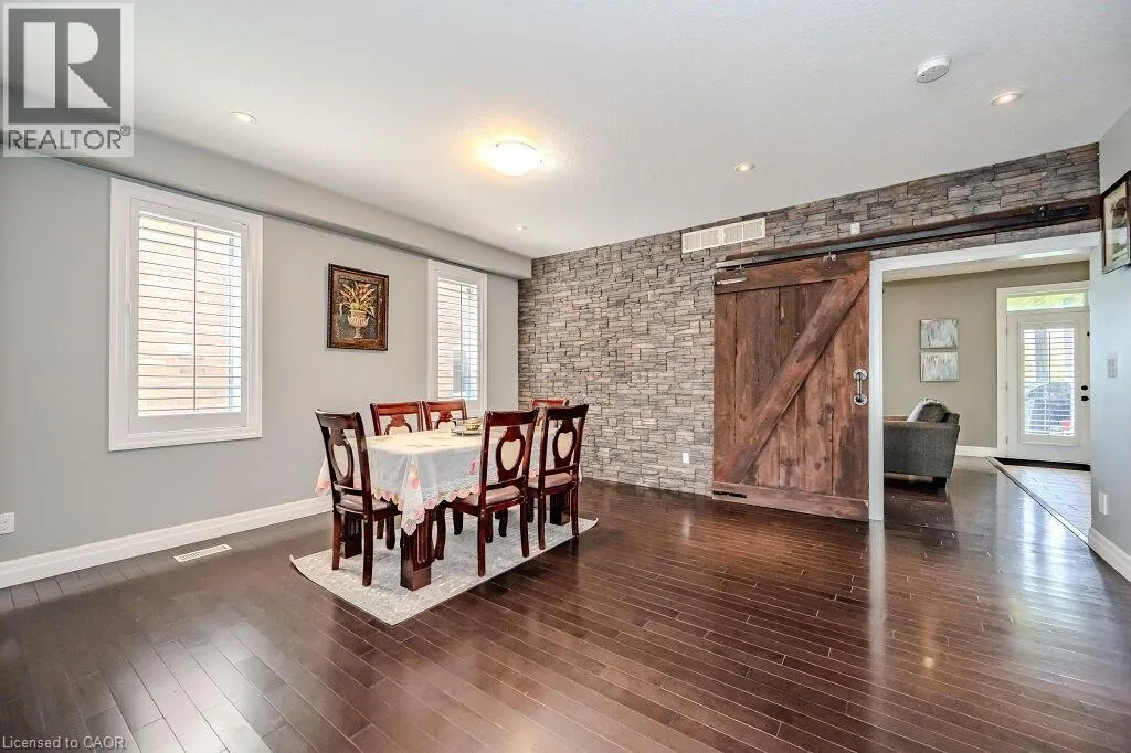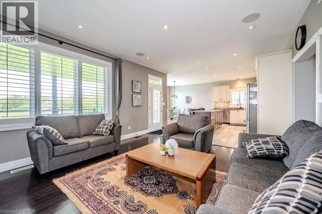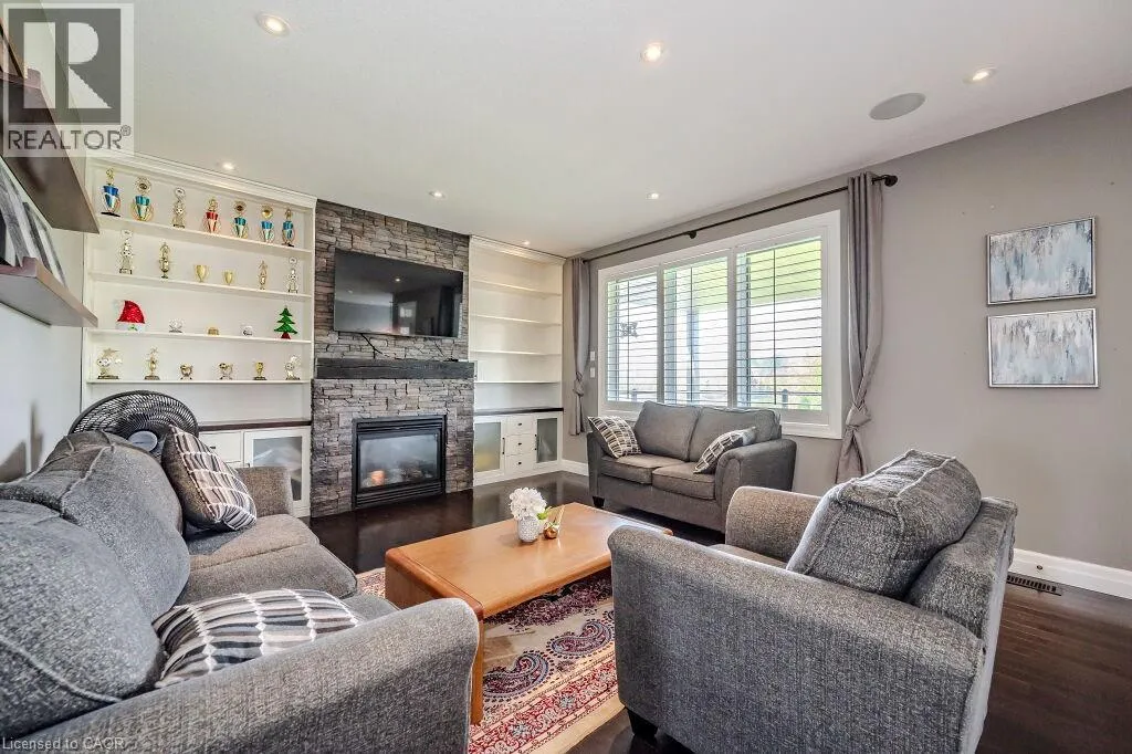 Woolwich Street S to Dolman St Stunning 5-Bedroom Retreat on Rare 267' Deep Lot! Discover your perfect sanctuary in this breathtaking 5-bedroom, 4-bathroom home, nestled on a premium 267-foot deep, fully fenced lot backing onto a serene conservation area for ultimate privacy. This residence radiates curb appeal with its striking exterior and pristine landscaping. Step inside to find luxurious finishes, including a warm gas fireplace, elegant stone walls, soaring ceilings, pot lights, rustic barn wood accents, and a surround sound system in the fully finished basement. The chefâs kitchen dazzles with abundant cabinetry and counter space, seamlessly flowing into the open-concept dining and living areas. A custom mudroom offers stylish storage solutions. The bright lookout basement, illuminated by large windows, is perfect for relaxation or entertaining. Outdoors, a full-width covered deck with a hot tub creates an ideal setting for year-round enjoyment. Located steps from Breslau P.S., Hwy 7, the expressway, and Hwy 401, this home blends tranquility, luxury, and convenience. Donât miss your chance to own this extraordinary forever home! (id:27476)