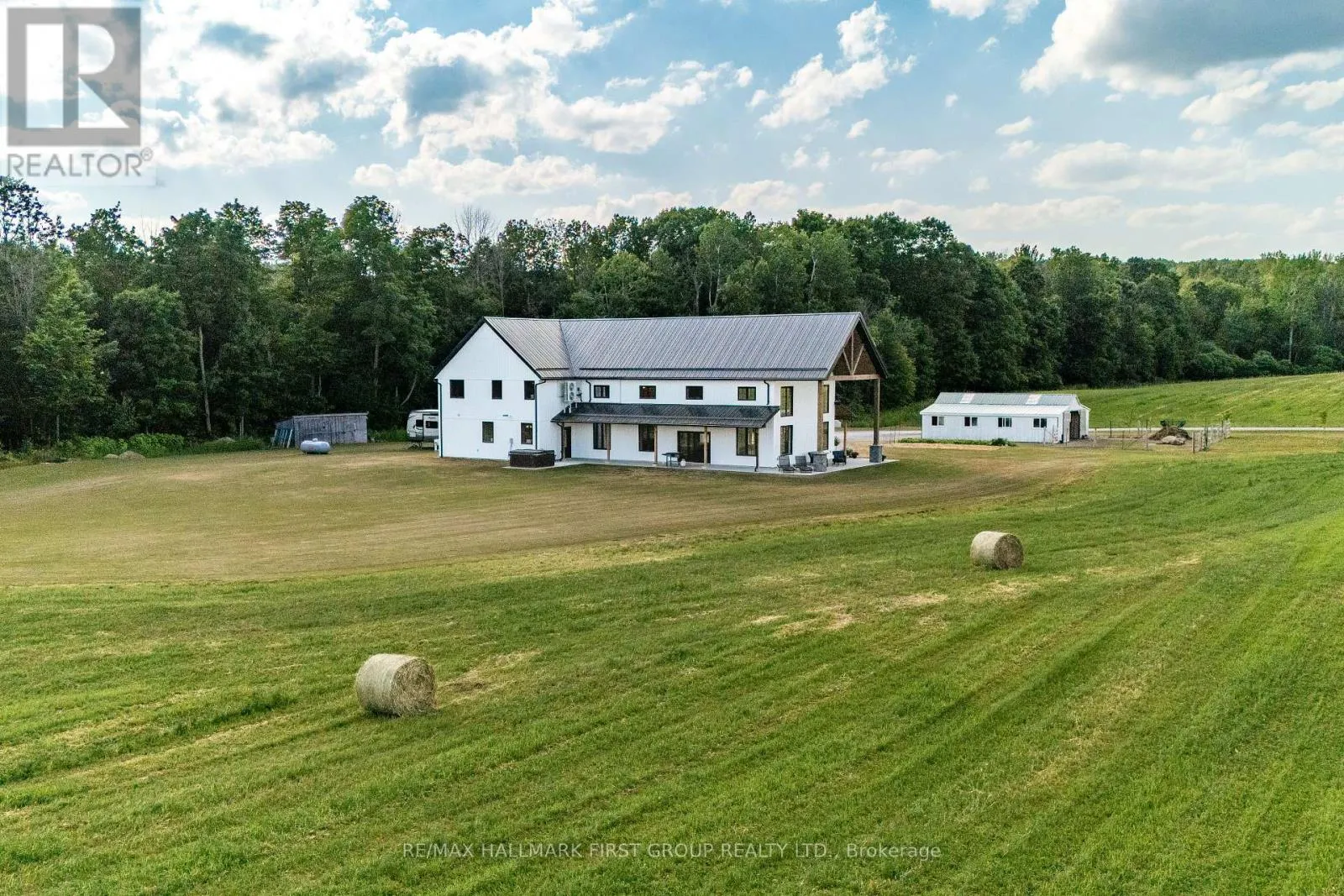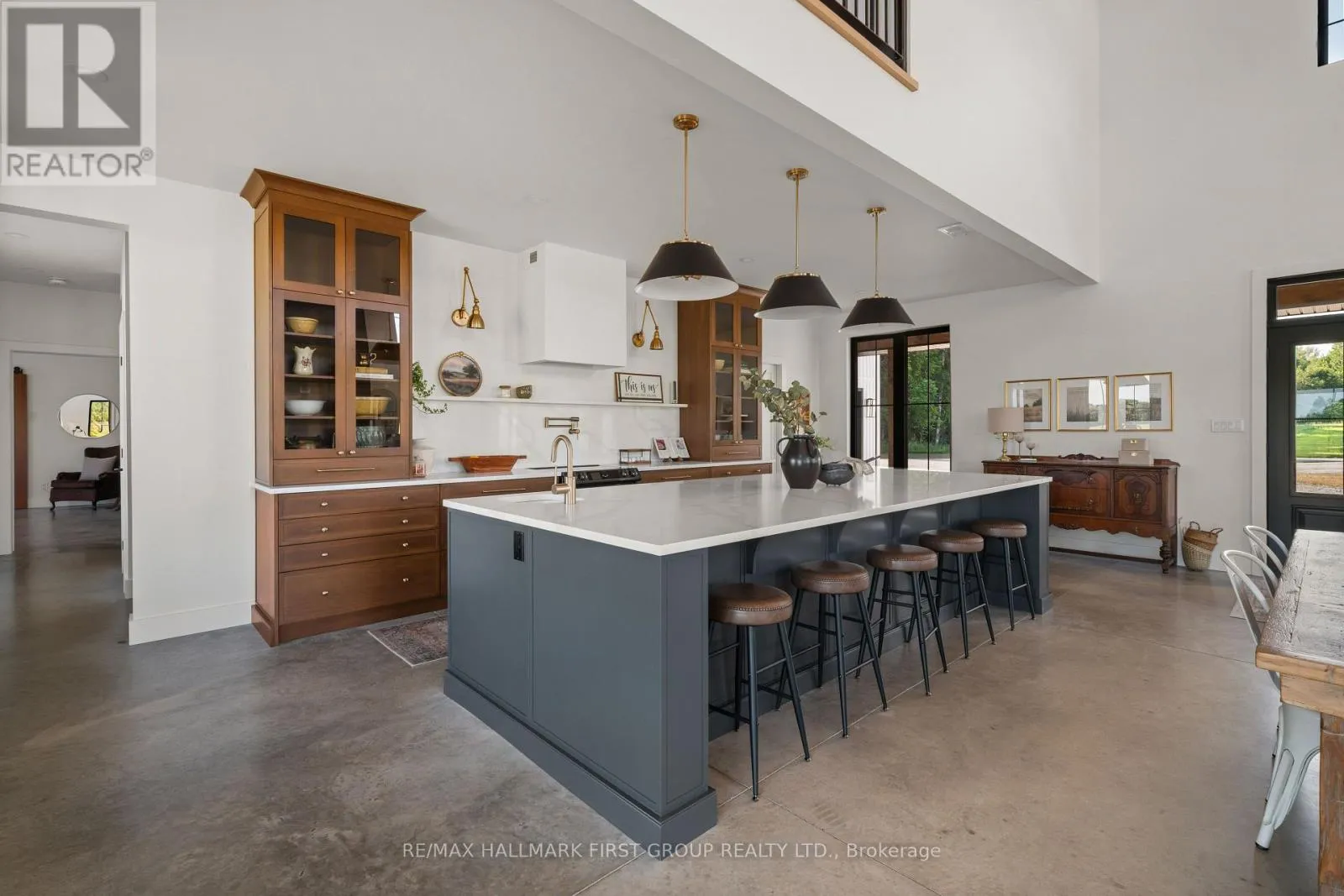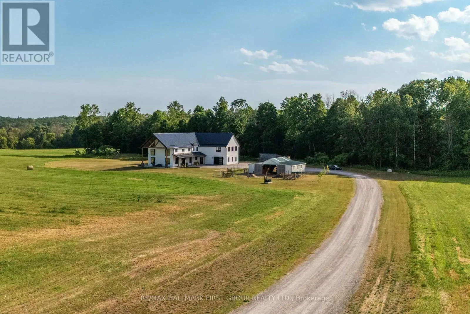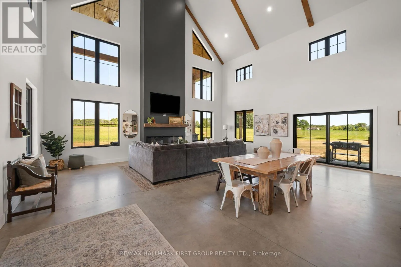 Telephone Road & Scriver Road A rare opportunity where timeless elegance meets luxurious country living on 63.16 acres! Whether you're searching for a hobby-farm, hay farm or a chance to unwind in luxury, this 2023 custom-built, architectural masterpiece offers over 5,300 sqft of magazine worthy living space. In 5 beds, 4 baths and upper level, in-law suite potential you will appreciate the bold design coupled with modern comfort. Soaring 26ft ceilings & beam detail in the living room welcome you to the open concept living space where heated, polished concrete floors run throughout. The custom kitchen overlooks both the dining area and living room, offers stunning views of the landscape and features quartz counters & back splash, premium pot drawers, glass cabinetry, pot filler, full appliance package & 14ft centre island. Tucked behind is the secondary prep-kitchen which dreams are made of! Catering to a large family, you will appreciate the expansive laundry room, mud room w/ inside entry to the 2+ car garage w/ drive through door, heated flooring & hot/cold water service, as well as the spacious primary suite complete with a walkout to the stamped concrete, covered porch, a 5pc. ensuite which includes a soaker tub & glass walk-in shower as well as a walk-in closet featuring natural light. On the upper level, a massive bonus room offers versatile space for a theatre, home gym, private retreat, or in-law suite (2nd stairs can be added & septic is rated for it) in addition to the 3 bedrooms and 2 full bathrooms on this level! As an added bonus, the 7-stall horse barn is perfect for equestrian lovers or hobby farmers. Whether you're enjoying panoramic views and sunsets in peaceful solitude or hosting guests in open, light-filled spaces, this is truly one-of-a-kind!! Located just minutes from golf courses, 401 access, and essential amenities, it's more than a home, it's a lifestyle unlike any other. Extras: hydrounic heating system, constant pressure well pump & electrical r/i for generator. (id:27476)