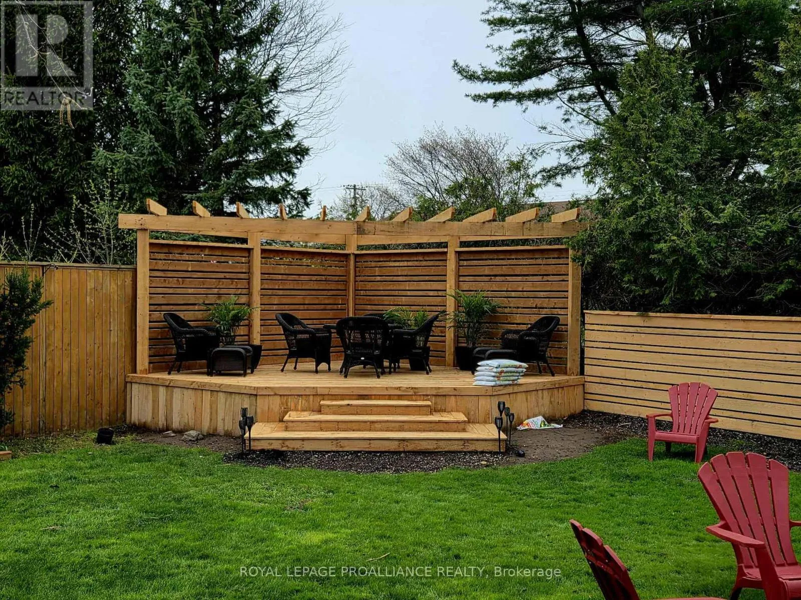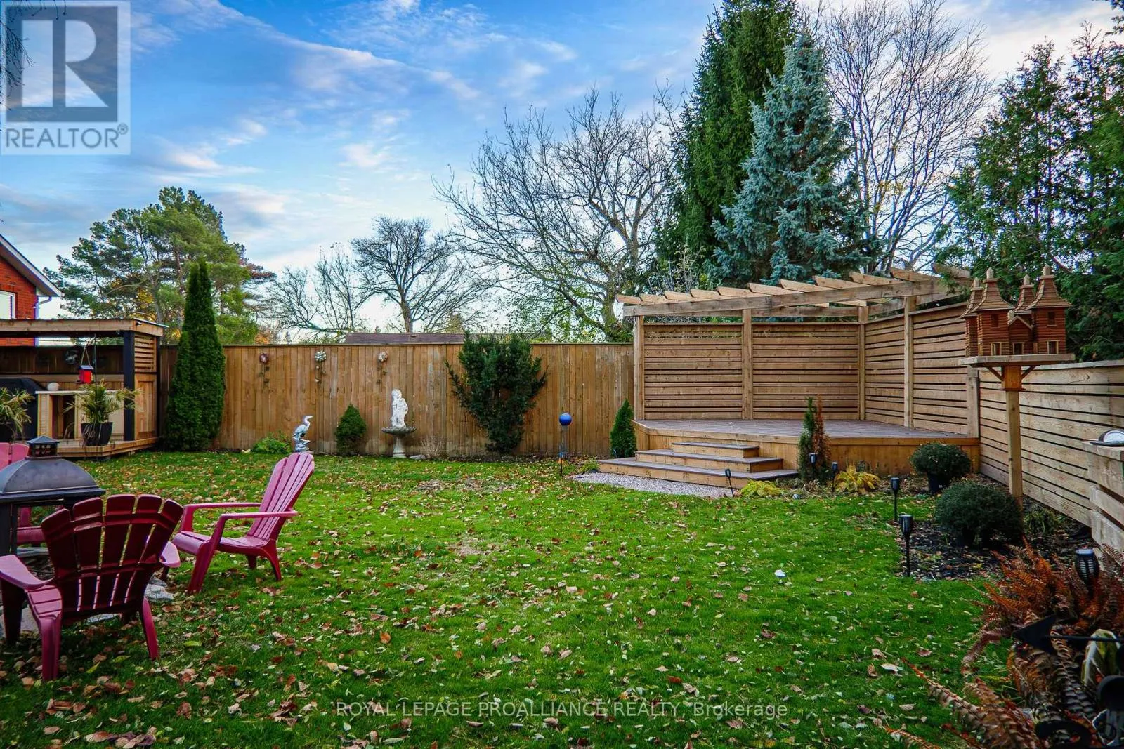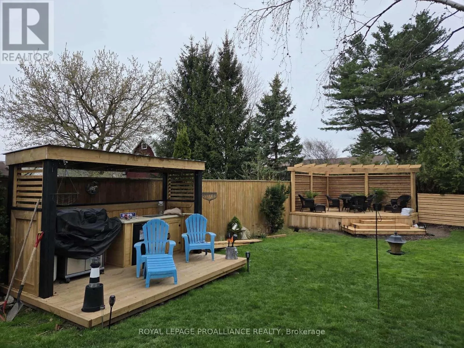 Cross Streets: Dundas Street and Daniels Drive. ** Directions: Elizabeth Street to Terry Fox Drive to Dundas Street to Daniels Drive. Arguably one of the best streets in Brighton. Beautiful collection of homes on quiet cul-de-sac, moments to downtown & amenities. Short walk to: grocery, schools, rec centre, Proctor Park & downtown core. Gorgeous oversize lot is one of the highlights of this special home. Fully fenced, pie-shaped lot measures 133ft deep with a spectacular backyard oasis offering various sitting & entertaining areas. Out the back door is the first deck with gazebo area & outdoor lighting. Towards the middle of yard is a bar area on deck with metal roof, featuring a BBQ area, bar fridge & quartz counter. Towards the back corner is a lovely raised seating area with pergola, perfect for entertaining & taking in gorgeous sunsets. Rounding out the features is a newer garden shed & firepit area. Private lot with mature birch & pine trees & 8ft fencing on each side between neighbours. Enter this Colorado-style bungalow through a large foyer with both garage & backyard access. Up a few stairs is the main living area boasting over 1300sqft as well as 2 bdrms. Gorgeous open concept living & dining areas with newer laminate flooring, large front facing windows & semi-vault ceiling in the dining rm. Eat-in kitchen has been updated with new cabinet doors, new counters, tile backsplash (2024), as well as newer stainless steel appliances & reverse osmosis. Also on main lvl is a laundry rm with sink plus 2 bdrms incl. primary with cheater access to 4pc. bath. Fully finished lower lvl maximizes the space offering an additional 2 bdrms (for a total of 4), 2nd bath (3pc.), spacious rec rm, storage rm, utility rm & a bar/lounge area for watching sports or gatherings with friends. Layout & proximity to plumbing make this space ideal for a 2nd kitchen, offering in-law suite potential. Other features in 2024 incl: gas furnace, heat pump/air con, hot water on demand & water softener. Outside provides paved parking for 6 cars, attached single garage & roof-mounted solar array providing additional income. (id:27476)