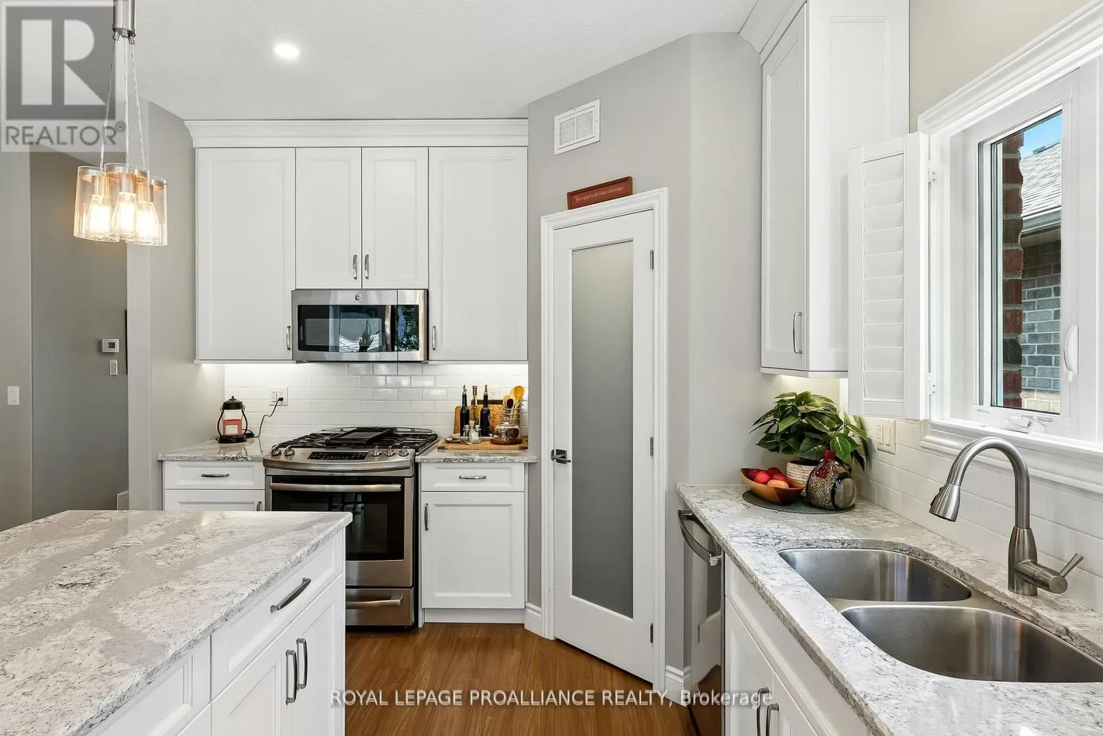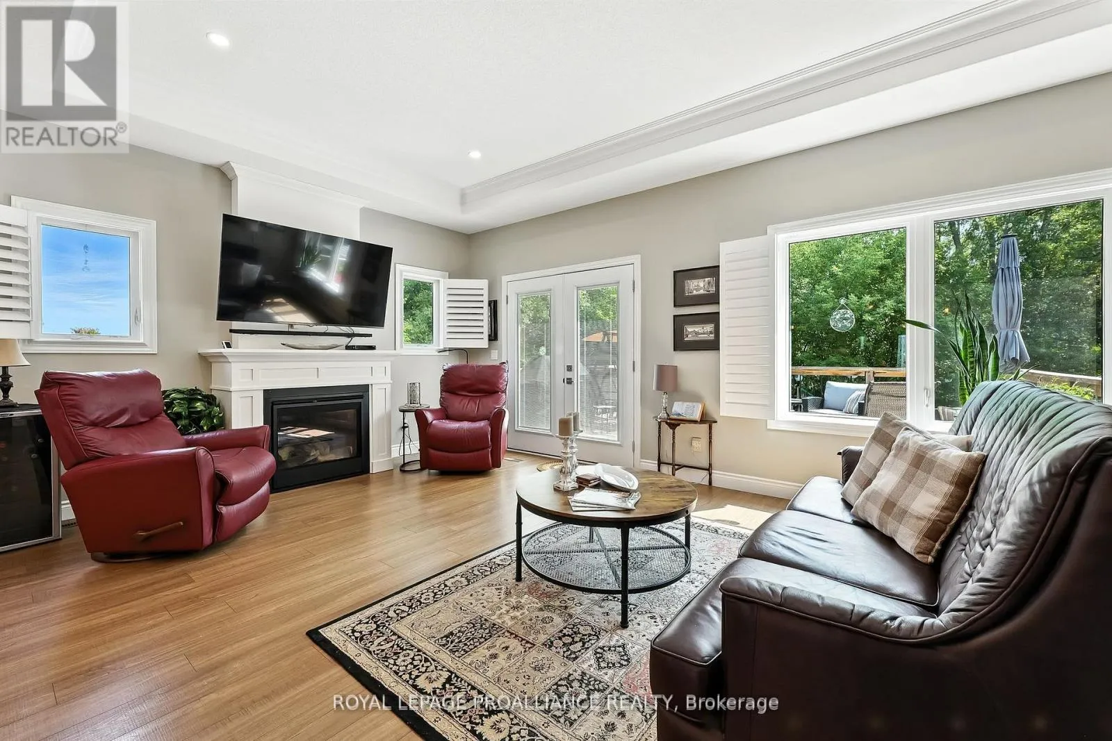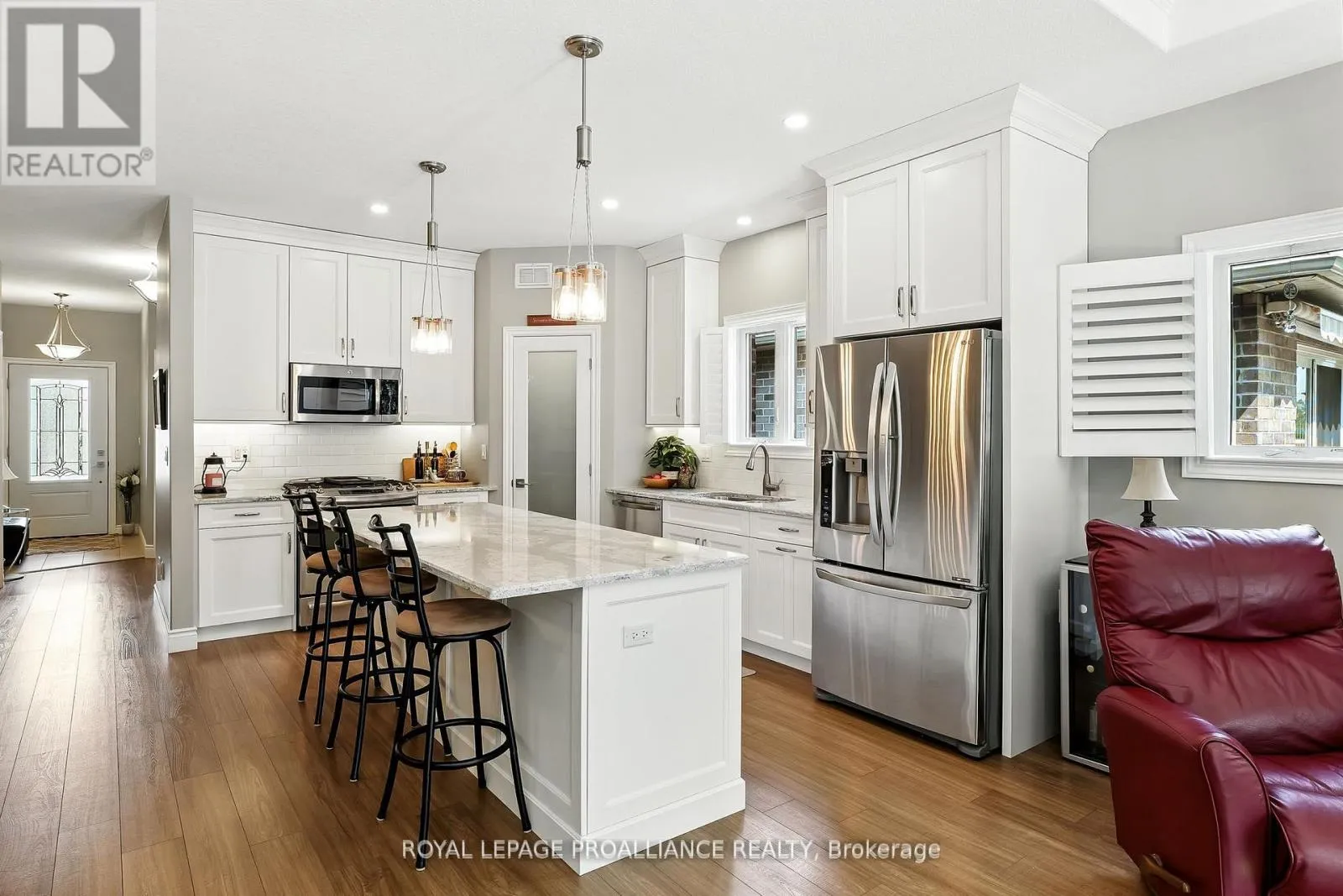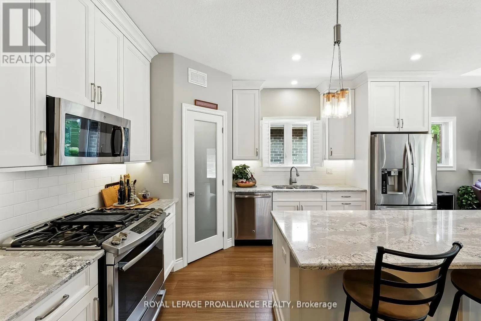 Empire Blvd/Royal Gala Drive Welcome to 82 Royal Gala Drive, where modern design meets a tranquil conservation setting. Backing onto woods with no rear neighbors, this fully finished 4 bedroom, 3 bath true bungalow blends privacy, nature and contemporary living. Stroll or bike pathways leading to Presqu'ile Provincial Park and downtown Brighton, an unmatched location for recreation and convenience. The all-brick & stone exterior offers timeless curb appeal. Inside, the main floor features 2 bedrooms and 2 baths in a separate wing layout, giving guests their own private space. The showstopping kitchen boasts ceiling-height cabinetry, quartz counters, modern fixtures, WI pantry, Island and a gas range for the chef at heart. An open concept plan flows into the dining area and great room with gas fireplace and California shutters, while garden doors lead to an oversized deck overlooking the yard and woods. Spacious Primary suite impresses with a striking feature wall and luxurious 4-pc ensuite, complete with double vanity, quartz counters, huge walk-in glass/tile shower with seat and....heated floors! A main floor laundry with interior garage access makes chores a breeze. The finished lower level adds incredible living space, featuring a large recreation room with fireplace, a versatile nook for an office, playroom or hobbies, two generous bedrooms and a full bathroom ideal for more guests, extended family or your teenagers. Outdoors, entertain under the newer gazebo on the stone patio or relax on the deck under the stars with a glass of wine. A garden shed keeps tools tucked away, while the attached garage provides secure parking and storage. With modern finishes, a functional layout and a conservation lot offering unmatched tranquility, 82 Royal Gala Drive is a rare opportunity to enjoy contemporary living steps from nature trails, the beaches at Presqu'ile Provincial Park and Brighton's abundant amenities with shopping, cafes, arena, curling, YMCA, library, schools, tennis &pickleball courts. (id:27476)
