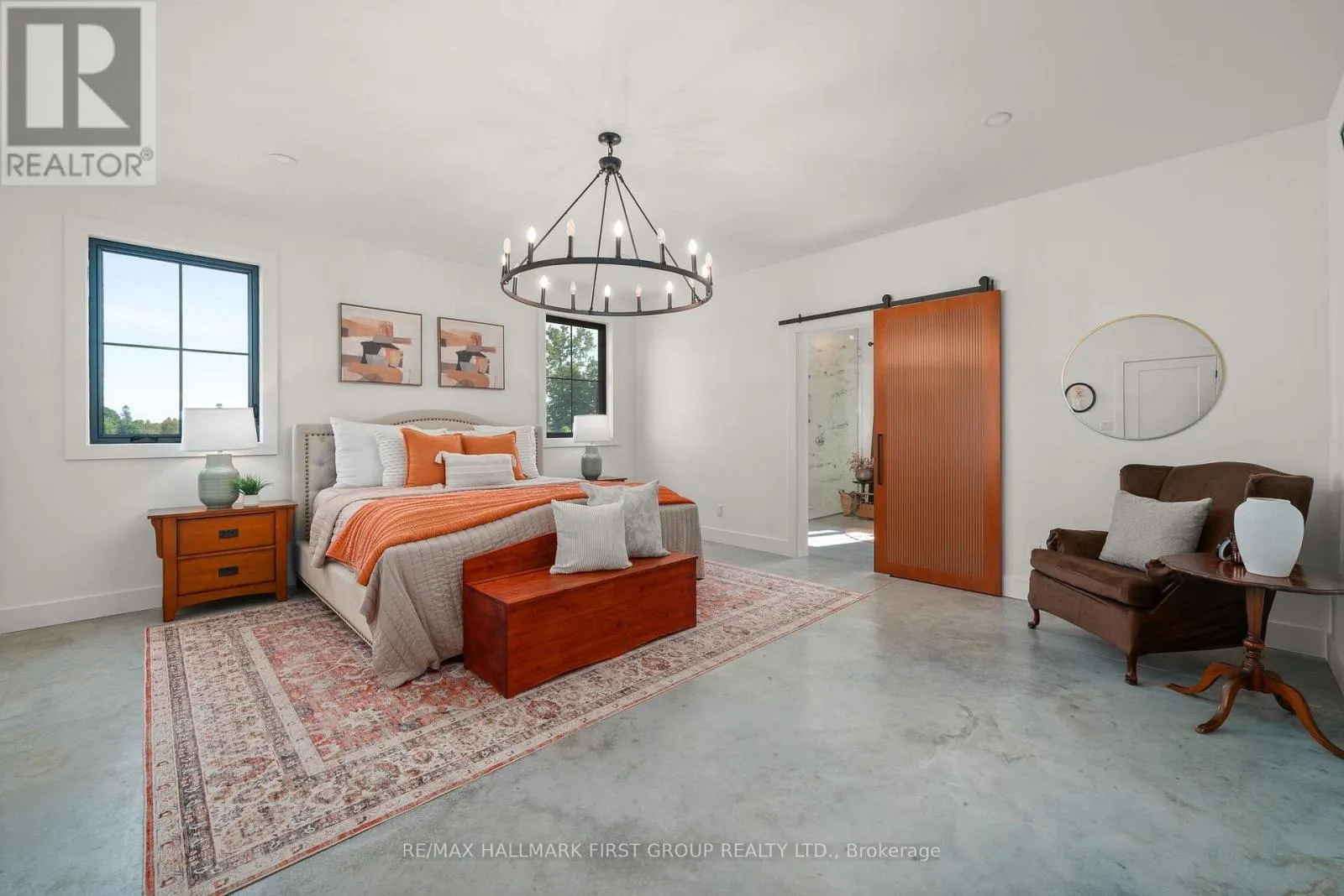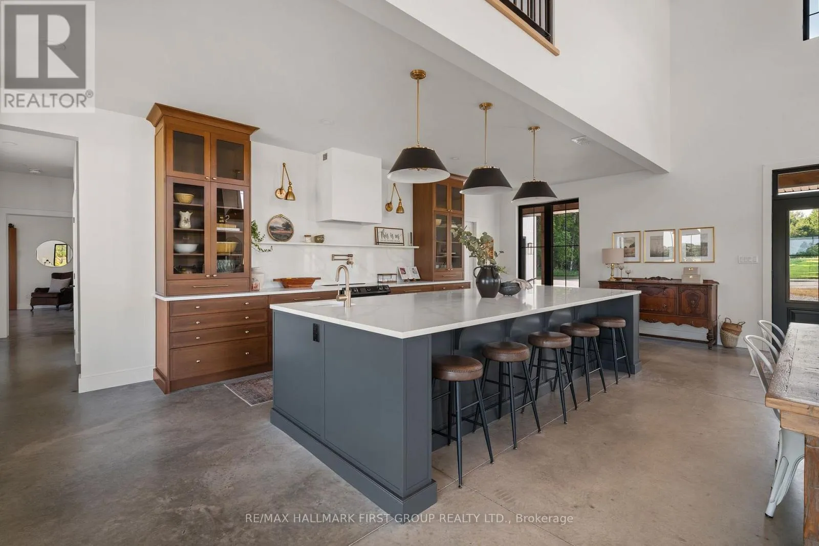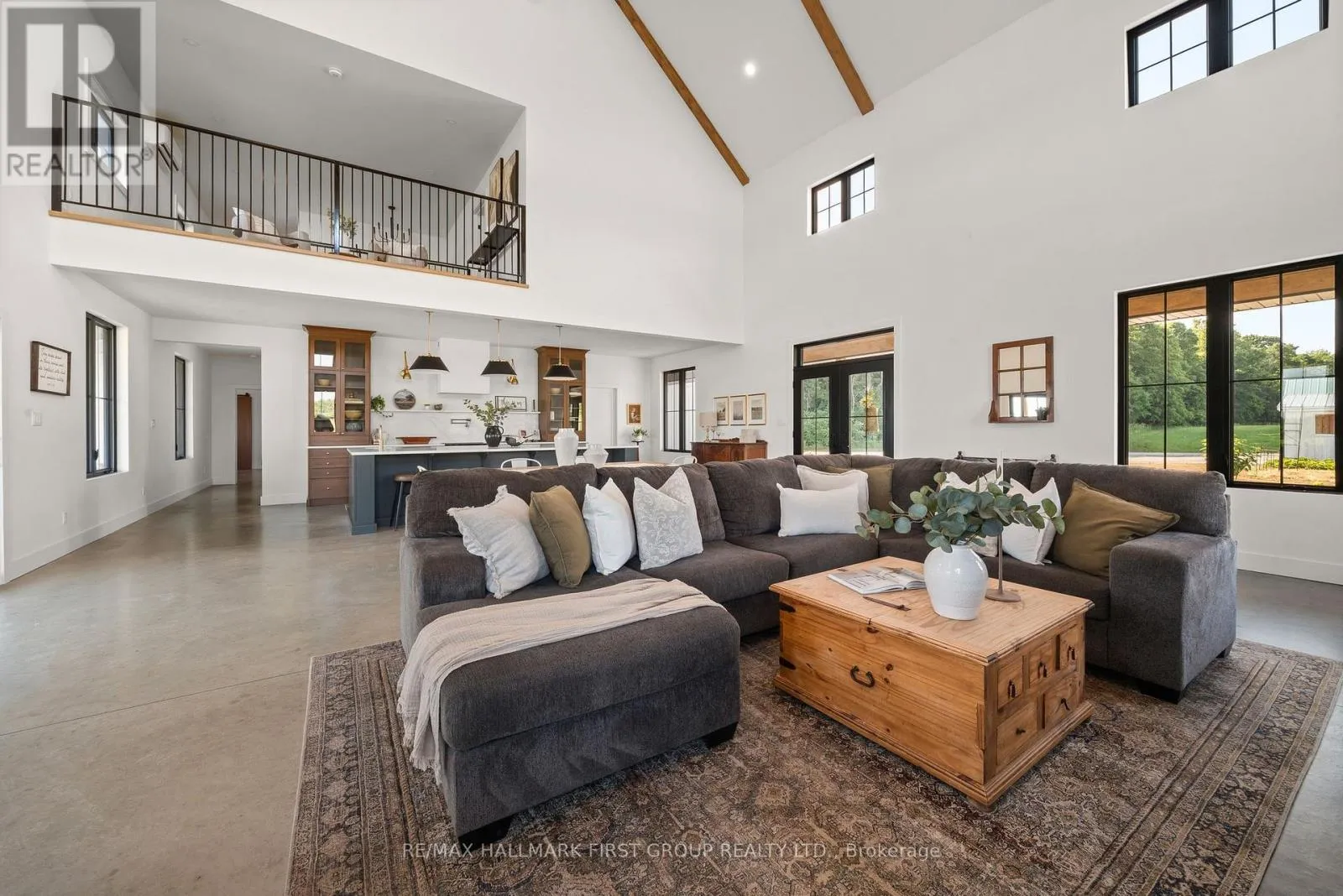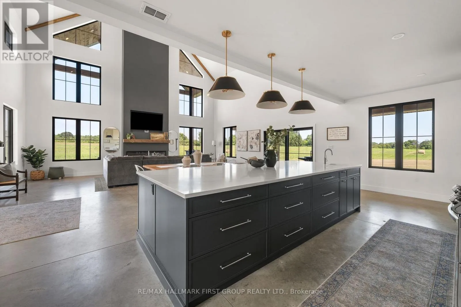 Cross Streets: Telephone Road & Scriver Road. ** Directions: Telephone Rd. or Whites Rd. to Scriver Rd. 63.16 acres of opportunity-a rare chance to slow down, claim as your own, and create your dream lifestyle. At the heart of the property sits a 2023 custom-built architectural masterpiece with over 5,300 sq ft of refined living space. Featuring 5 bedrooms and 4 bathrooms, soaring 26-ft ceilings with beam detail, and heated polished concrete floors throughout, the home blends bold design with modern comfort. The custom kitchen overlooks the living and dining areas, with quartz counters and backsplash, glass cabinetry, premium pot drawers, pot filler, full appliance package, and 14-ft centre island, plus a secondary prep kitchen-perfect for entertaining, baking, or large-family living.The primary suite includes a walkout to the covered stamped concrete porch, a 5-pc ensuite with soaker tub and glass shower, and a bright walk-in closet. The upper level features a large bonus room ideal for a theatre, gym, private retreat, or in-law suite potential, plus three additional bedrooms and two full baths. Perfect for a hobby farm, hay operation, homestead, or private country retreat, this property offers space to raise animals, garden, explore nature, and enjoy peace and solitude.The land is systematically tile drained, ideal for farming, gardening, or expanded agricultural use. Open fields provide room for animals, fencing, and hay production, while portions have been successfully cash-cropped with corn and soybeans. Dedicated garden areas support a "living off the land" lifestyle, and fruit trees line the driveway. Wooded trails and a creek offer walking, off-road adventures, or recreational pursuits-balancing quiet solitude with outdoor activity. A 7-stall horse barn adds exceptional value for equestrian or hobby-farm enthusiasts. Minutes to area golf courses, 401 access, and amenities-this is more than a home; it's land, lifestyle, and long-term potential. Extras: Hydronic heating system, constant pressure well pump, electrical rough-in for generator. (id:27476)