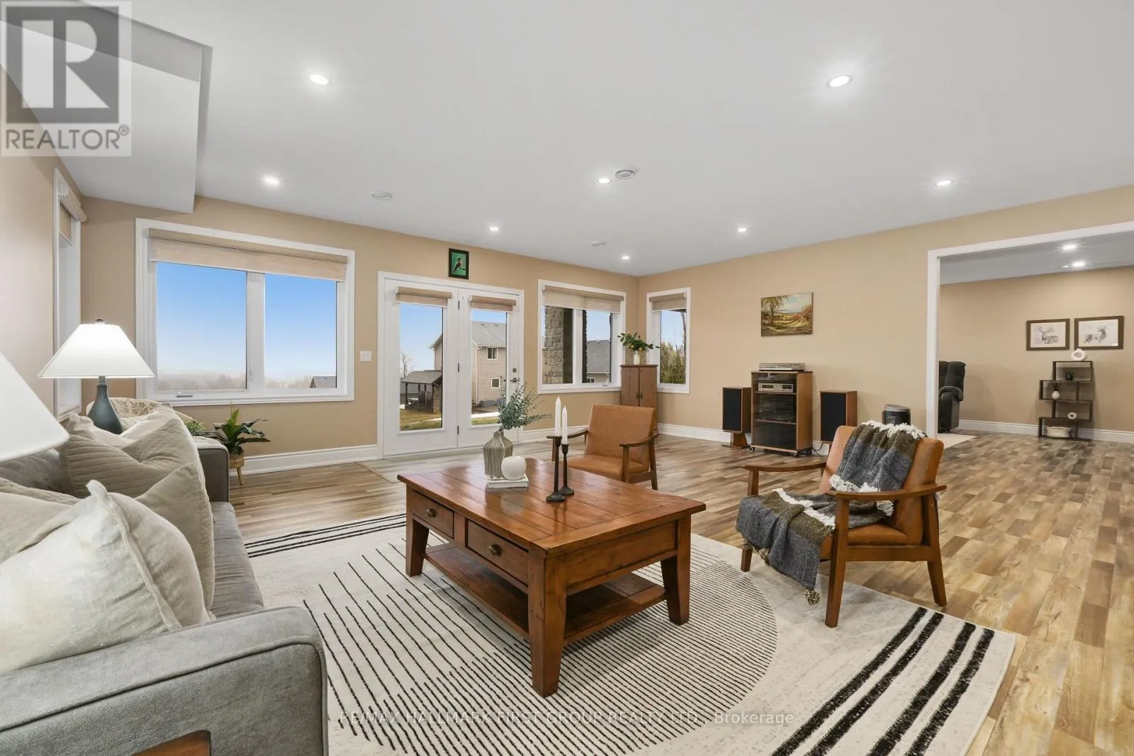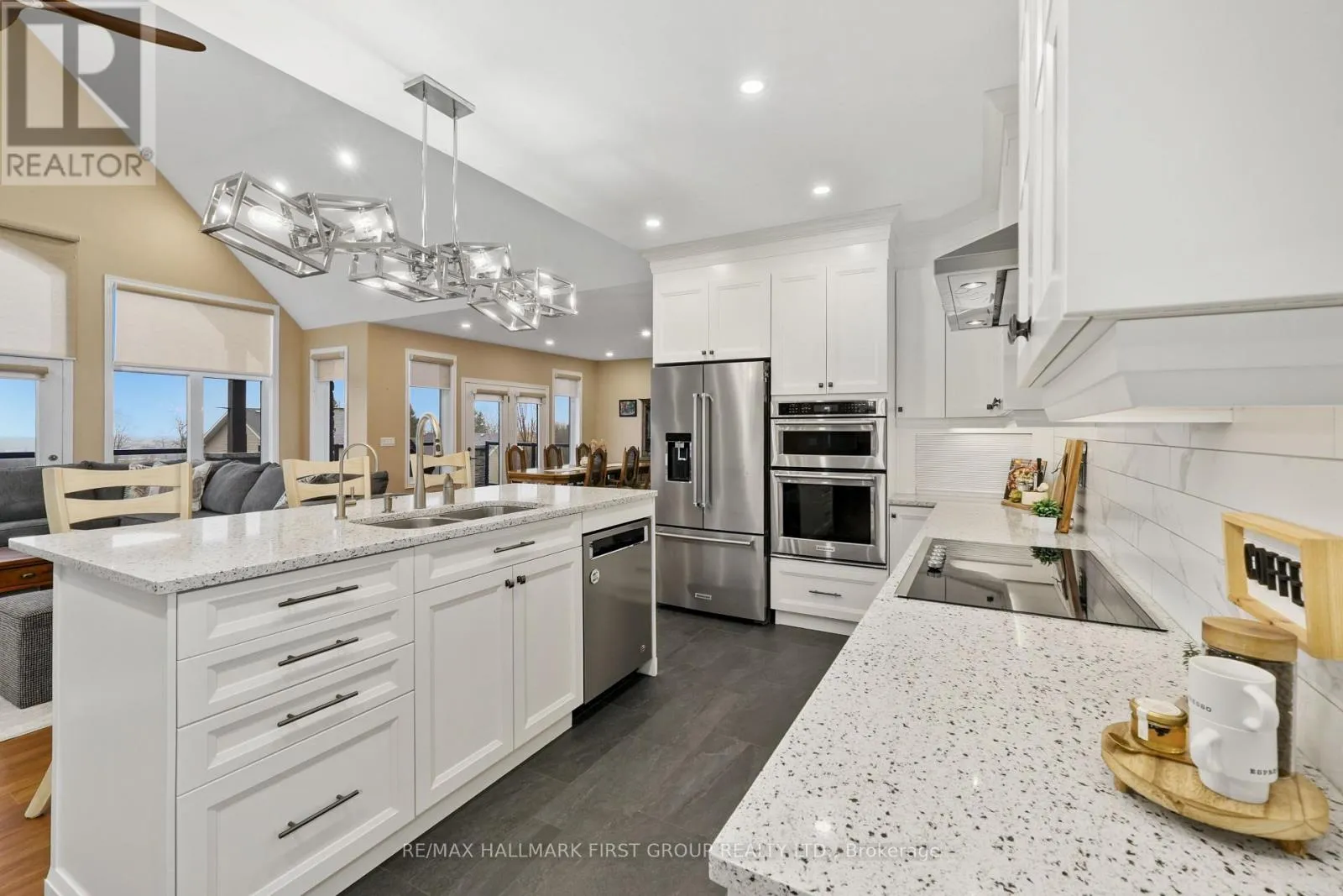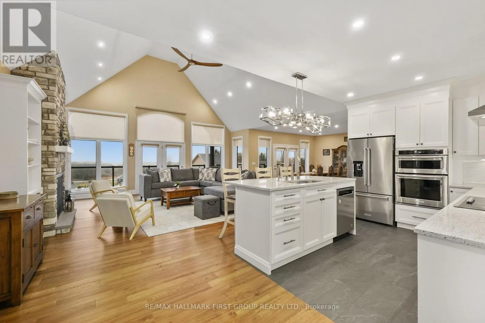 Cross Streets: Huff Rd & Main St. ** Directions: CR2 heading East, Left onto Huff Rd. Featuring panoramic views of Lake Ontario, this beautifully designed bungalow offers space, privacy, and lifestyle in equal measure. The main floor welcomes you with a bright, open-concept living, kitchen, and dining area, where a dramatic vaulted ceiling and cozy fireplace create a warm, inviting focal point for everyday living and entertaining. Large windows fill the space with natural light. The thoughtful layout keeps family and guests comfortably connected, and multiple walk-outs to the deck allow conversation to flow effortlessly from indoors to out, creating the perfect setting for summer evenings overlooking the beautiful gardens and lake beyond. The kitchen is designed for both style and function, complemented by a convenient walk-in pantry that offers excellent storage and organization. Designed for convenience, the main level also features two bedrooms, including the spacious primary suite, a second full bathroom, and main floor laundry, making day-to-day living easy and functional. The primary suite is a true retreat, complete with its own walk-out to the deck and a generous ensuite featuring a large corner jacuzzi tub, separate glass shower, and comfortable in-floor heating for added everyday luxury. Closets throughout the home are thoughtfully designed with built-in organizers for practical and efficient storage. The lower level has in-floor heating throughout and offers exceptional flexibility with a large recreation area complete with a wet bar, dedicated media room perfect for movie nights or game days, two spacious bedrooms, an office nook, and another bathroom. Car enthusiasts will appreciate the attached, heated two-car garage complete with epoxy flooring and a substantial heated detached garage, totalling five garage spaces. With nearby cycling trails, apple orchards, and Presqu'ile Provincial Park, plus the convenience of being just minutes from the 401, this property blends rural tranquillity with the very best of Northumberland County living. (id:27476)