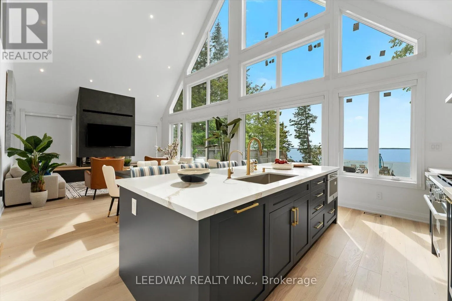 Cross Streets: Durham 23 to Thorah Park Blvd. ** Directions: Proceed on HWY 48 to HWY 23 north and exit onto Thorah Park Blvd. ALL BRAND-NEW FURNITURE IS INCLUDED IN THE PRICE. Don't miss out on this one-of-a-kind Custom-built Tarion warrantied waterfront property with newly constructed boathouse! Walk through the beautifully stained fiberglass front door into the spacious foyer accented by 48" porcelain tiles. The Foyer opens out to the awe-inspiring great room/kitchen combo filled with natural sunlight pouring through the floor-to-ceiling high windows. Great room boasts soaring 24ft vaulted ceiling and wood cladded ridge beam! A 3-sided 5ft Marquis fireplace dressed in Marrakesh Wall paint complements the great room. Chef's custom kitchen boasts high quality quartz counters and backsplash, high-end appliances, large 4x9ft center island, and a slide-out and a walk-in pantry. Main floor offers 2 ample sized bedrooms, laundry, spa-inspired 4pc washroom & access to garage. Principal bedroom is equipped with a luxurious 5pc ensuite, walk-in closet with French doors and custom closet organizer. The second bedroom has a 3pc ensuite. Both the bedrooms have huge custom designed glass panes offering magnificent views of the lake! Walking out of the great room 8' tall sliding doors, you are greeted with a massive deck with a diamond insignia. The deck is equipped with a built-in gas BBQ with an outdoor fridge. A set of cascading stairs takes you down to the lush back yard and second massive diamond deck. The second deck sits atop the 16'x30' dry boathouse which has a massive 11' high door and a 60-amp subpanel. The boathouse is drywalled and finished. The fully finished basement includes and entertainment room and an exercise room. Other notable highlights: electric car charger rough-in in garage, water treatment equipment, water softener, hot tub rough-in, pot lights throughout, high end Riobel plumbing fixtures, smart thermostat, alarm system (monitored option), and a camera surveillance system. (id:27476)