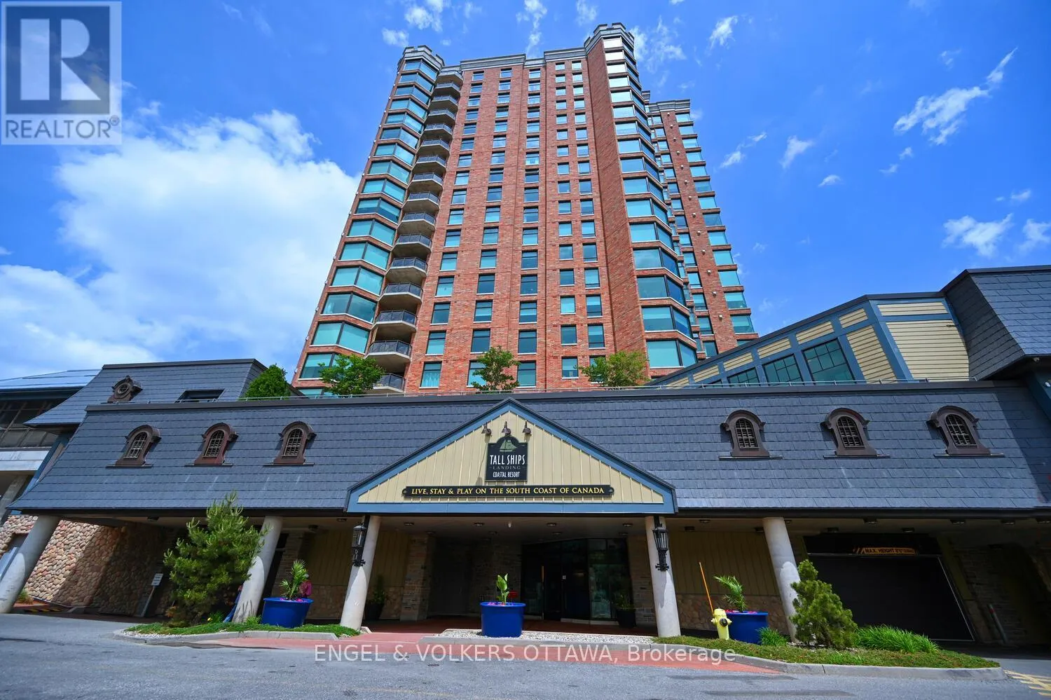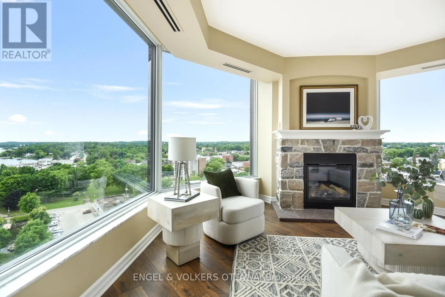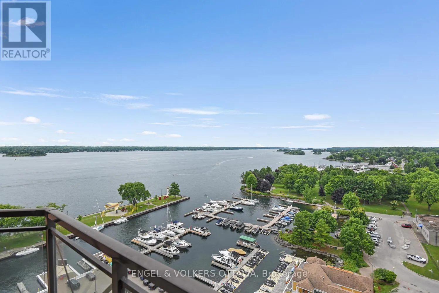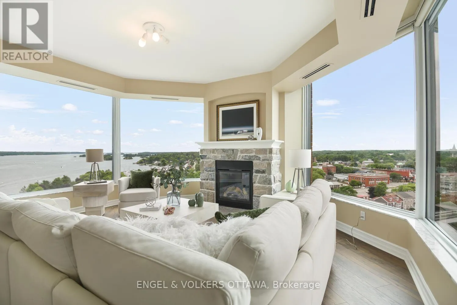 From Highway 401 take the Stewart Blvd exit and travel south on Stewart Blvd which becomes William which becomes Court House Blvd to King Street. Turn right on King St then left on St Andrew. Condo at end of St Andrew St. Rarely offered for sale this northwest facing Tops'l Suite offers outstanding views of the Brockville portion of the 1000 Islands as well as the Brockville skyline. You and your guests will never tire of the views which change seasonally. This suite offers a beautifully portioned great room style anchored by a gas fireplace. The tailored kitchen cabinetry is in classic white with granite countertops. The huge window over the sink lets you keep an eye on the comings and goings of the city below. The spacious primary suite accommodates a king size suite with adjacent 5 piece ensuite and huge walk in closet. The secondary bedroom on the opposite side of the condo provides total privacy for visiting family or guests or makes an excellent office. Wide plank hardwood flooring throughout adds to the sense of space ceramic flooring in the baths, of course. The building amenities are second to none .... huge indoor pool, indoor and outdoor hot tubs, nicely equipped gym, reception rooms, games room, catering kitchen. One indoor parking space is equipped with an EV charger. A must see!!! (id:27476)