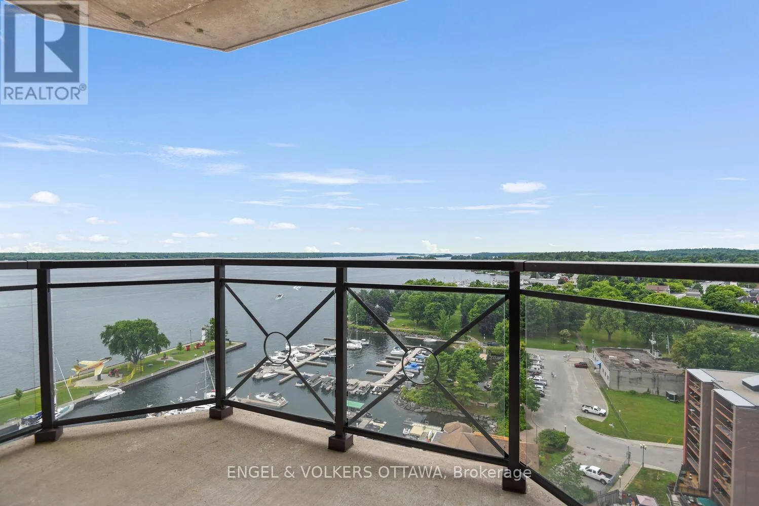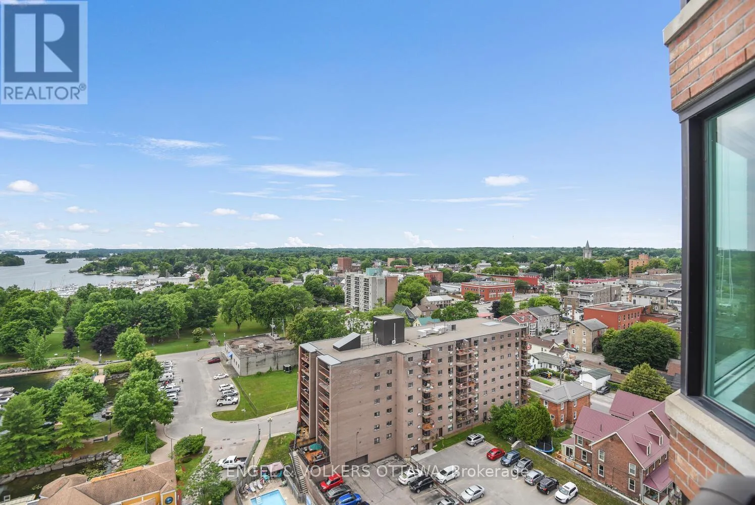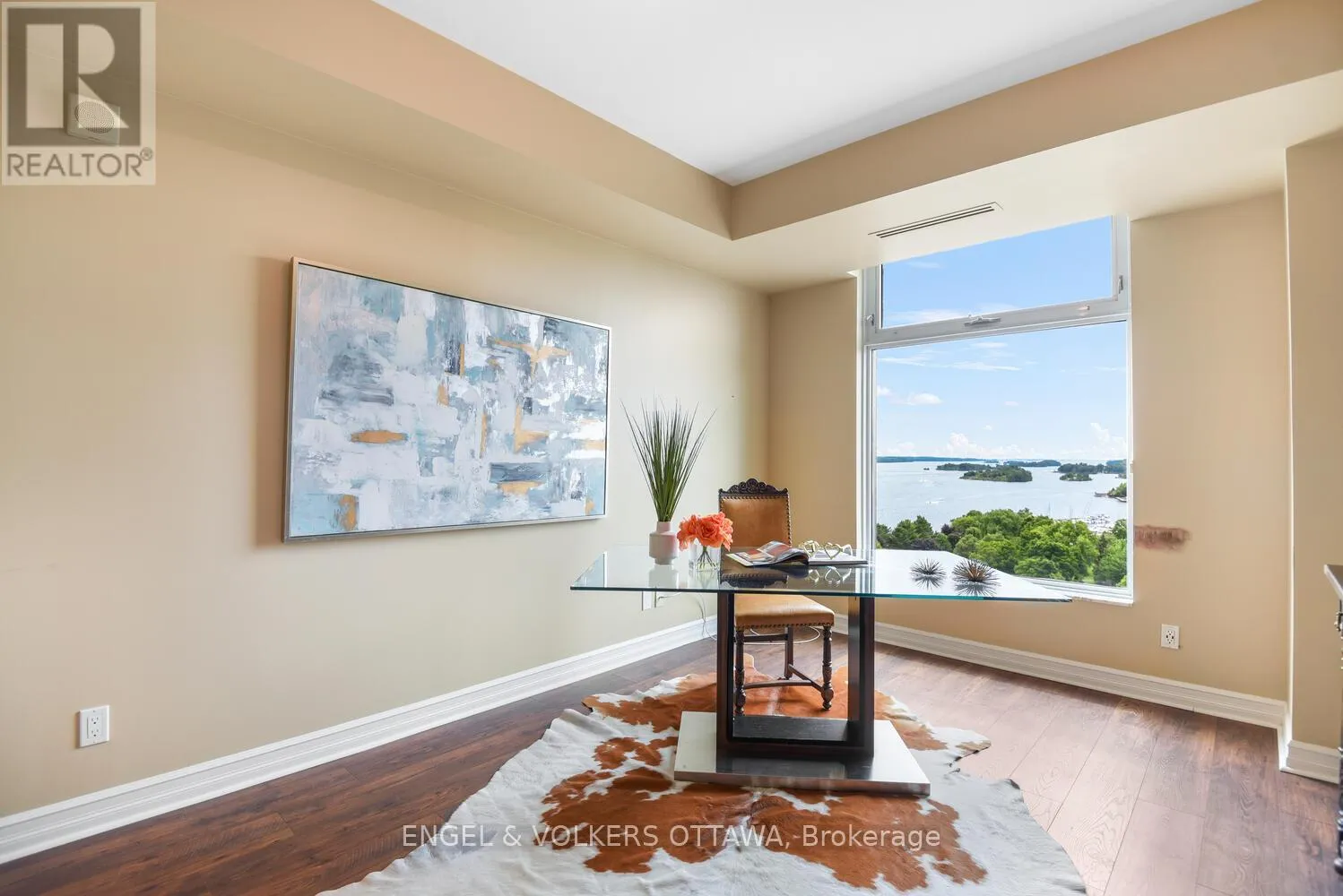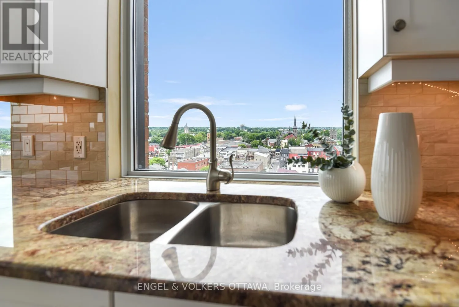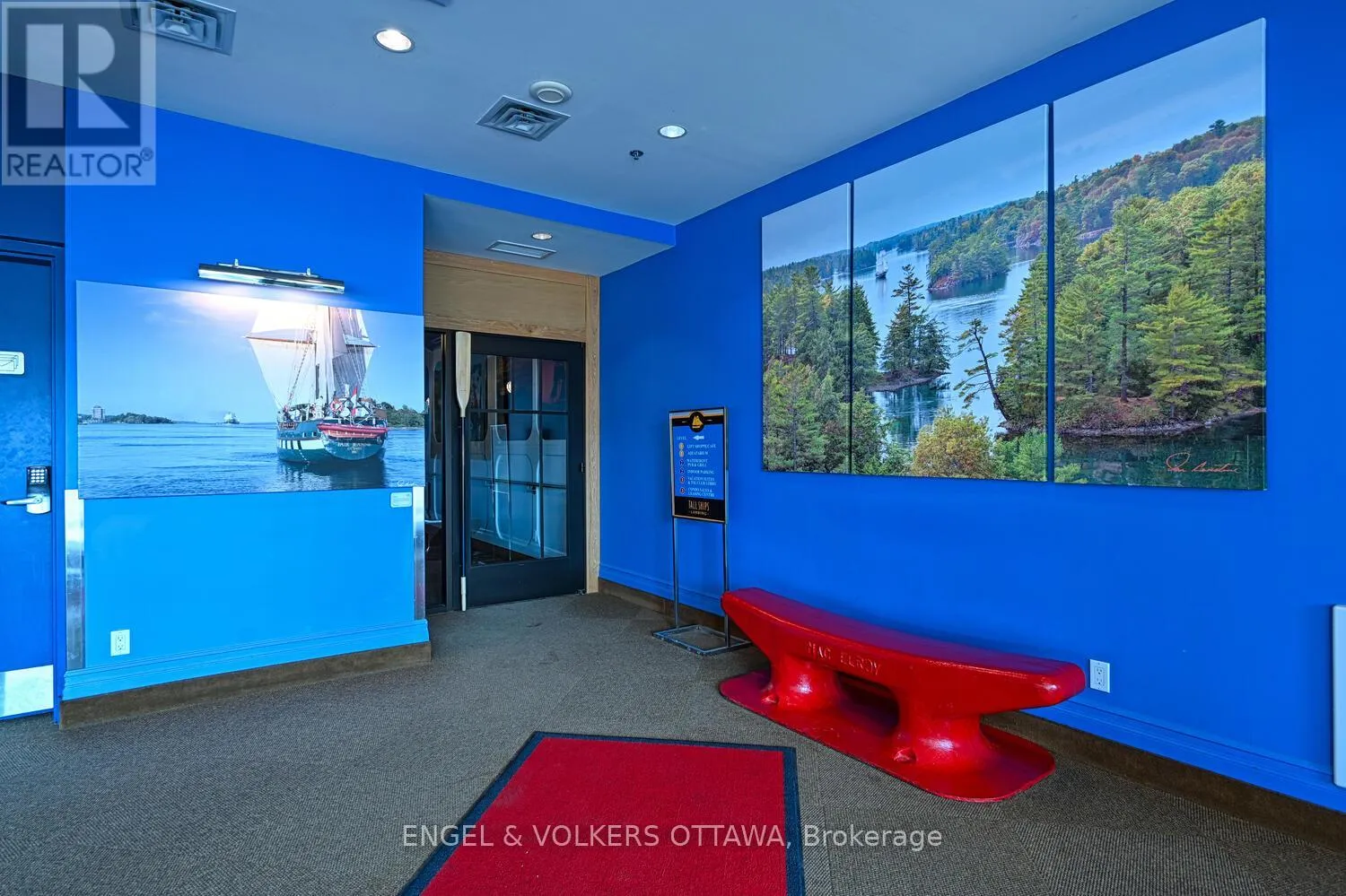 From Highway 401 take the Stewart Blvd exit and travel south on Stewart Blvd which becomes William which becomes Court House Blvd to King Street. Turn right on King St then left on St Andrew. Condo at end of St Andrew St. Rarely offered for sale this northwest facing Tops'l Suite offers outstanding views of the Brockville portion of the 1000 Islands as well as the Brockville skyline. You and your guests will never tire of the views which change seasonally. This suite offers a beautifully portioned great room style anchored by a gas fireplace. The tailored kitchen cabinetry is in classic white with granite countertops. The huge window over the sink lets you keep an eye on the comings and goings of the city below. The spacious primary suite accommodates a king size suite with adjacent 5 piece ensuite and huge walk in closet. The secondary bedroom on the opposite side of the condo provides total privacy for visiting family or guests or makes an excellent office. Wide plank hardwood flooring throughout adds to the sense of space ceramic flooring in the baths, of course. The building amenities are second to none .... huge indoor pool, indoor and outdoor hot tubs, nicely equipped gym, reception rooms, games room, catering kitchen. One indoor parking space is equipped with an EV charger. A must see!!! (id:27476)