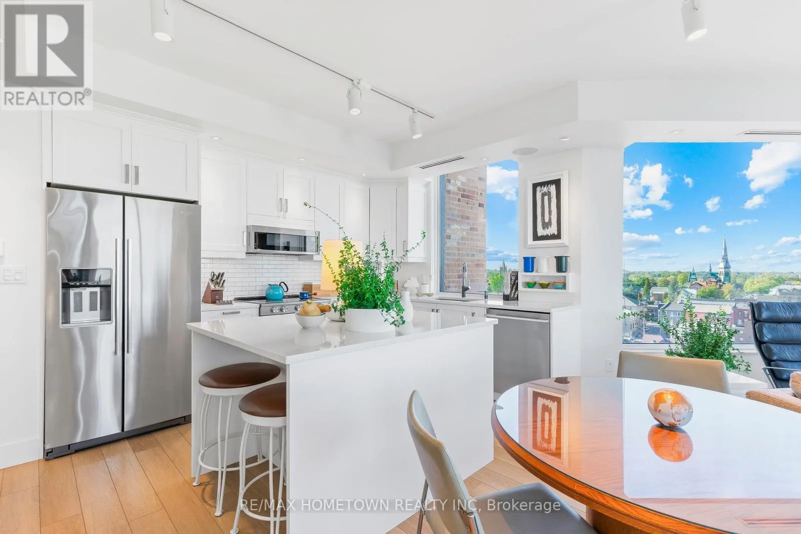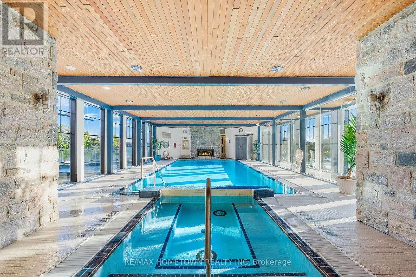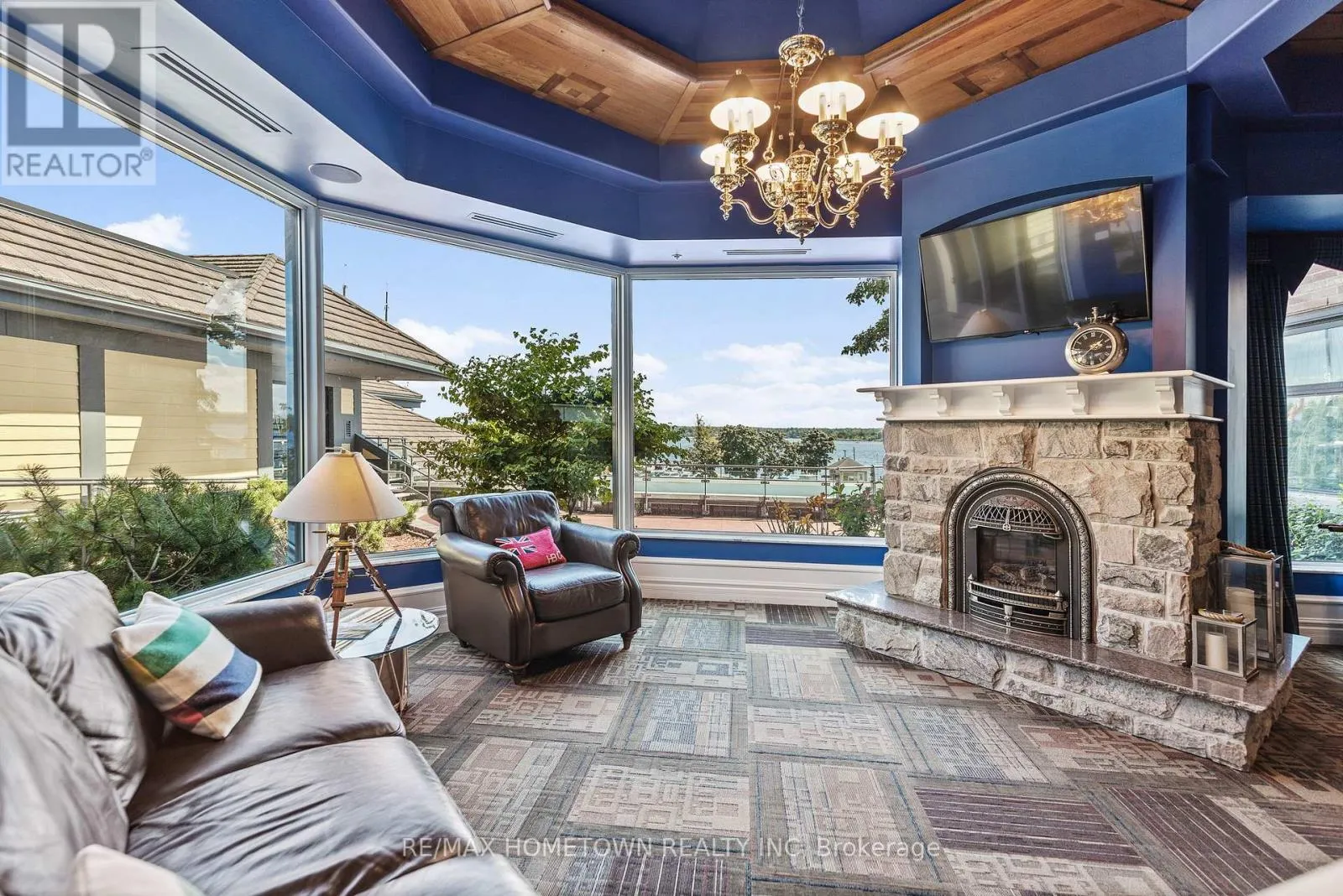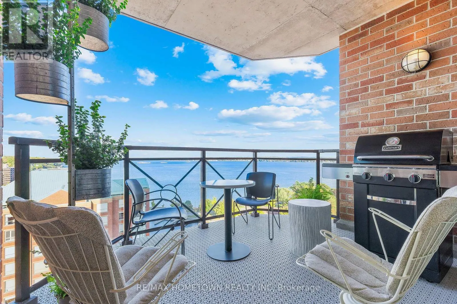 Cross Streets: Water and St. Andrew St. ** Directions: From Highway 401 take Stewart Blvd exit and travel south to King St. Continue South on Broad St. to Tall Ships Landing. Parking off of Flint St. Suite 1205 at Tall Ships Landing offers elevated riverfront living in the heart of the 1000 Islands. This 1,161 sq. ft., two-bedroom, two-bath, North-East corner residence, with it's additional 105 sq. ft. private terrace, offers sweeping 270-degree views of the St. Lawrence River, passing ships, and Brockville's historic skyline through the huge floor to ceiling picture windows in its octagonal great room. Experience sunrise and sunset in the same room, every day. Renovated in 2021, this refined suite features custom millwork, window seating, integrated lighting and audio in every room, and a jacuzzi tub in the ensuite positioned to provide a view 20 miles down the St. Lawrence River. Gas for the terrace BBQ and the great room fireplace is included in the maintenance fee. Residents enjoy resort-style amenities including indoor and outdoor pools, hot tub, sauna, gym, games and party rooms, coffee bar, outdoor terraces, preferred Guest Suite rental rates, marina access, on-site dining, retail and more. One premium parking space with an owned EV charging station, 2 storage lockers, 2 wall bike racks and height allowance for overhead pully canoe/kayak storage is available for $39,900 (id:27476)