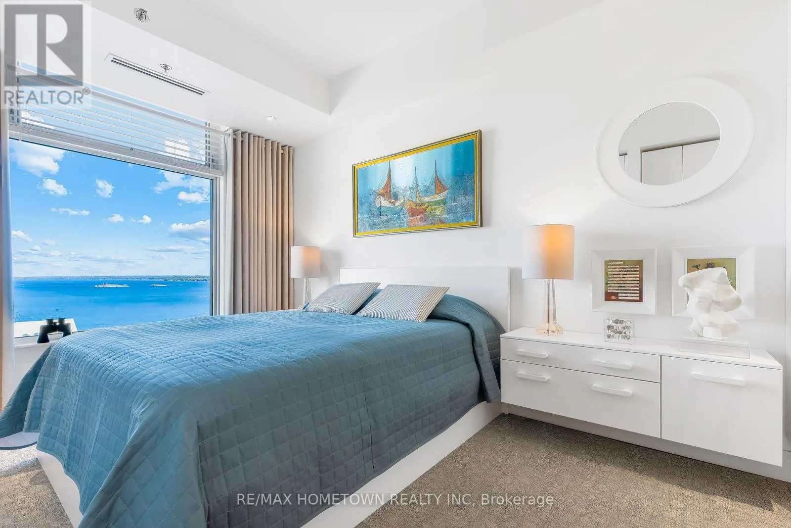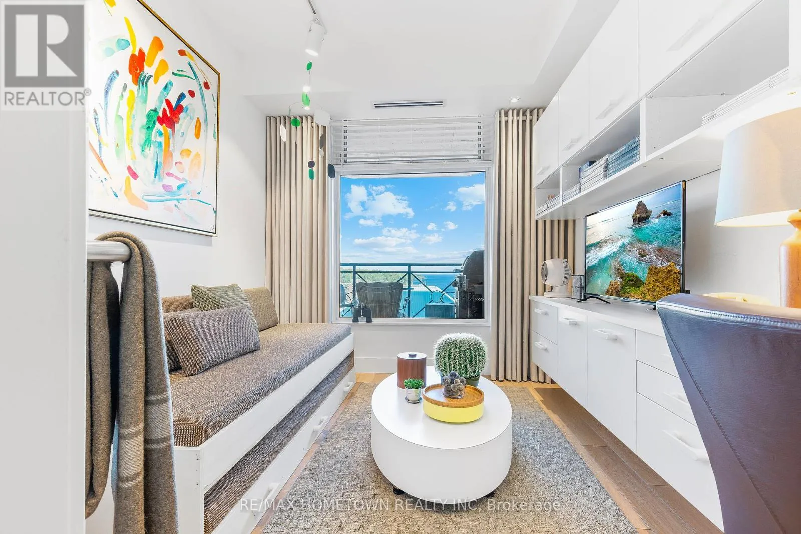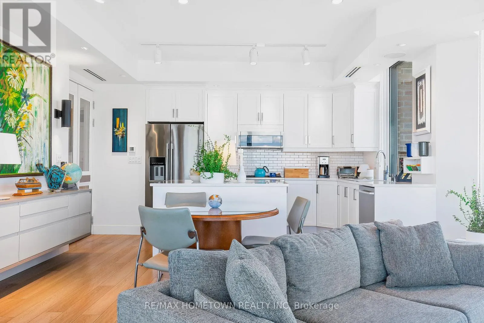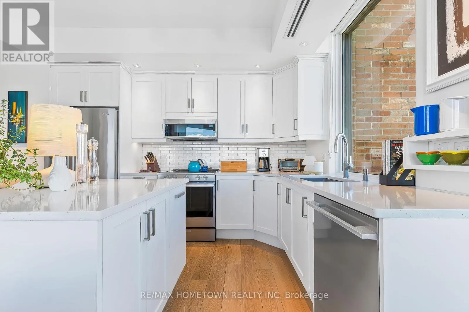 Cross Streets: Water and St. Andrew St. ** Directions: From Highway 401 take Stewart Blvd exit and travel south to King St. Continue South on Broad St. to Tall Ships Landing. Parking off of Flint St. Suite 1205 at Tall Ships Landing offers elevated riverfront living in the heart of the 1000 Islands. This 1,161 sq. ft., two-bedroom, two-bath, North-East corner residence, with it's additional 105 sq. ft. private terrace, offers sweeping 270-degree views of the St. Lawrence River, passing ships, and Brockville's historic skyline through the huge floor to ceiling picture windows in its octagonal great room. Experience sunrise and sunset in the same room, every day. Renovated in 2021, this refined suite features custom millwork, window seating, integrated lighting and audio in every room, and a jacuzzi tub in the ensuite positioned to provide a view 20 miles down the St. Lawrence River. Gas for the terrace BBQ and the great room fireplace is included in the maintenance fee. Residents enjoy resort-style amenities including indoor and outdoor pools, hot tub, sauna, gym, games and party rooms, coffee bar, outdoor terraces, preferred Guest Suite rental rates, marina access, on-site dining, retail and more. One premium parking space with an owned EV charging station, 2 storage lockers, 2 wall bike racks and height allowance for overhead pully canoe/kayak storage is available for $39,900 (id:27476)