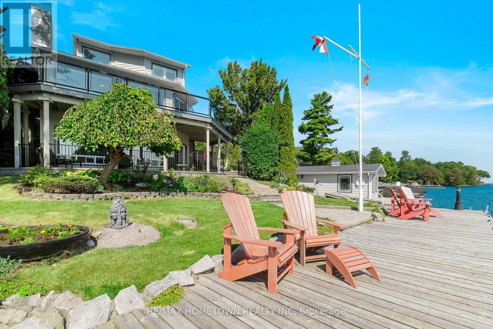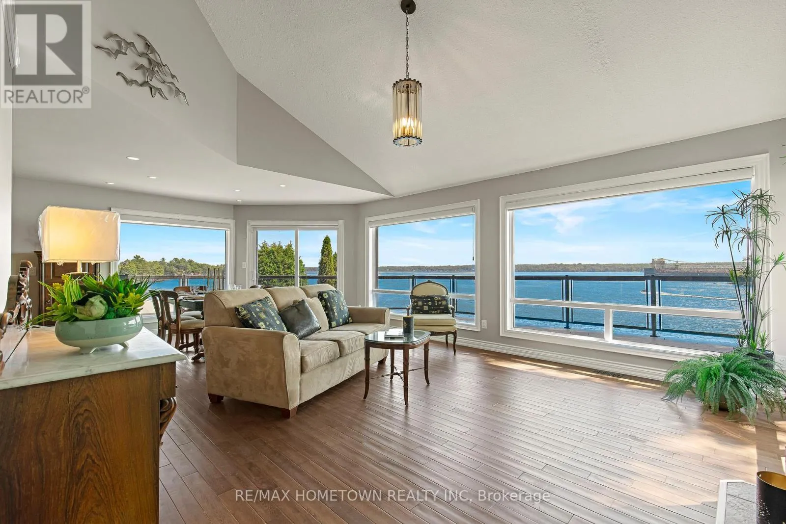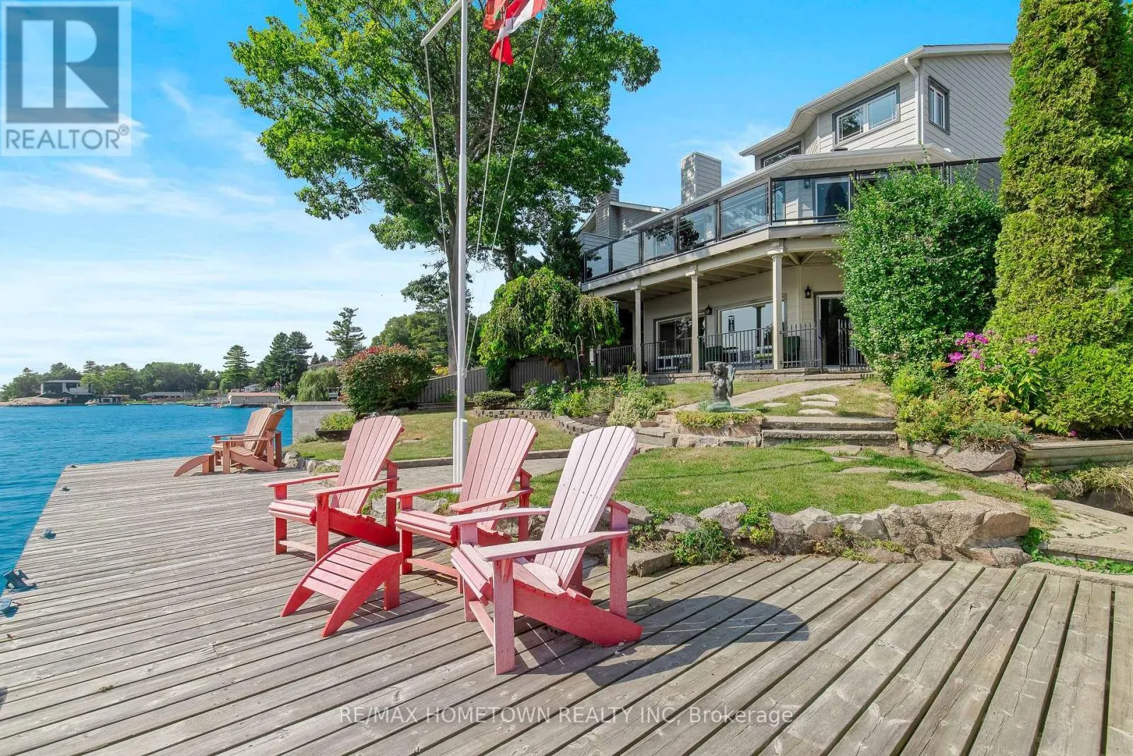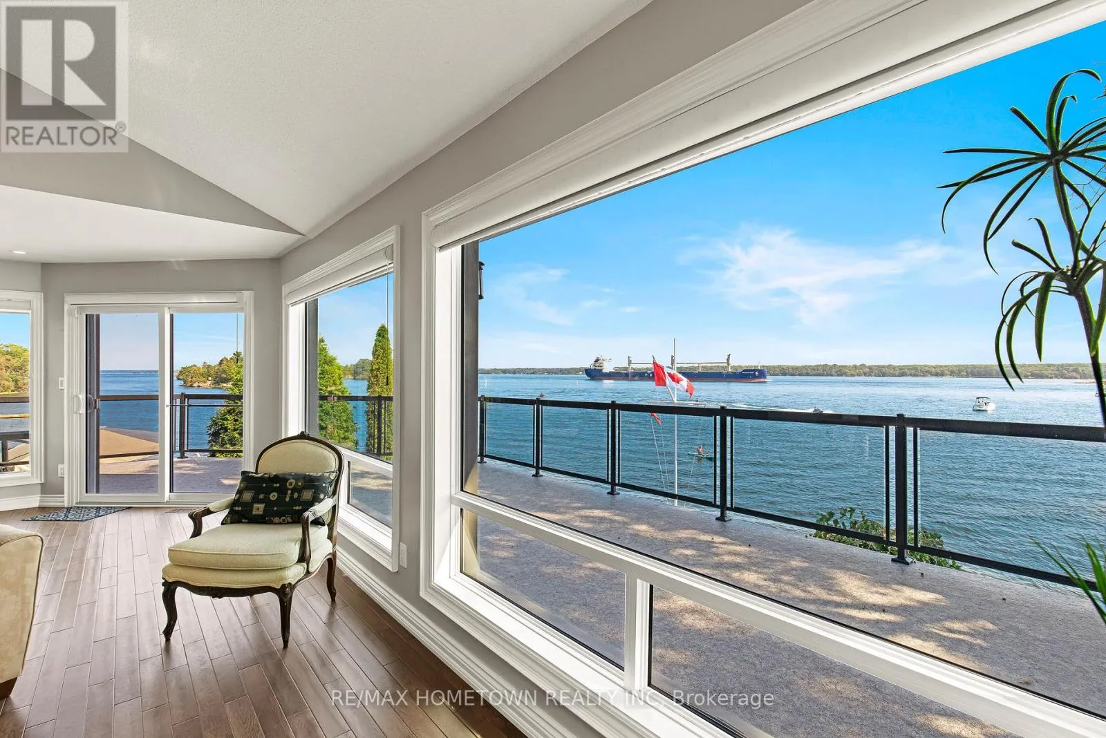 King St. W., south onto the westerly entrance to Bayview Rd., pass thru the sign indicating private road and the property is signed and on the riverside. Located within the City of Brockville, yet offering the privacy of a riverfront retreat, 9 Bayview Road provides front-row views of the great ships navigating the world-renowned St. Lawrence Seaway. Just minutes from downtown Brockville, yet worlds away in its waterfront serenity. Life on the St. Lawrence River offers a rhythm and beauty that changes with every season, and this exceptional waterfront property captures it perfectly. Set among dramatic rock outcroppings and beautifully maintained gardens, the home blends natural landscape with thoughtfully designed living. A wall of south-facing windows fills the interior with natural light while framing sweeping panoramic vistas across the river. From the balcony or covered deck, watch international freighters glide past your shoreline, a remarkable spectacle found in only a select few waterfront locations in the world. Outdoor living is effortless with walkout access to the river, easy docking from a Kehoe dock, and a SeaDoo lift with storage facility ready for summer adventures. Spring brings fresh colour to the gardens and lively river activity, while summer invites boating, swimming, and waterfront gatherings. Autumn sunsets and peaceful winter scenes ensure beauty in every season. With private road access and guest parking on Bayview Road, this is a rare opportunity to own an exceptional city waterfront home on the St. Lawrence River. (id:27476)
