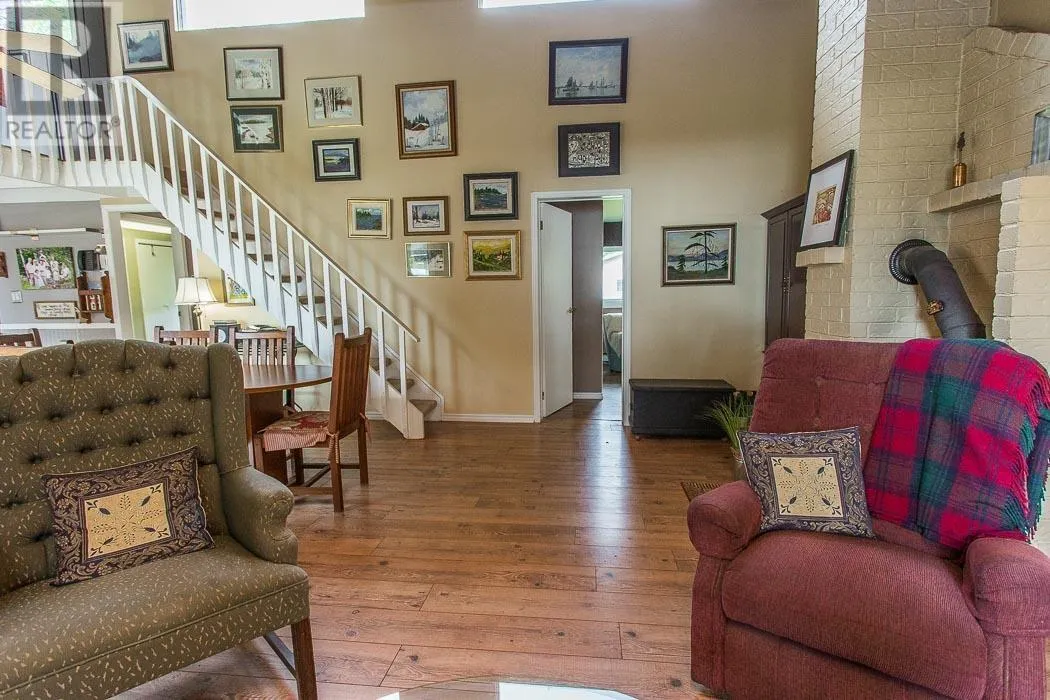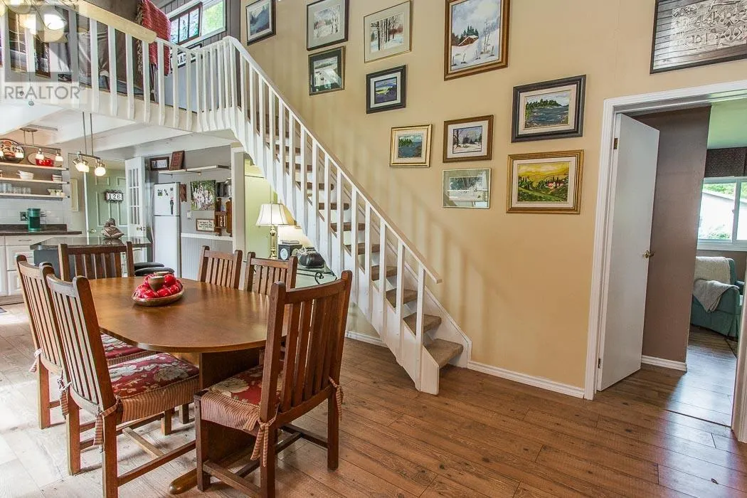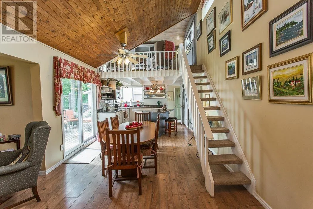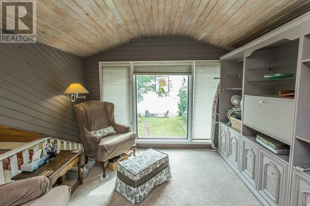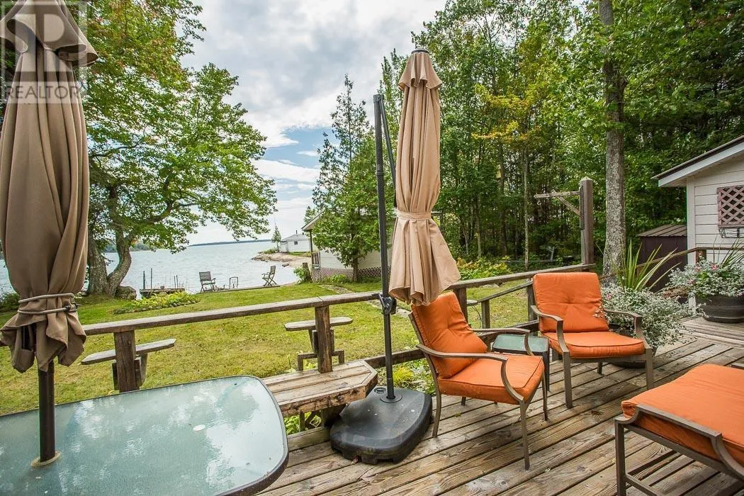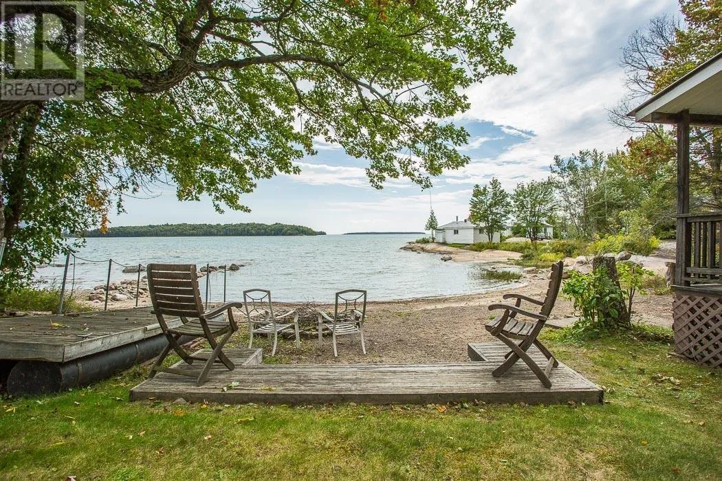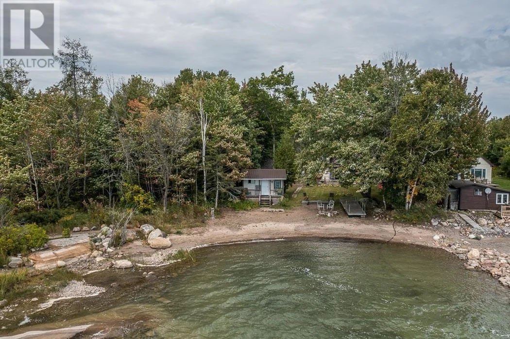 Highway 17 to Waltonen road, home to the left Charming waterfront home on Joe Dollar Bay in Bruce Mines, fully furnished and ready to go for seasonal use, nearly ready for year round enjoyment. This 2-bedroom gem features a loft overlooking the bay, perfect as a third bedroom. The primary bedroom boasts a sliding glass door to a small patio with a roll-out awning. Enjoy the great swimming beach with a wooden platform for lawn chairs and a large floating dock for summer fun. The home and outbuildings, including a cozy bunky by the water, a convenient storage building next to the house, and a spacious 2-car detached garage, all feature durable metal roofing. Note: the property requires a winterized lake intake water supply to be fully move-in ready. This idyllic retreat offers years of serene lakeside living. (id:27476)