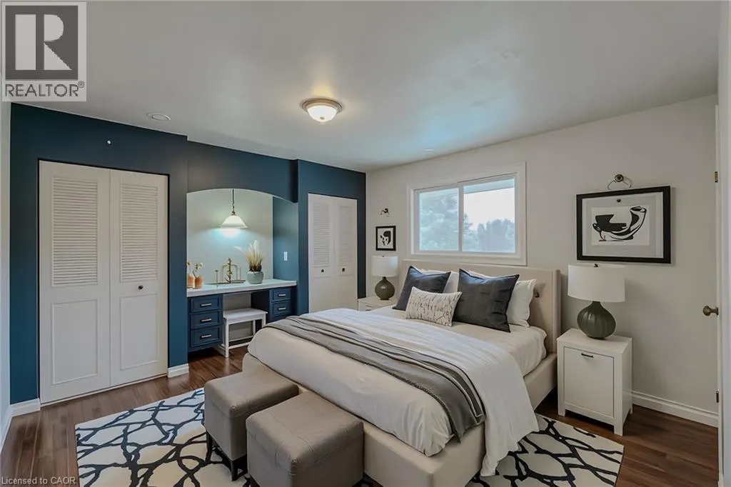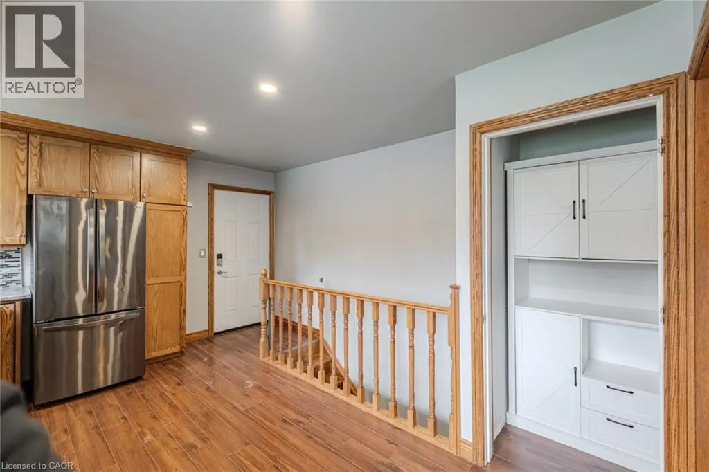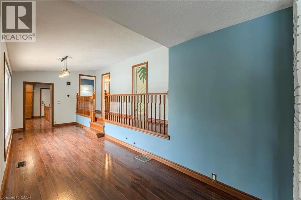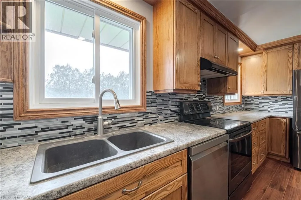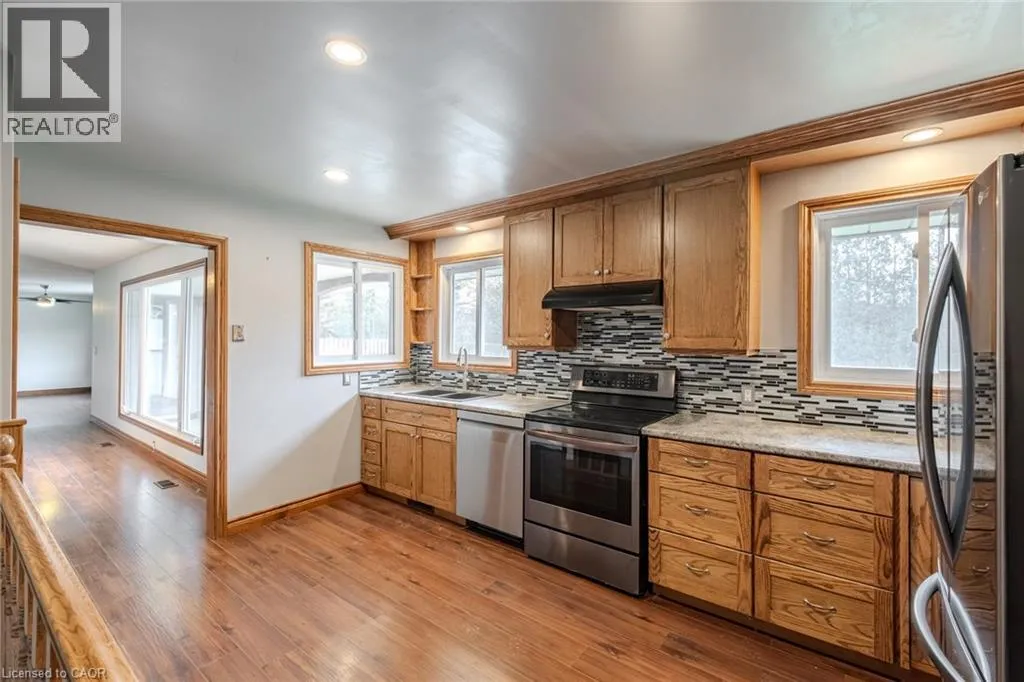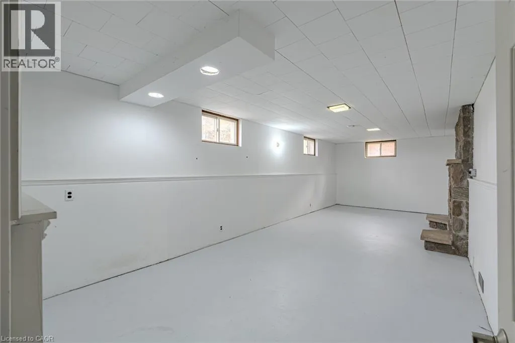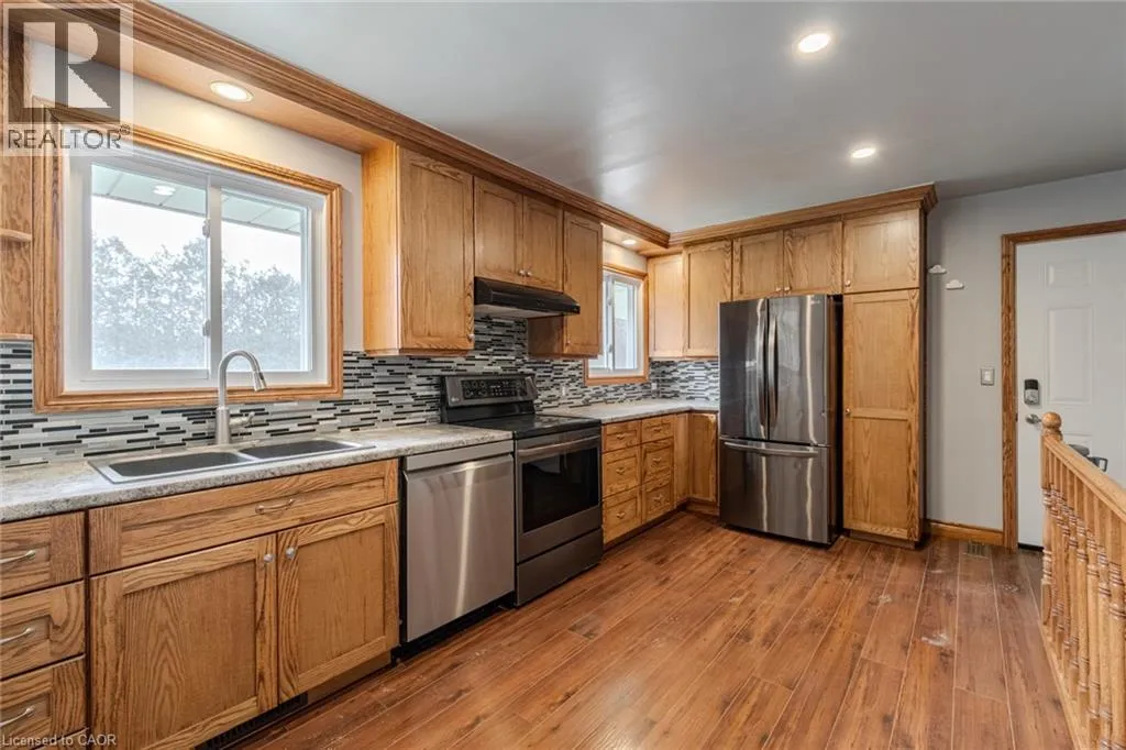 County Road 25 to eleventh concession Rd Donât miss this solid all-brick bungalow sitting on a generous country lot. Itâs peaceful, private, and still an easy jump to the 403 for commuters. Inside, the home offers a bright, open layout with abundant natural light, laminate flooring, a spacious living room with a wood-burning fireplace, and three excellent-sized bedrooms. The lower level features a rec-room with another fireplace. Youâll also find a clean, bright laundry room, storage and utility rooms, and direct access from the garage. A tandem double garage gives you all the room you need for parking, tools, hobbies, or a full-on workshop. Surrounded by farmland views, this property offers that true country feel without the isolation. (id:27476)