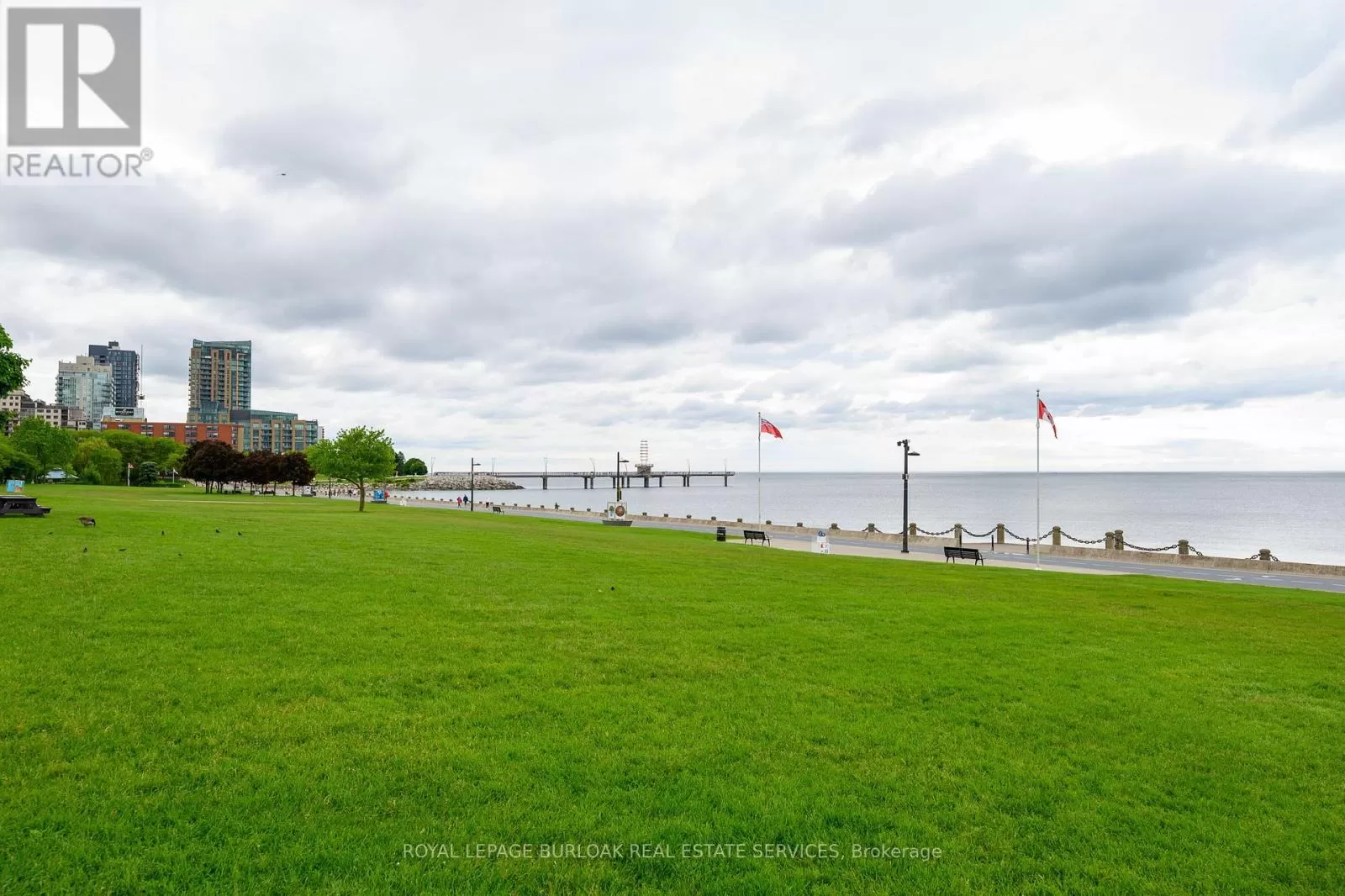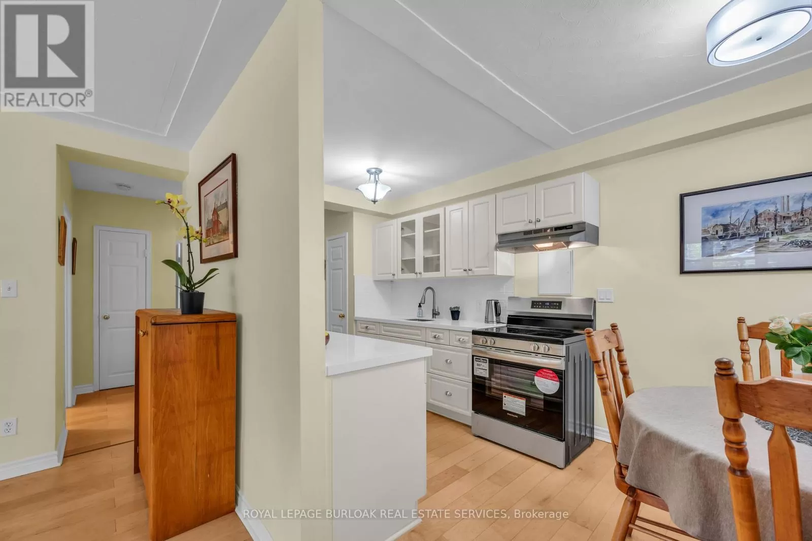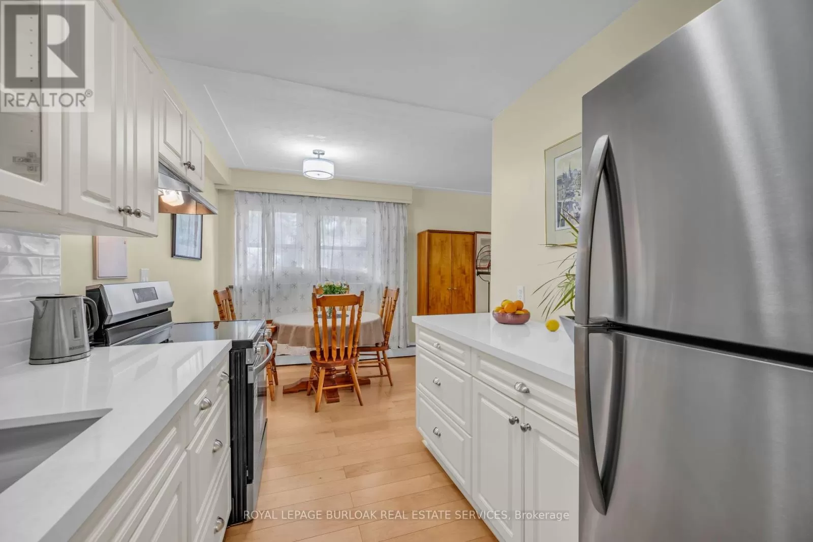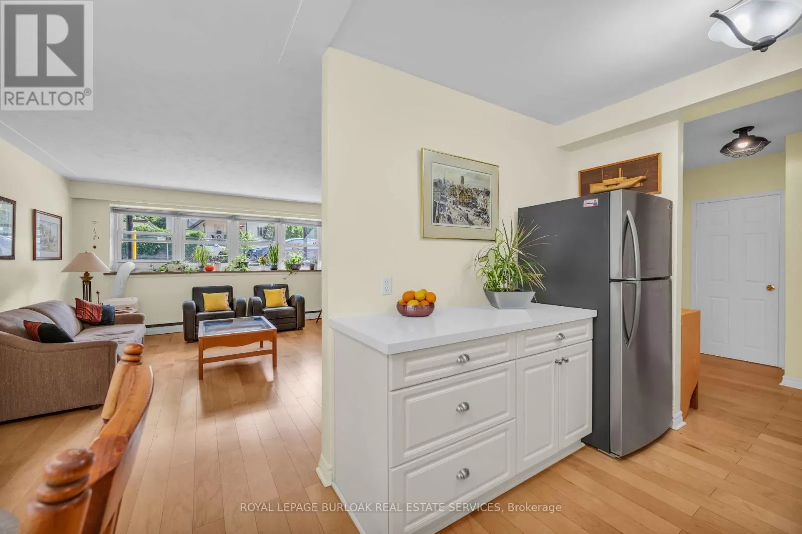 Lakeshore & Burlington Avenue An unbeatable location for this updated, bright and spacious, 1 bedroom corner unit at Lakeside Heights in downtown Burlington, directly across from Spencer Smith Park, literally steps to the lake, trails, and hospital, only a minute to the QEW, 403 and 407, and surrounded by just about every other amenity. Lakeside Heights is the premier co-op building in Burlington. This unit features 780sqft, an updated kitchen with quartz countertops, brand-new stainless steel fridge, stove, and range hood, backsplash, new sink and faucet, quality cabinetry with soft-close drawers, and a pantry, a dining area off of the kitchen with large window, a large living room with lots of windows, a spacious primary bedroom with 2 closets, an updated 4-piece bathroom with new vanity, porcelain countertop, faucet, showerhead, toilet, vinyl floors, and reglazed tub and wall tile, quality hardwood floors throughout, updated light fixtures, lots of closet/storage space, and freshly painted throughout. This unit is in a great location in the building, just a few steps to the laundry, the storage locker, the parking lot, and the secluded large and private back deck. The building has a great community feel, is very quiet, extremely well maintained, has a great condo committee, and a healthy reserve fund. The building also has an elevator, onsite laundry facility, and ample visitor parking. The monthly fee includes PROPERTY TAX, heat, water, cable, internet, storage locker, and exclusive parking space. Adults only. No rentals/leasing. No pets other than service animals. This unit shows pride of ownership, has many beautiful and very recent updates, and is move-in ready! Dont wait and miss this one! Welcome Home! (id:27476)