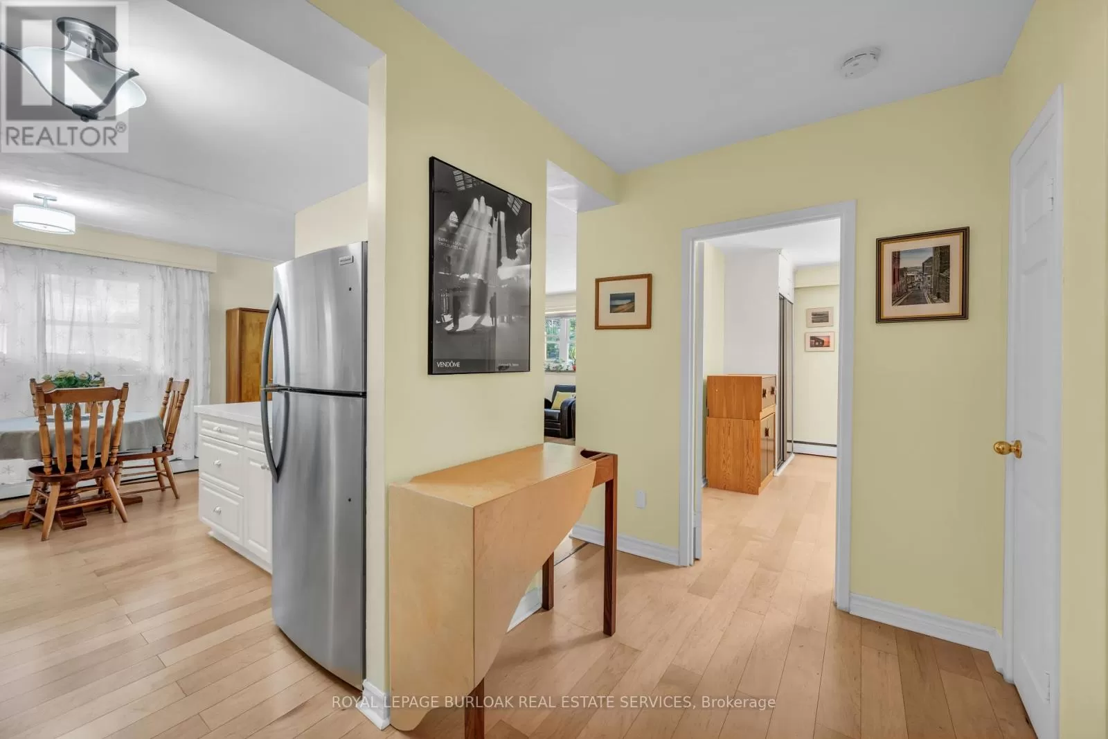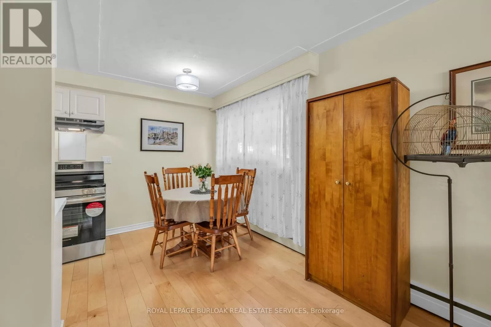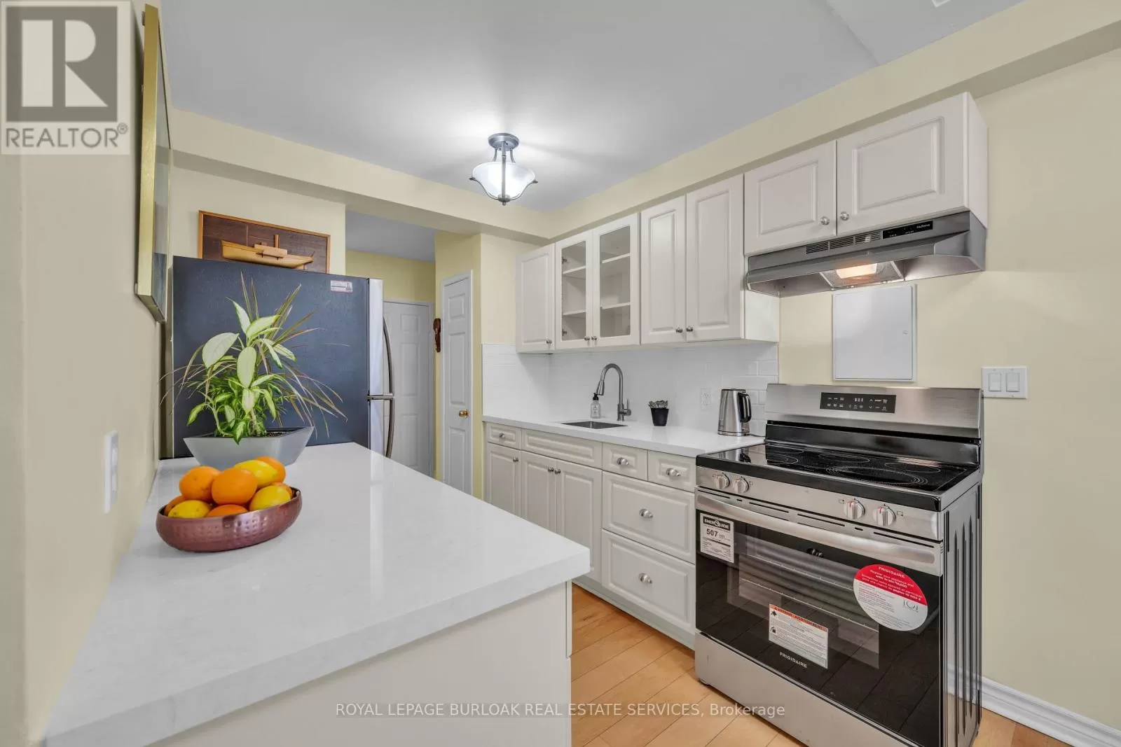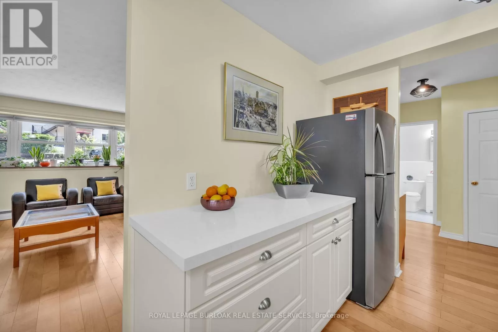Lakeshore & Burlington Avenue An unbeatable location for this updated, bright and spacious, 1 bedroom corner unit at Lakeside Heights in downtown Burlington, directly across from Spencer Smith Park, literally steps to the lake, trails, and hospital, only a minute to the QEW, 403 and 407, and surrounded by just about every other amenity. Lakeside Heights is the premier co-op building in Burlington. This unit features 780sqft, an updated kitchen with quartz countertops, brand-new stainless steel fridge, stove, and range hood, backsplash, new sink and faucet, quality cabinetry with soft-close drawers, and a pantry, a dining area off of the kitchen with large window, a large living room with lots of windows, a spacious primary bedroom with 2 closets, an updated 4-piece bathroom with new vanity, porcelain countertop, faucet, showerhead, toilet, vinyl floors, and reglazed tub and wall tile, quality hardwood floors throughout, updated light fixtures, lots of closet/storage space, and freshly painted throughout. This unit is in a great location in the building, just a few steps to the laundry, the storage locker, the parking lot, and the secluded large and private back deck. The building has a great community feel, is very quiet, extremely well maintained, has a great condo committee, and a healthy reserve fund. The building also has an elevator, onsite laundry facility, and ample visitor parking. The monthly fee includes PROPERTY TAX, heat, water, cable, internet, storage locker, and exclusive parking space. Adults only. No rentals/leasing. No pets other than service animals. This unit shows pride of ownership, has many beautiful and very recent updates, and is move-in ready! Dont wait and miss this one! Welcome Home! (id:27476)