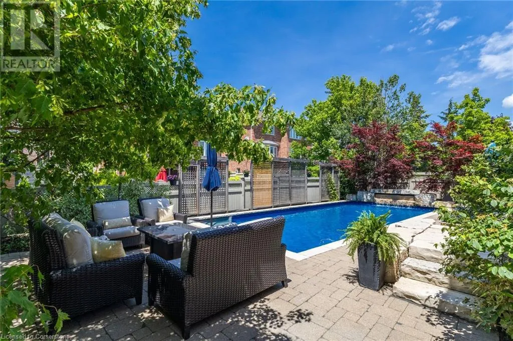 East of Walkers Line, Country Club to Berwick Drive Exceptional 2-storey home with over 4,900 sq ft of carpet-free, finished living space, showcasing thoughtful design and meticulous attention to detail. Impressive stone and brick exterior, interlocking double driveway, patios, and elegant light scaping. Curb appeal is outstanding. Welcoming two-storey foyer flooded with natural light, leading to a spacious and open main floor layout. Elegant living room features a gas fireplace and crown moulding, while the formal dining room accommodates large gatheringsâideal for entertaining. Grand staircase with Juliet balcony overlooks the impressive two-storey family room, with Palladian windows and a gas fireplace. The gourmet kitchen is a chefâs dream, featuring a large island, granite countertops, marble backsplash, gas cooktop, double wall ovens, wine fridge, and abundant cabinetry. The bright breakfast area, with bay window and built-in bench seating, offers views of the private backyard patio. A main floor office with custom built-ins, powder room, and laundry room with garage access complete the level. A second staircase off the kitchen adds convenience and ease of flow. Upstairs, the luxurious principal suite includes a 5-piece ensuite with dual vanities, a soaker tub, separate shower, and a large walk-in closet. The second bedroom features a 4-piece ensuite. Third and fourth bedrooms share a convenient Jack-and-Jill bathroom. Bright, spacious, fully finished lower level has oversized windows, a large rec room with fireplace, fifth bedroom with ensuite privilege to a 4-piece bath, an exercise room, and a utility/storage area. Private backyard oasis with heated saltwater inground pool and water feature includes a new liner and heater. Expansive patio offers both a lounging area and a cozy sitting area. Located on a quiet crescent, this exceptional home is just minutes from top-rated schools, parks, trails, shopping, dining, and access to Hwy 407. Truly a rare find in one of Burlingtonâs most desirable neighbourhoods. (id:27476)