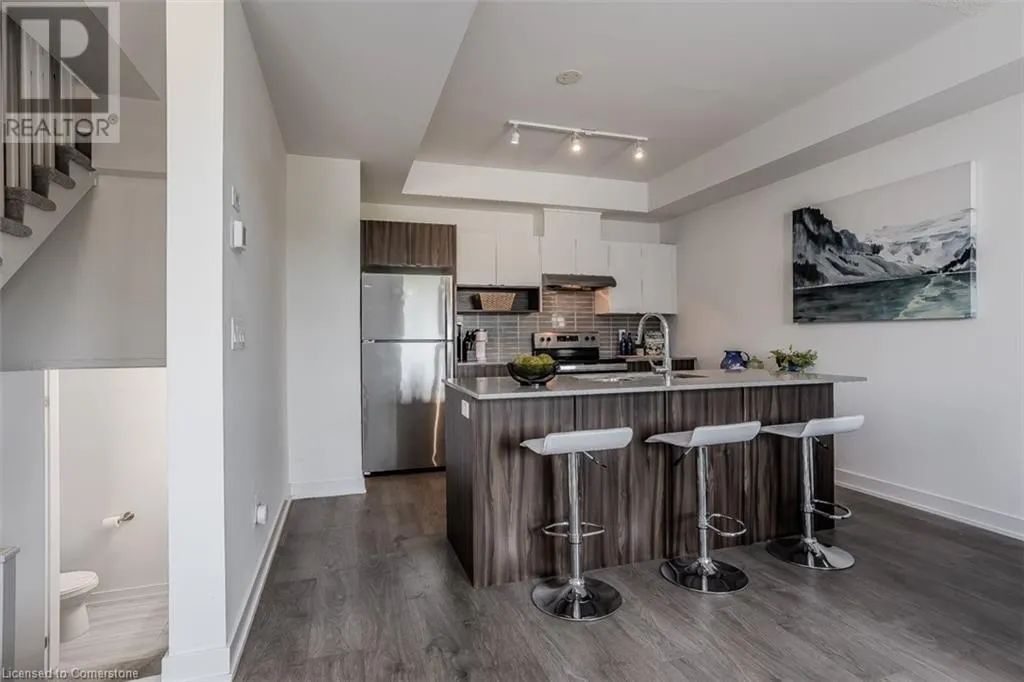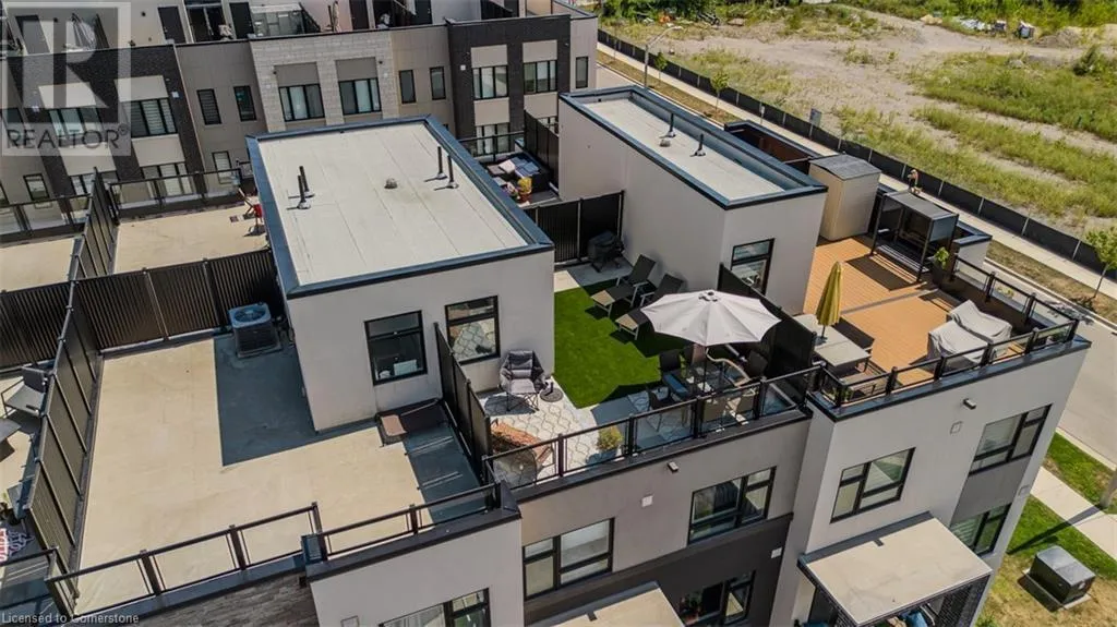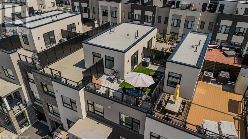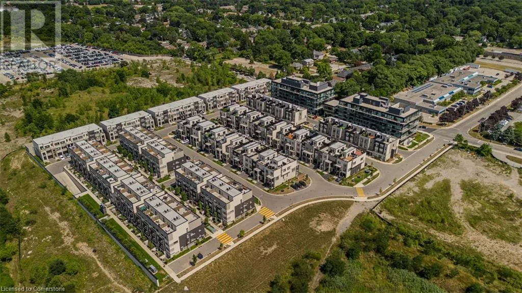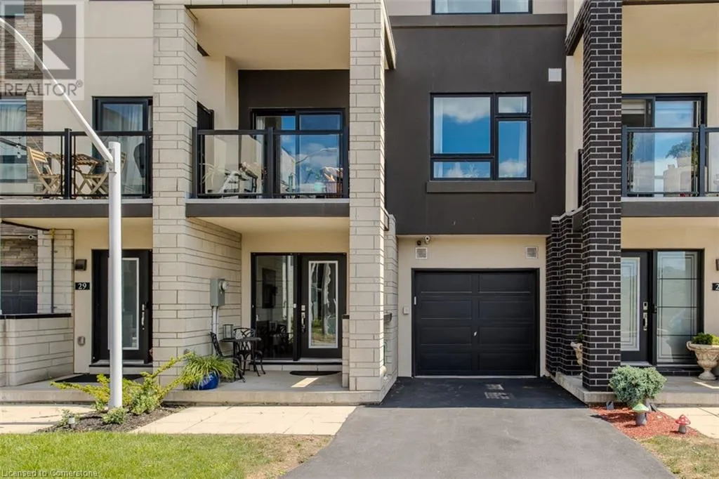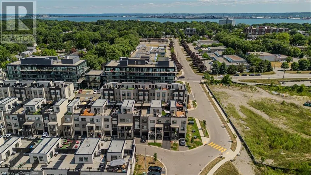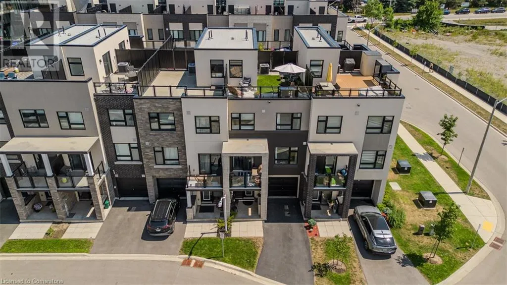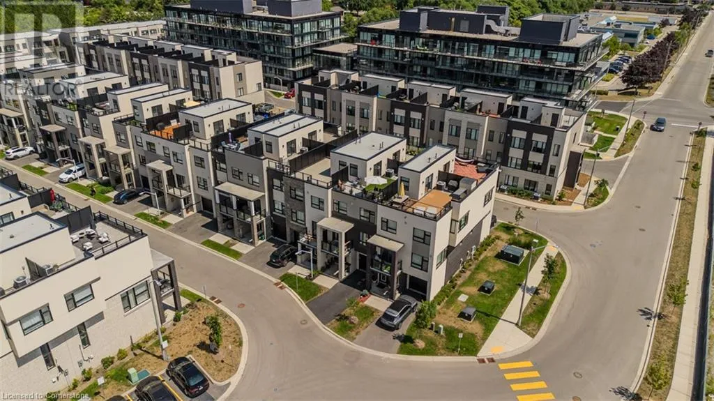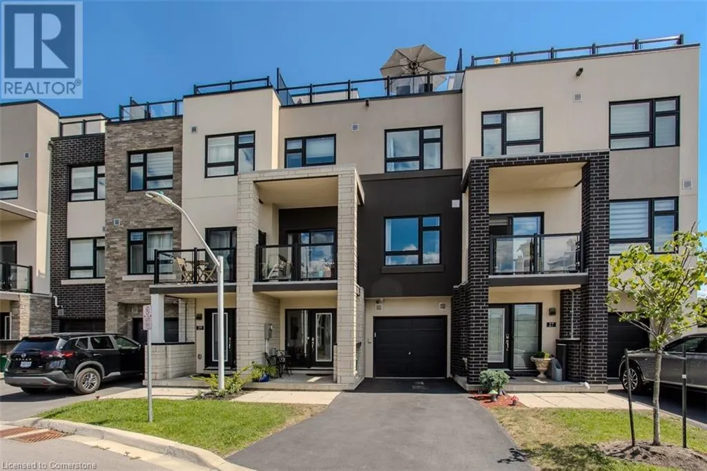 Waterdown Rd & Masonry Crt Welcome to this beautifully designed modern 3-storey townhome, perfectly located just minutes from the lake, downtown Burlington, parks, schools, and convenient transit options including the GO Station. Nestled in a quiet, family-friendly enclave, this pet-friendly home offers the ideal balance of comfort, style, and functionalityâperfect for growing families, young professionals, or anyone looking to enjoy the best of Burlington living. One of the rare highlights of this unit is the 2-car private drivewayâa unique feature that only two homes in the entire complex enjoy, providing unmatched parking convenience for your family and guests. Step into a bright and welcoming front entry with a convenient 2-piece powder room, perfect for guests. The second level showcases a seamless open-concept layout, ideal for both everyday living and entertaining. Wide plank laminate flooring flows throughout the spacious living and dining areas, where large windows and a walkout to your private balcony flood the space with natural light. At the heart of the home, the contemporary kitchen is sure to impressâfeaturing quartz countertops, stainless steel appliances, custom cabinetry, a stylish stacked tile backsplash, and a large island with breakfast bar, built-in microwave, and dishwasher. Upstairs, youâll find a bright and airy primary retreat complete with a 3-piece ensuite boasting an oversized quartz vanity, porcelain tile floors, and a sleek stacked-tile walk-in shower with a glass door. An additional well-sized bedroom and a 4-piece main bathâwith matching finishes and a tub/shower comboâoffer the perfect layout for a growing family, guests, or a home office. Top it all off with a private rooftop terrace offering pond views and a glass railingâan ideal space to relax, dine, or entertain under the open sky. Whether you're looking for your first home or a stylish, low-maintenance space for your family, this thoughtfully designed townhome checks all the boxes. (id:27476)