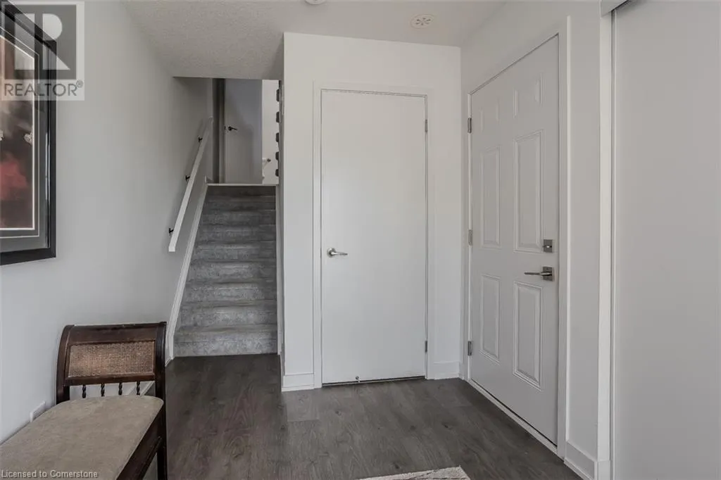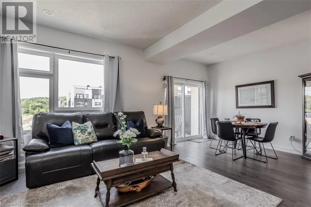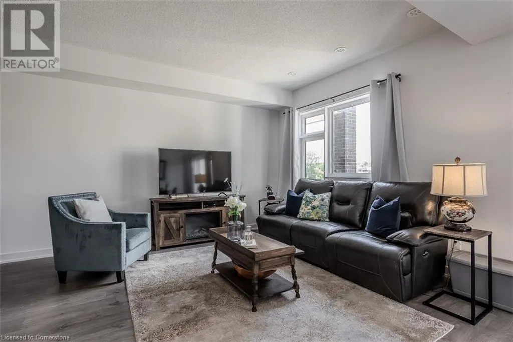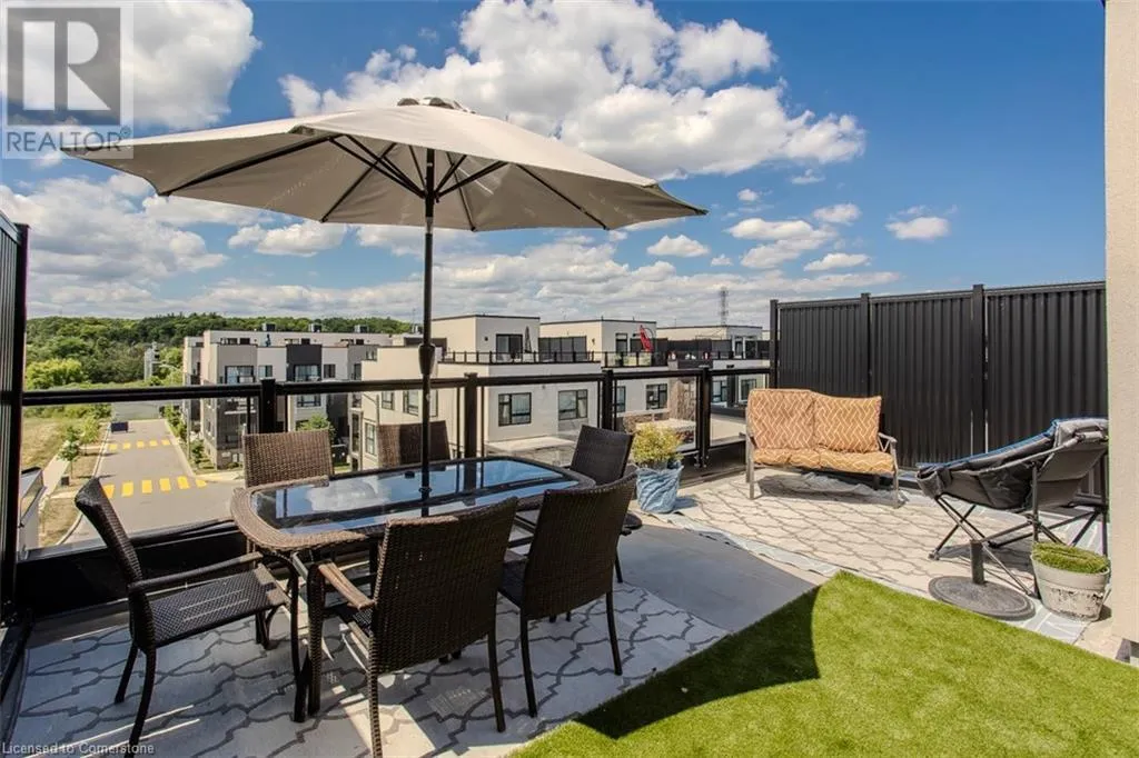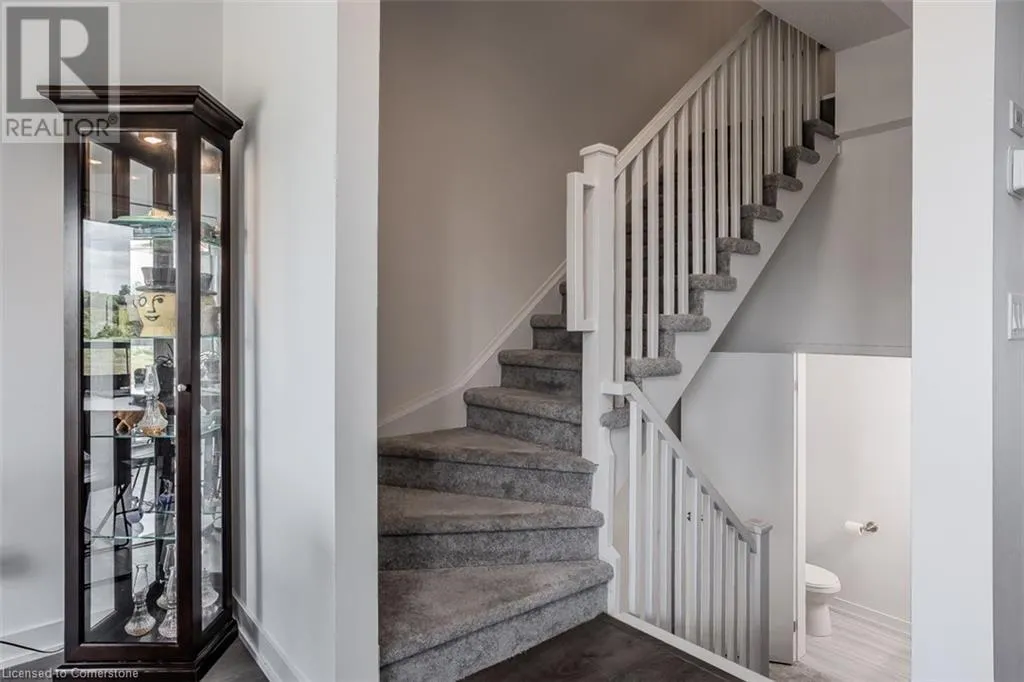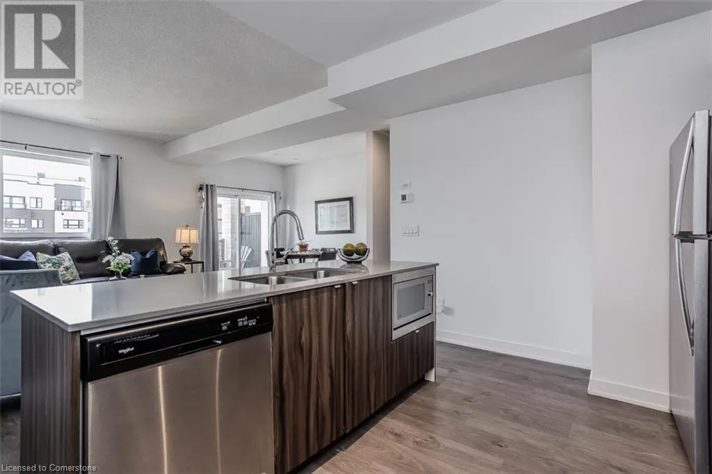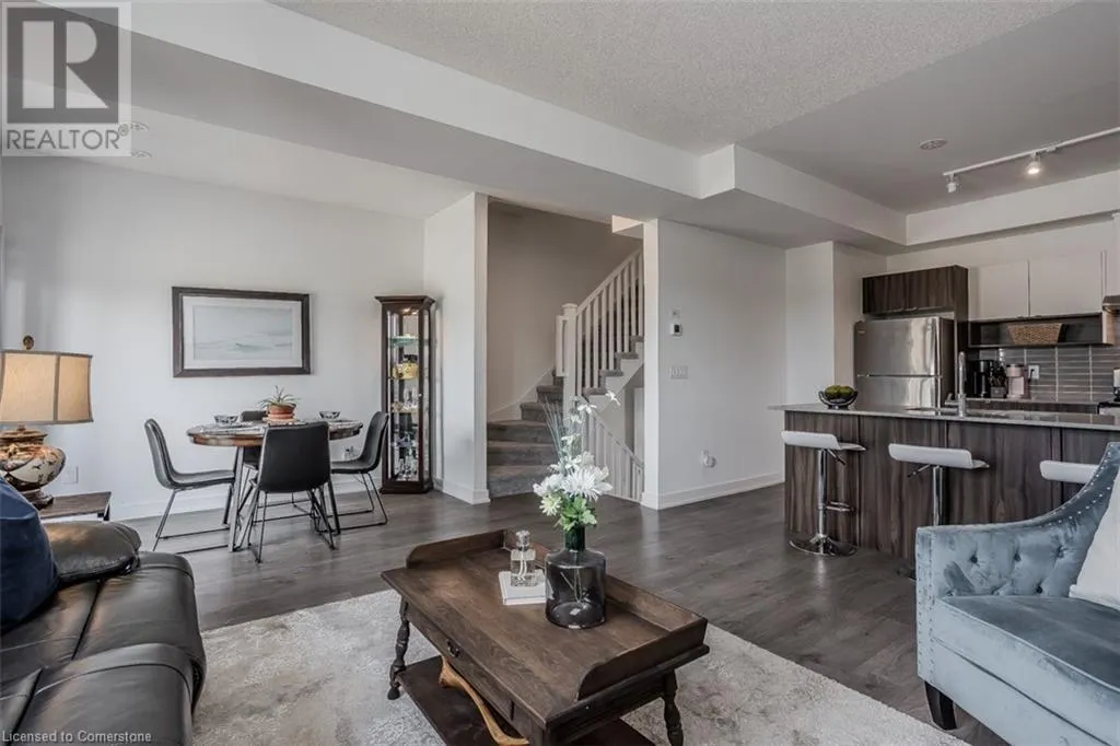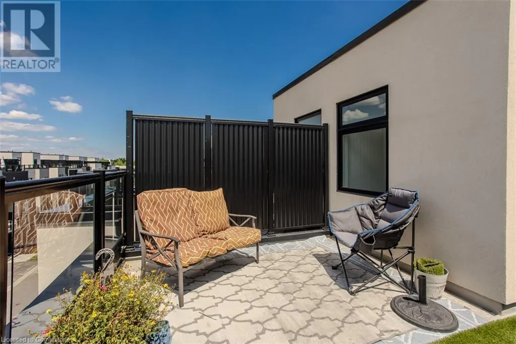Waterdown Rd & Masonry Crt Welcome to this beautifully designed modern 3-storey townhome, perfectly located just minutes from the lake, downtown Burlington, parks, schools, and convenient transit options including the GO Station. Nestled in a quiet, family-friendly enclave, this pet-friendly home offers the ideal balance of comfort, style, and functionalityâperfect for growing families, young professionals, or anyone looking to enjoy the best of Burlington living. One of the rare highlights of this unit is the 2-car private drivewayâa unique feature that only two homes in the entire complex enjoy, providing unmatched parking convenience for your family and guests. Step into a bright and welcoming front entry with a convenient 2-piece powder room, perfect for guests. The second level showcases a seamless open-concept layout, ideal for both everyday living and entertaining. Wide plank laminate flooring flows throughout the spacious living and dining areas, where large windows and a walkout to your private balcony flood the space with natural light. At the heart of the home, the contemporary kitchen is sure to impressâfeaturing quartz countertops, stainless steel appliances, custom cabinetry, a stylish stacked tile backsplash, and a large island with breakfast bar, built-in microwave, and dishwasher. Upstairs, youâll find a bright and airy primary retreat complete with a 3-piece ensuite boasting an oversized quartz vanity, porcelain tile floors, and a sleek stacked-tile walk-in shower with a glass door. An additional well-sized bedroom and a 4-piece main bathâwith matching finishes and a tub/shower comboâoffer the perfect layout for a growing family, guests, or a home office. Top it all off with a private rooftop terrace offering pond views and a glass railingâan ideal space to relax, dine, or entertain under the open sky. Whether you're looking for your first home or a stylish, low-maintenance space for your family, this thoughtfully designed townhome checks all the boxes. (id:27476)