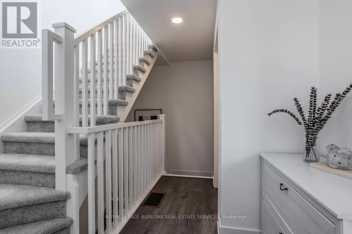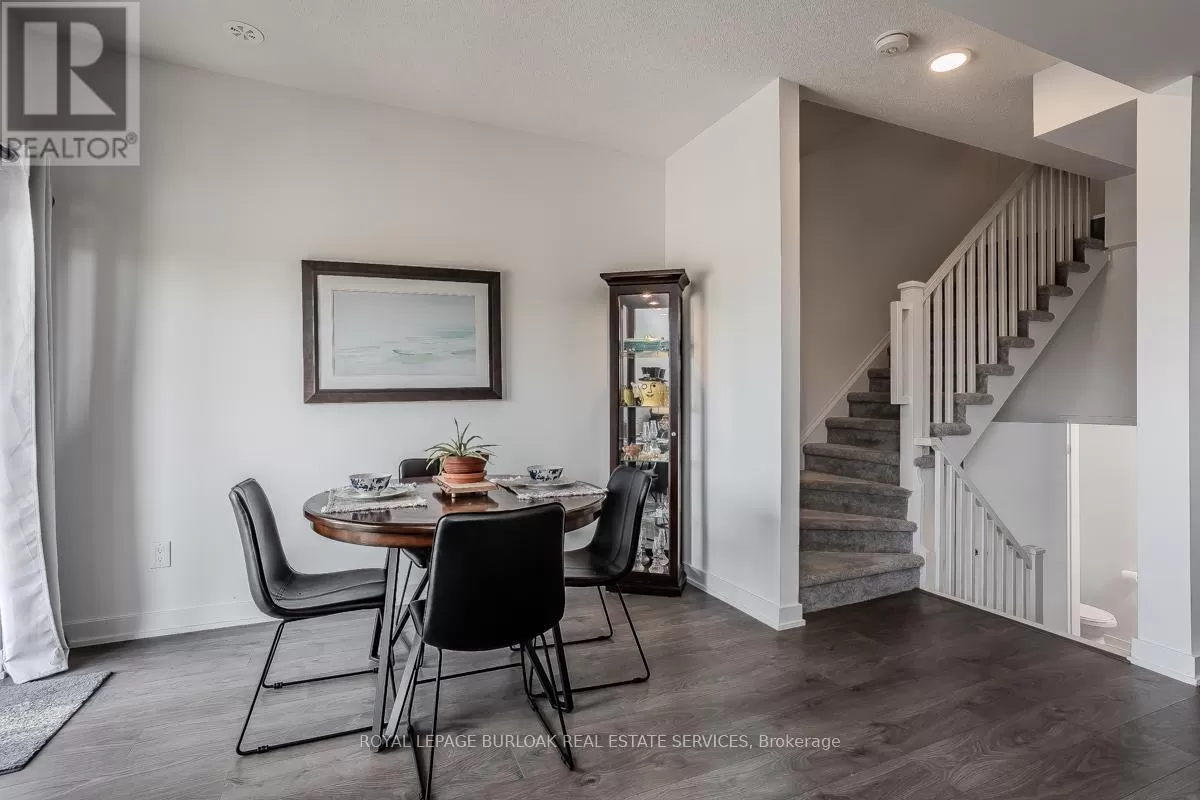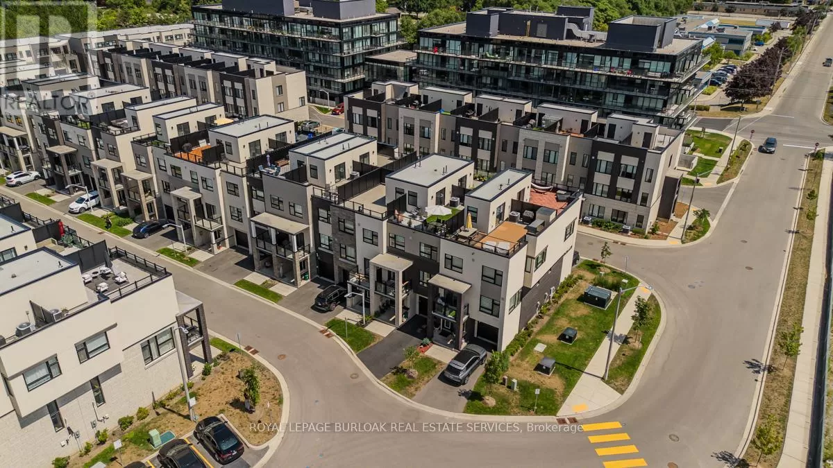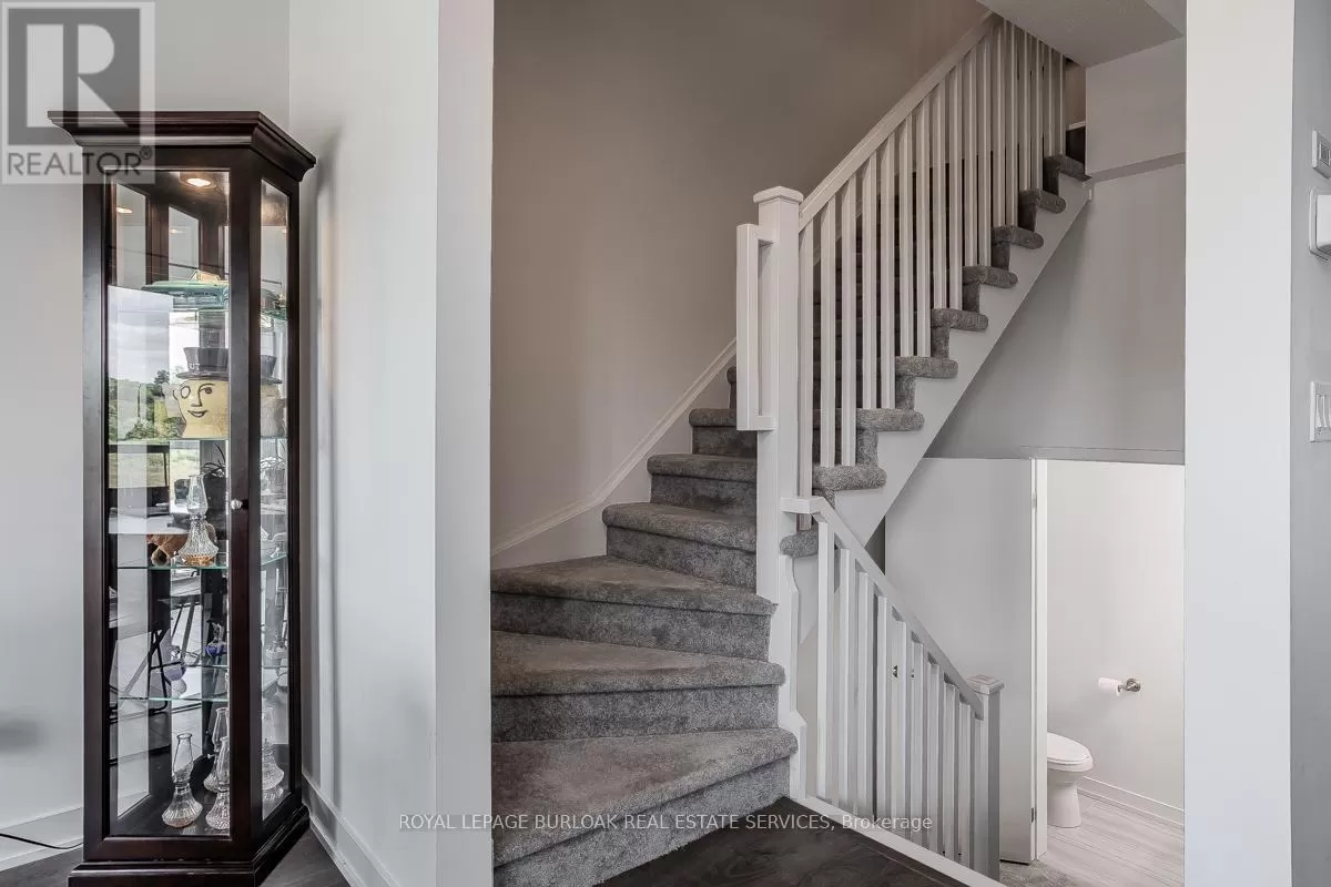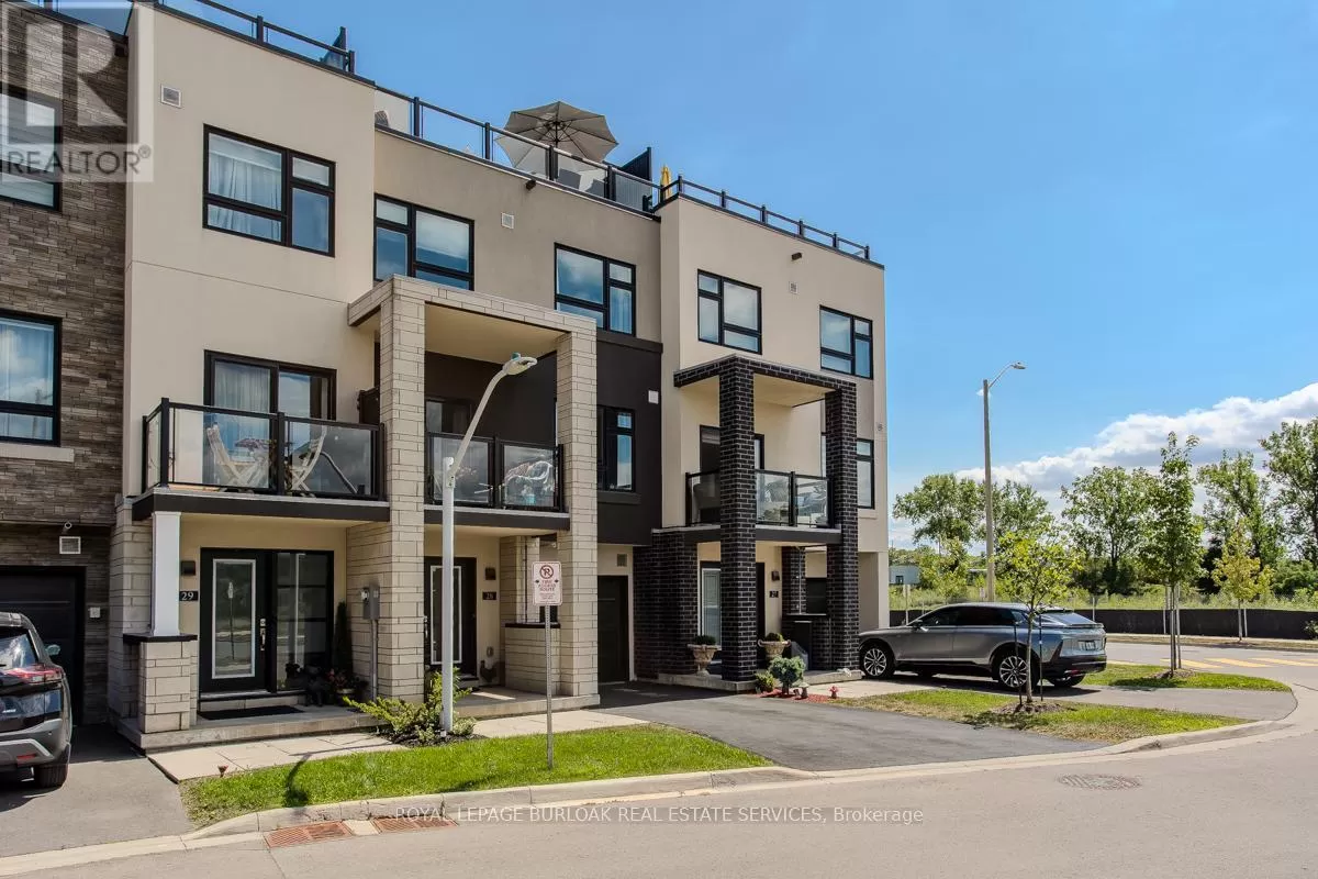 Waterdown Rd & Masonry Crt Welcome to this beautifully designed modern 3-storey townhome, perfectly located just minutes from the lake, downtown Burlington, parks, schools, and convenient transit options including the GO Station. Nestled in a quiet, family-friendly enclave, this pet-friendly home offers the ideal balance of comfort, style, and functionality perfect for growing families, young professionals, or anyone looking to enjoy the best of Burlington living. One of the rare highlights of this unit is the 2-car private driveway a unique feature that only two homes in the entire complex enjoy, providing unmatched parking convenience for your family and guests. Step into a bright and welcoming front entry with a convenient 2-piece powder room, perfect for guests. The second level showcases a seamless open-concept layout, ideal for both everyday living and entertaining. Wide plank laminate flooring flows throughout the spacious living and dining areas, where large windows and a walkout to your private balcony flood the space with natural light. At the heart of the home, the contemporary kitchen is sure to impress featuring quartz countertops, stainless steel appliances, custom cabinetry, a stylish stacked tile backsplash, and a large island with breakfast bar, built-in microwave, and dishwasher. Upstairs, you'll find a bright and airy primary retreat complete with a 3-piece ensuite boasting an oversized quartz vanity, porcelain tile floors, and a sleek stacked-tile walk-in shower with a glass door. An additional well-sized bedroom and a 4-piece main bath with matching finishes and a tub/shower combo offer the perfect layout for a growing family, guests, or a home office. Top it all off with a private rooftop terrace offering pond views and a glass railing an ideal space to relax, dine, or entertain under the open sky. Whether you're looking for your first home or a stylish, low-maintenance space for your family, this thoughtfully designed townhome checks all the boxes. (id:27476)