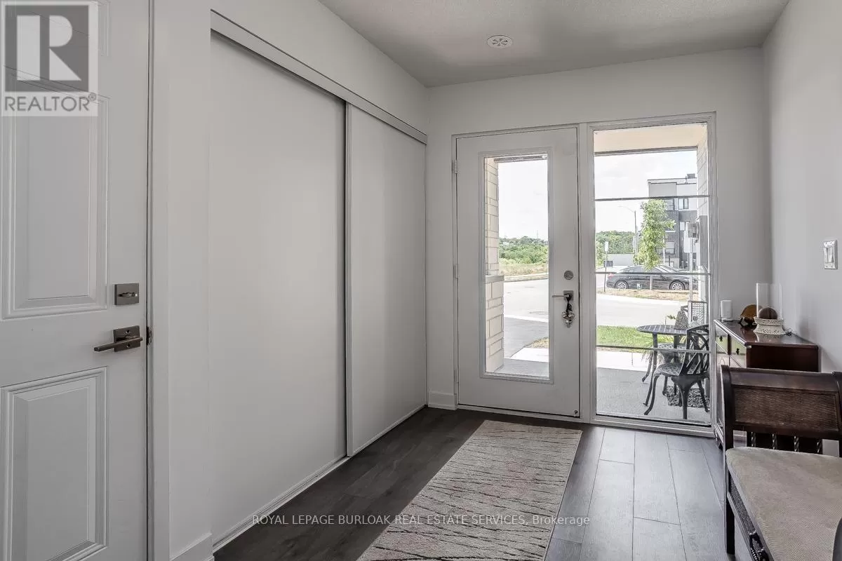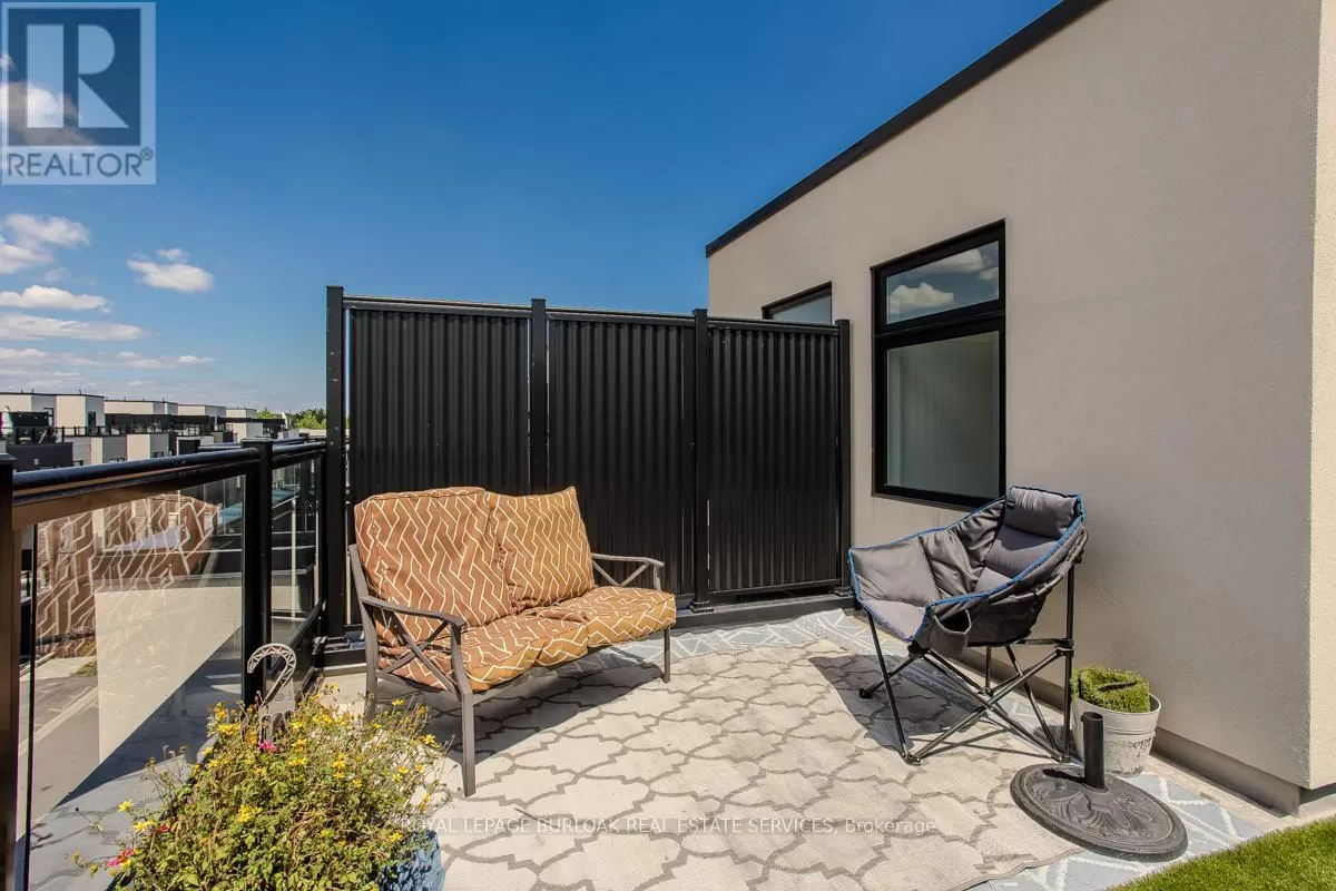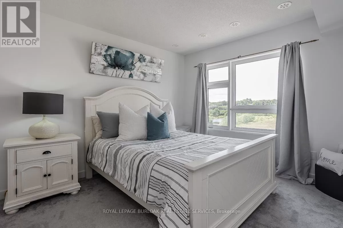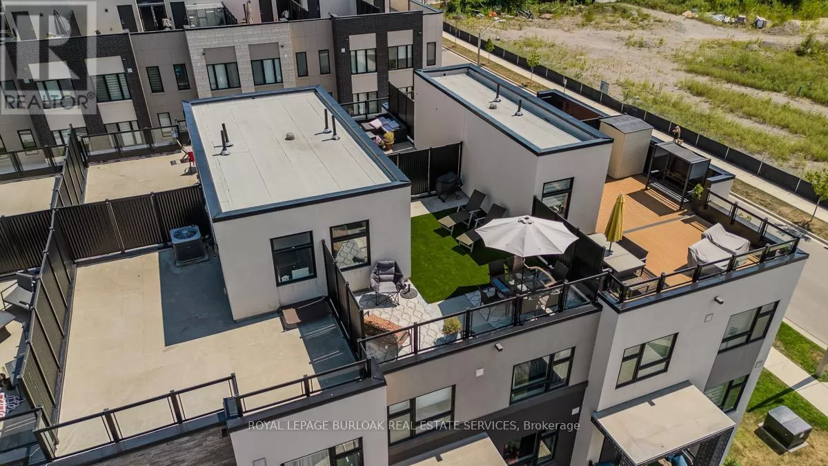 Waterdown Rd & Masonry Crt Welcome to this beautifully designed modern 3-storey townhome, perfectly located just minutes from the lake, downtown Burlington, parks, schools, and convenient transit options including the GO Station. Nestled in a quiet, family-friendly enclave, this pet-friendly home offers the ideal balance of comfort, style, and functionality perfect for growing families, young professionals, or anyone looking to enjoy the best of Burlington living. One of the rare highlights of this unit is the 2-car private driveway a unique feature that only two homes in the entire complex enjoy, providing unmatched parking convenience for your family and guests. Step into a bright and welcoming front entry with a convenient 2-piece powder room, perfect for guests. The second level showcases a seamless open-concept layout, ideal for both everyday living and entertaining. Wide plank laminate flooring flows throughout the spacious living and dining areas, where large windows and a walkout to your private balcony flood the space with natural light. At the heart of the home, the contemporary kitchen is sure to impress featuring quartz countertops, stainless steel appliances, custom cabinetry, a stylish stacked tile backsplash, and a large island with breakfast bar, built-in microwave, and dishwasher. Upstairs, you'll find a bright and airy primary retreat complete with a 3-piece ensuite boasting an oversized quartz vanity, porcelain tile floors, and a sleek stacked-tile walk-in shower with a glass door. An additional well-sized bedroom and a 4-piece main bath with matching finishes and a tub/shower combo offer the perfect layout for a growing family, guests, or a home office. Top it all off with a private rooftop terrace offering pond views and a glass railing an ideal space to relax, dine, or entertain under the open sky. Whether you're looking for your first home or a stylish, low-maintenance space for your family, this thoughtfully designed townhome checks all the boxes. (id:27476)