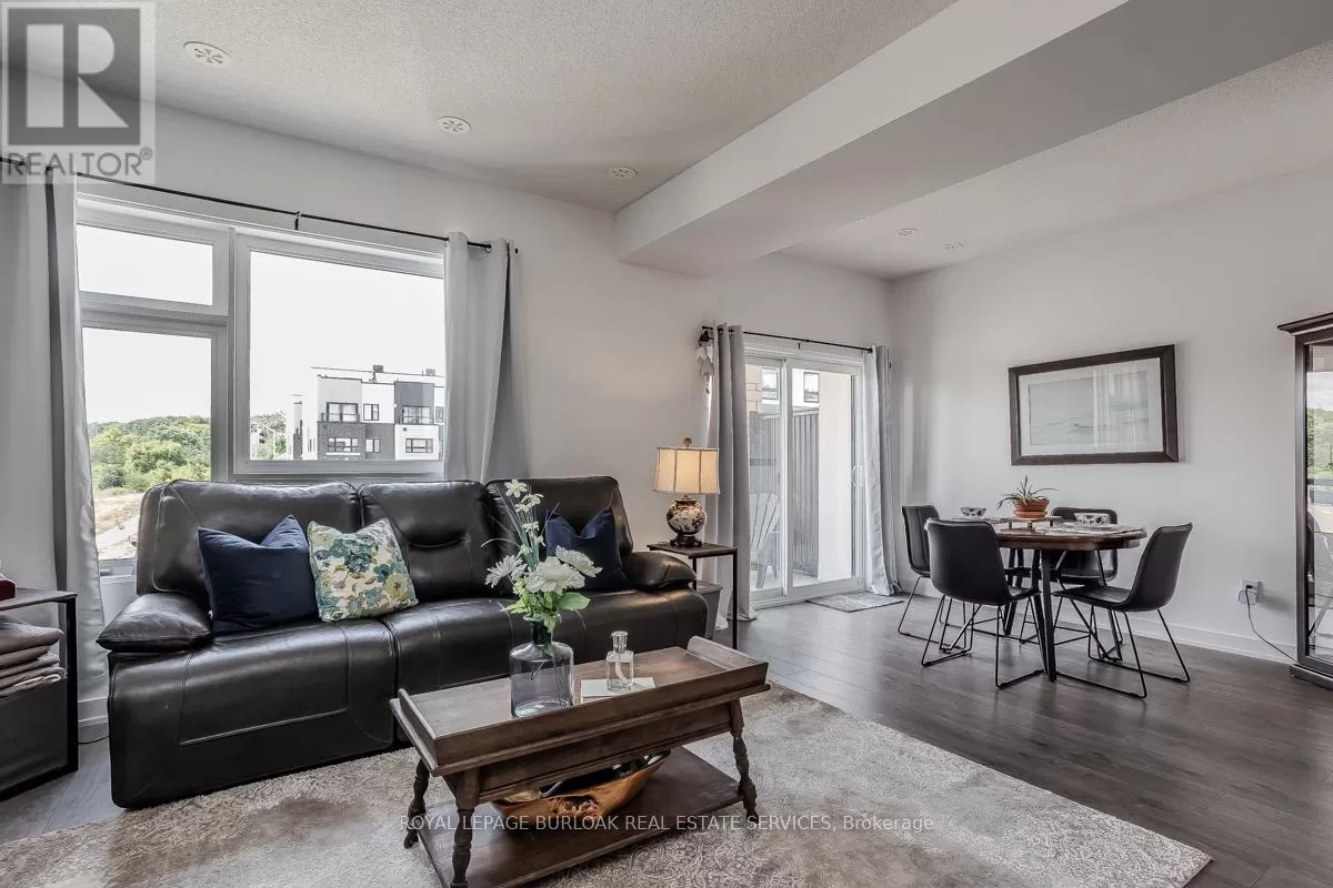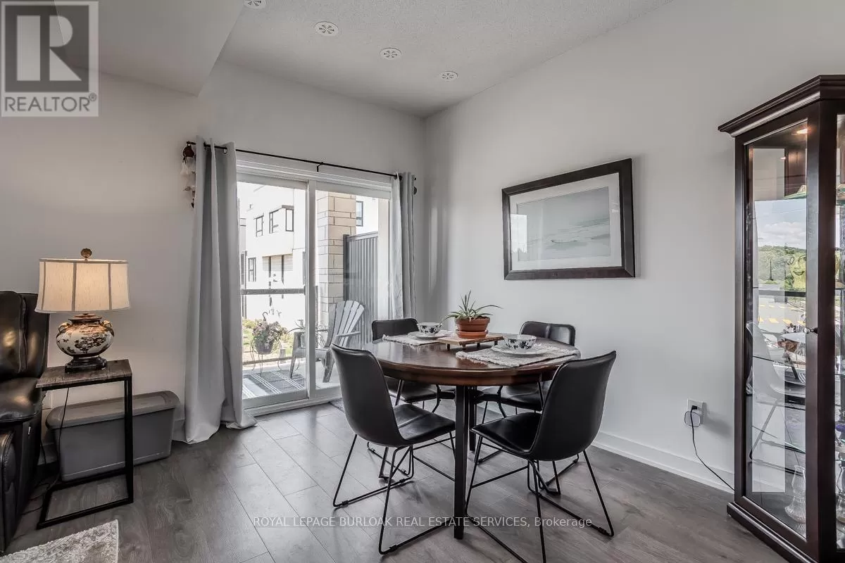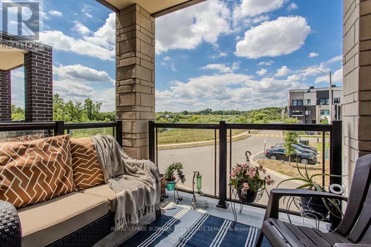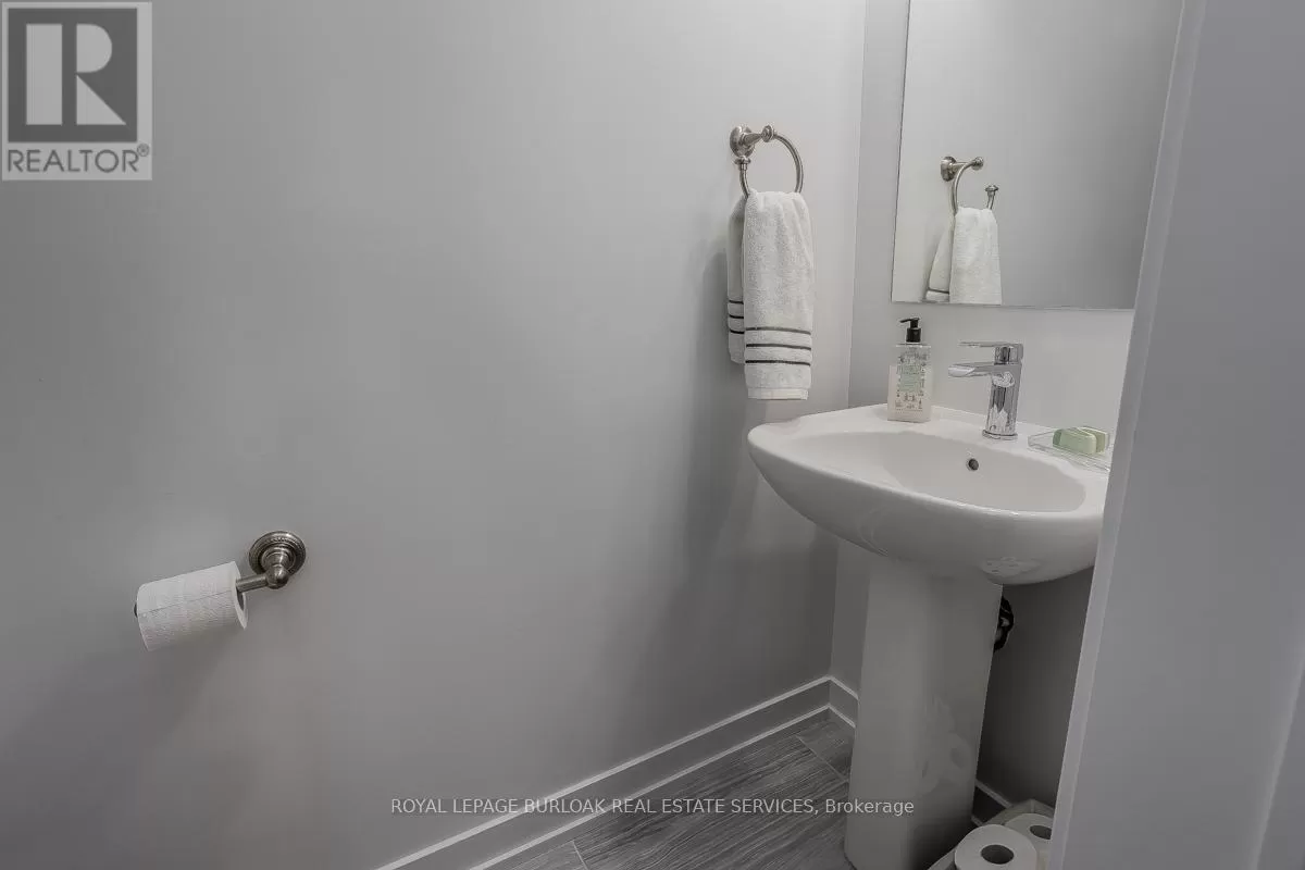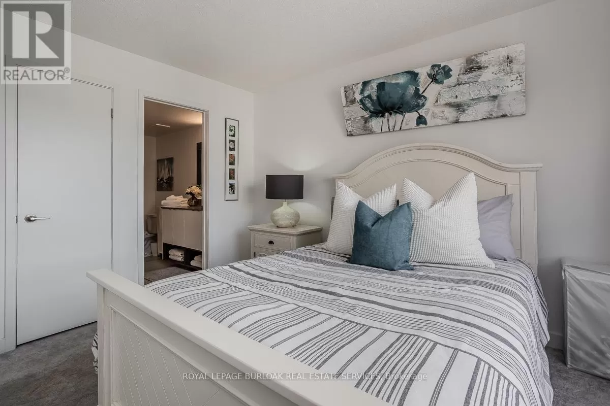 Waterdown Rd & Masonry Crt Welcome to this beautifully designed modern 3-storey townhome, perfectly located just minutes from the lake, downtown Burlington, parks, schools, and convenient transit options including the GO Station. Nestled in a quiet, family-friendly enclave, this pet-friendly home offers the ideal balance of comfort, style, and functionality perfect for growing families, young professionals, or anyone looking to enjoy the best of Burlington living. One of the rare highlights of this unit is the 2-car private driveway a unique feature that only two homes in the entire complex enjoy, providing unmatched parking convenience for your family and guests. Step into a bright and welcoming front entry with a convenient 2-piece powder room, perfect for guests. The second level showcases a seamless open-concept layout, ideal for both everyday living and entertaining. Wide plank laminate flooring flows throughout the spacious living and dining areas, where large windows and a walkout to your private balcony flood the space with natural light. At the heart of the home, the contemporary kitchen is sure to impress featuring quartz countertops, stainless steel appliances, custom cabinetry, a stylish stacked tile backsplash, and a large island with breakfast bar, built-in microwave, and dishwasher. Upstairs, you'll find a bright and airy primary retreat complete with a 3-piece ensuite boasting an oversized quartz vanity, porcelain tile floors, and a sleek stacked-tile walk-in shower with a glass door. An additional well-sized bedroom and a 4-piece main bath with matching finishes and a tub/shower combo offer the perfect layout for a growing family, guests, or a home office. Top it all off with a private rooftop terrace offering pond views and a glass railing an ideal space to relax, dine, or entertain under the open sky. Whether you're looking for your first home or a stylish, low-maintenance space for your family, this thoughtfully designed townhome checks all the boxes. (id:27476)