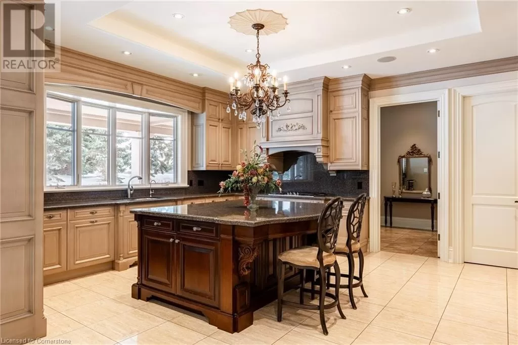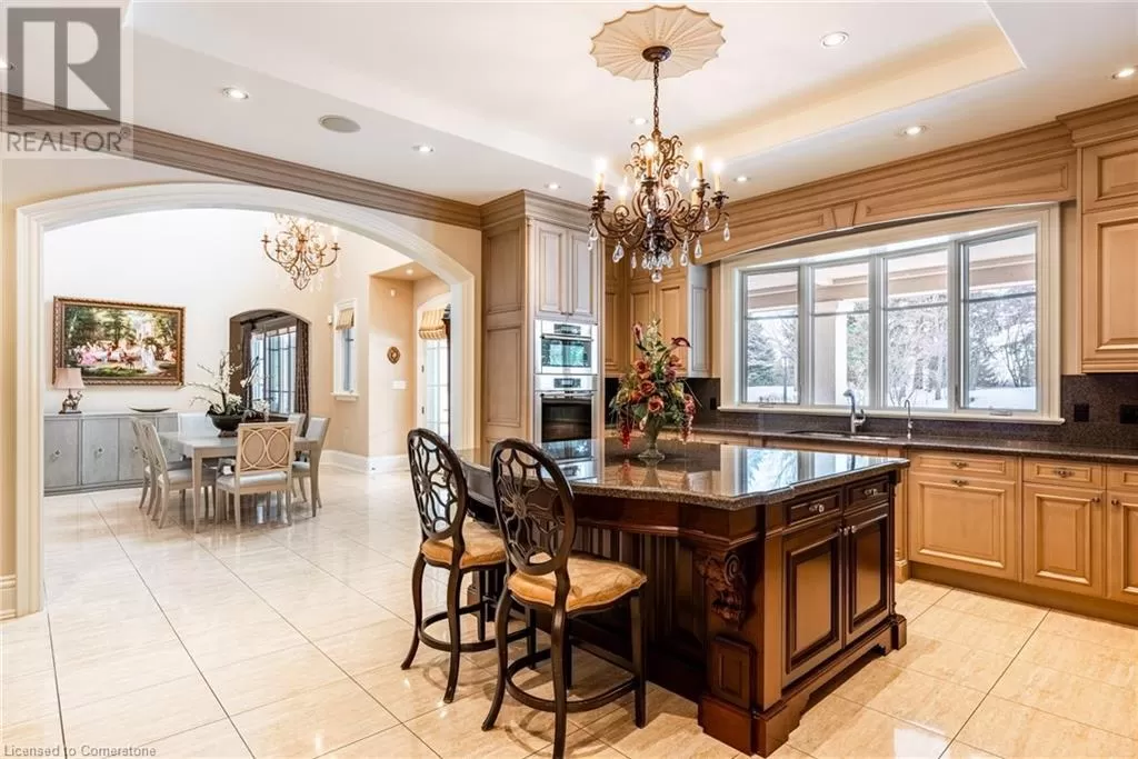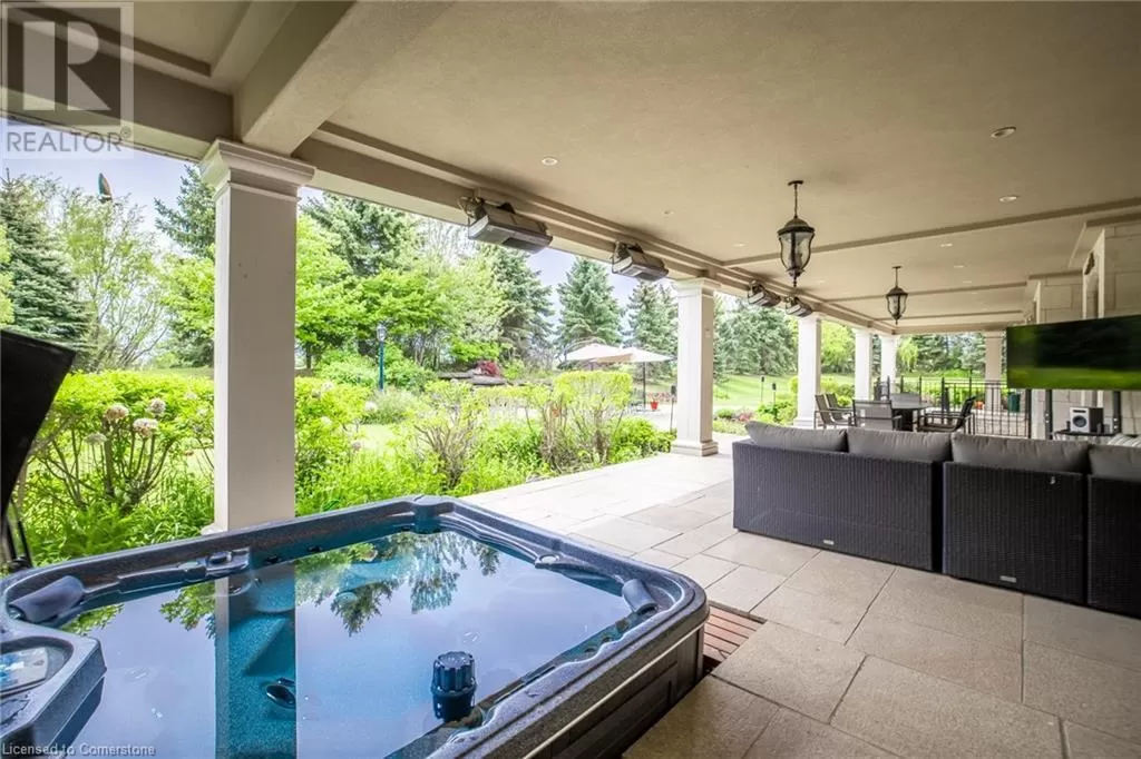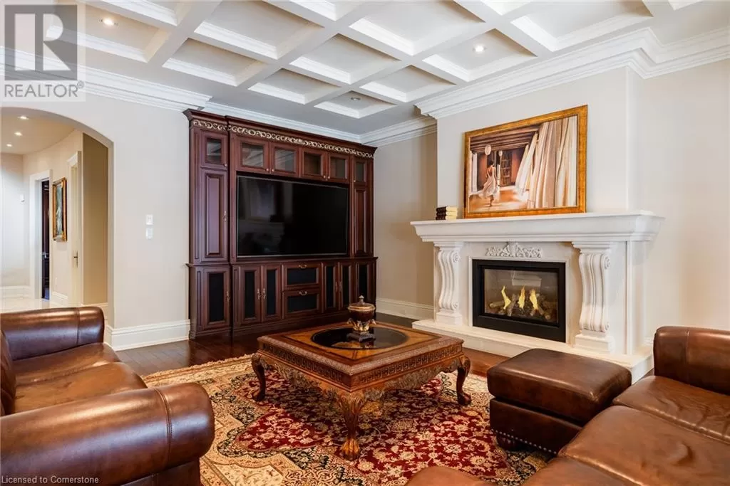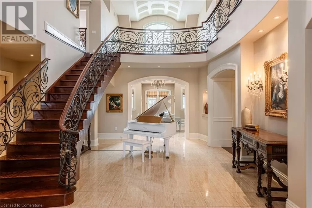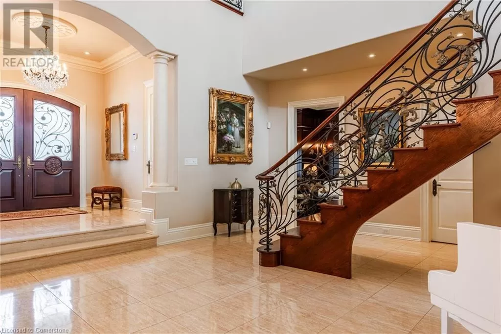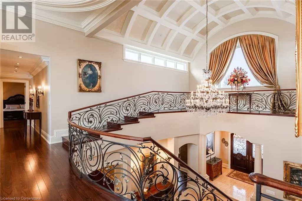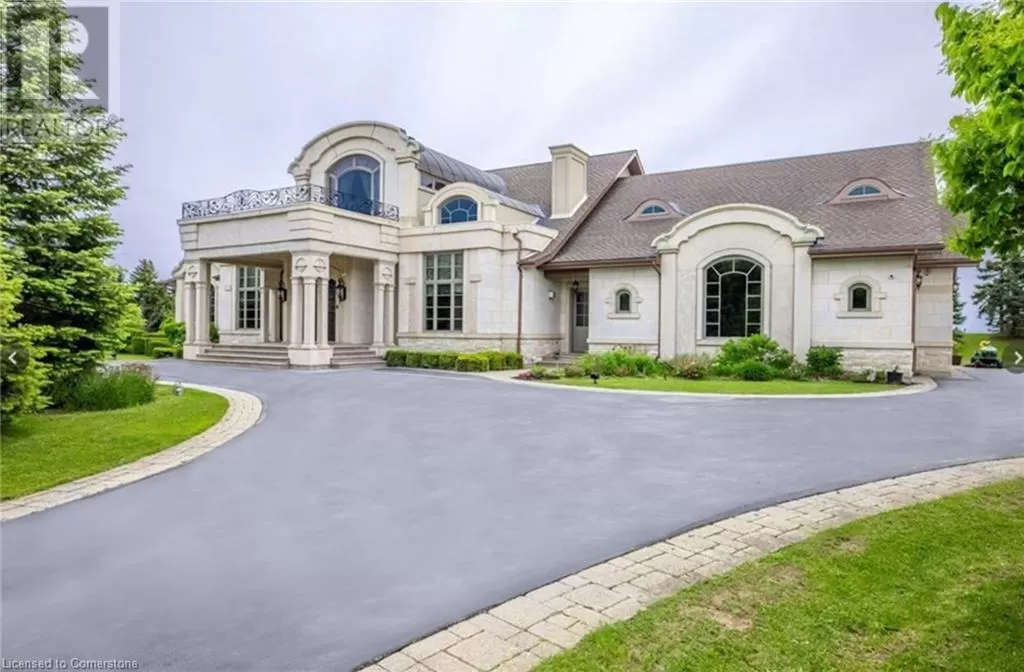 NORTH ON GUELPH LINE, RIGHT ON BLUFFS WAY Impeccably nestled in The Bluffs, this extraordinary estate spans over 11,000 sqft. of luxurious living space on approx two acres of treed property. Blending modern sophistication with traditional elegance, this home offers an unparalleled lifestyle in a breathtaking setting. From the moment you step into the grand foyer, the impeccable craftsmanship and seamless flow set the tone for refined living. Architectural excellence is showcased through soaring coffered ceilings, expansive windows, & an intricate wrought-iron staircase. The chefâs kitchen is a culinary masterpiece, boasting a walk-in pantry, top-tier custom cabinetry, & premium appliances. A spacious breakfast room opens to the beautifully landscaped backyard, where a heated covered lanai provides the perfect setting for outdoor relaxation. The main-floor primary suite is a private retreat, featuring a cozy F/P, his and her walk-in closets, & a lavish 6pc spa-inspired ensuite. Adding to its allure, an adjoining sunroom offers direct access to the backyard, creating a seamless indoor-outdoor experience. A richly appointed home office, complete with wood paneling & built-in cabinetry, provides an ideal workspace. The second level hosts 3 additional bedrooms, while the lower level is designed for ultimate comfort, entertainment, & hosting unforgettable events. Here, youâll find a full bar, oversized wine cellar, & a dance floor, along with a state-of-the-art home theatre, a gym, a gentlemanâs cigar room, & a spa-inspired bath with a stone steam sauna, walk-in shower, & radiant floor heating. A 5th bedroom completes this level, offering flexibility for guests or extended family. For car enthusiasts, the impressive heated 3-car garage is outfitted with 2 lifts, allowing for up to 6 vehicles to be stored with ease. Built-in speakers throughout the home further enhance the ambiance, providing a seamless audio experience indoors & out. Minutes from major highways & Burlingtonâs finest amenities. LUXURY CERTIFIED (id:27476)