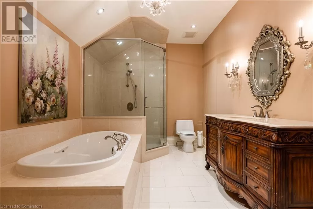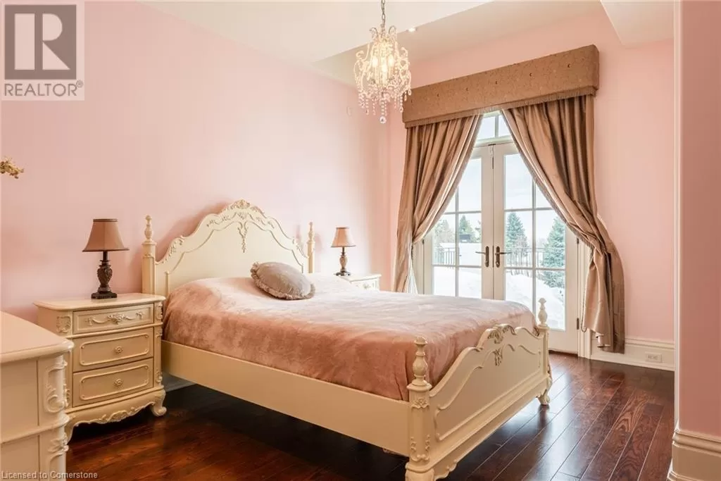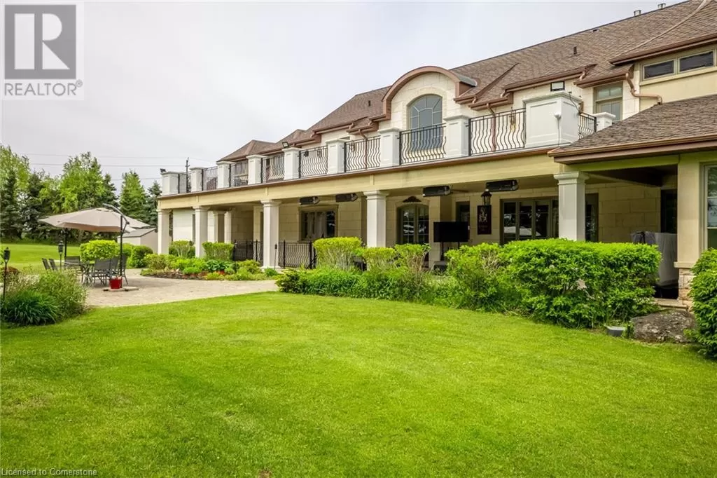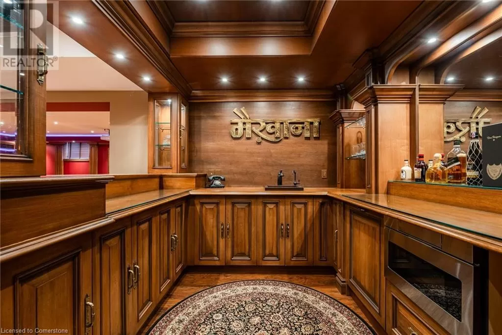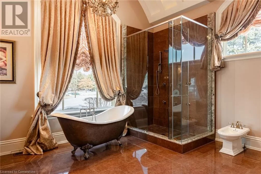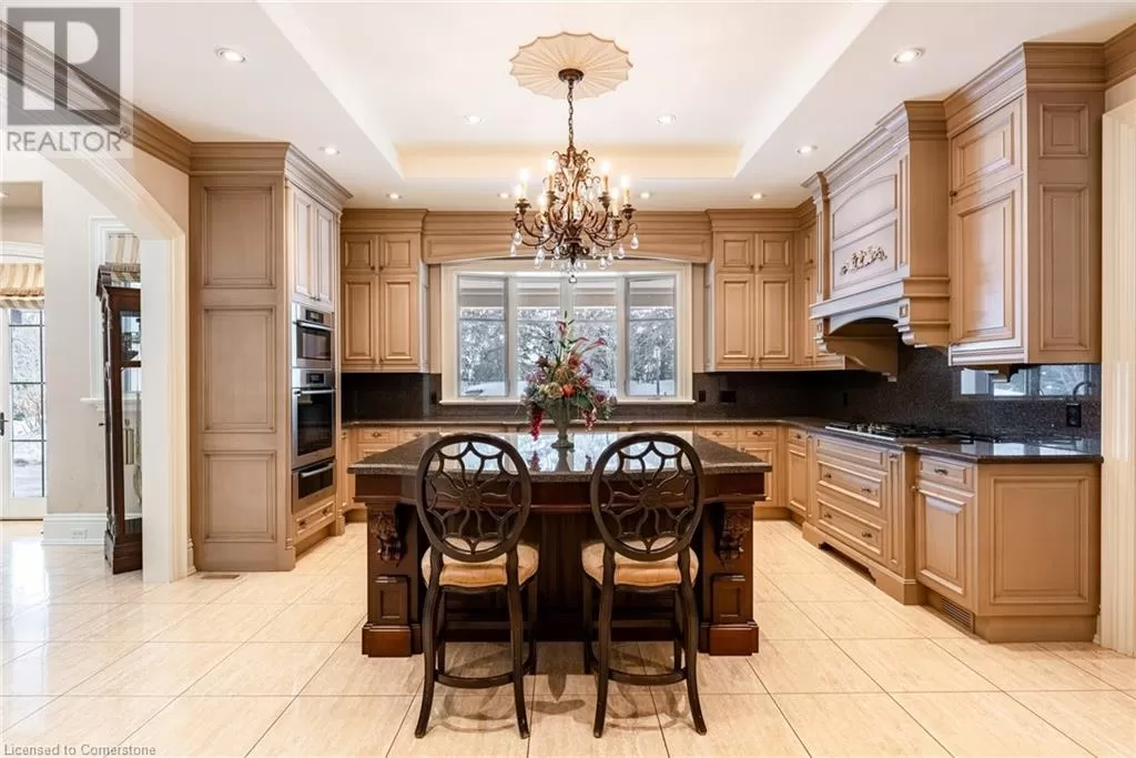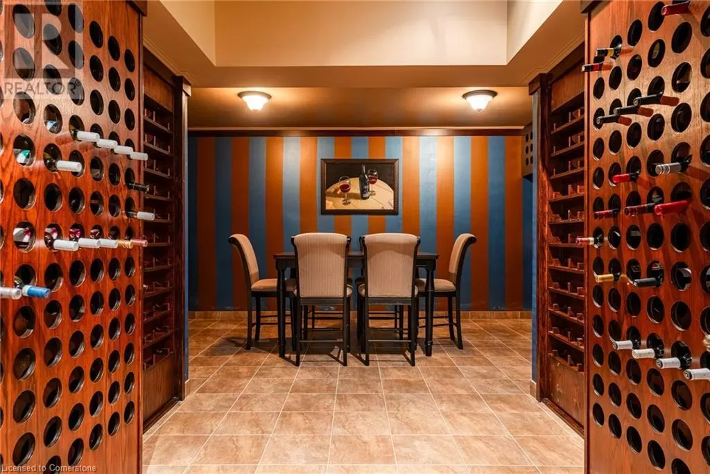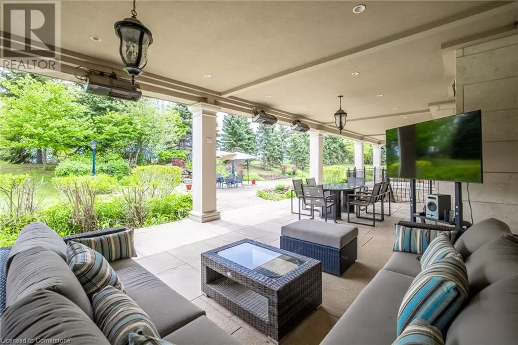 NORTH ON GUELPH LINE, RIGHT ON BLUFFS WAY Impeccably nestled in The Bluffs, this extraordinary estate spans over 11,000 sqft. of luxurious living space on approx two acres of treed property. Blending modern sophistication with traditional elegance, this home offers an unparalleled lifestyle in a breathtaking setting. From the moment you step into the grand foyer, the impeccable craftsmanship and seamless flow set the tone for refined living. Architectural excellence is showcased through soaring coffered ceilings, expansive windows, & an intricate wrought-iron staircase. The chefâs kitchen is a culinary masterpiece, boasting a walk-in pantry, top-tier custom cabinetry, & premium appliances. A spacious breakfast room opens to the beautifully landscaped backyard, where a heated covered lanai provides the perfect setting for outdoor relaxation. The main-floor primary suite is a private retreat, featuring a cozy F/P, his and her walk-in closets, & a lavish 6pc spa-inspired ensuite. Adding to its allure, an adjoining sunroom offers direct access to the backyard, creating a seamless indoor-outdoor experience. A richly appointed home office, complete with wood paneling & built-in cabinetry, provides an ideal workspace. The second level hosts 3 additional bedrooms, while the lower level is designed for ultimate comfort, entertainment, & hosting unforgettable events. Here, youâll find a full bar, oversized wine cellar, & a dance floor, along with a state-of-the-art home theatre, a gym, a gentlemanâs cigar room, & a spa-inspired bath with a stone steam sauna, walk-in shower, & radiant floor heating. A 5th bedroom completes this level, offering flexibility for guests or extended family. For car enthusiasts, the impressive heated 3-car garage is outfitted with 2 lifts, allowing for up to 6 vehicles to be stored with ease. Built-in speakers throughout the home further enhance the ambiance, providing a seamless audio experience indoors & out. Minutes from major highways & Burlingtonâs finest amenities. LUXURY CERTIFIED (id:27476)