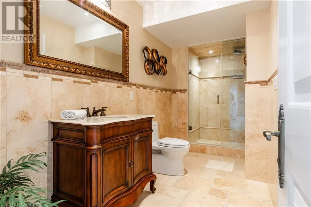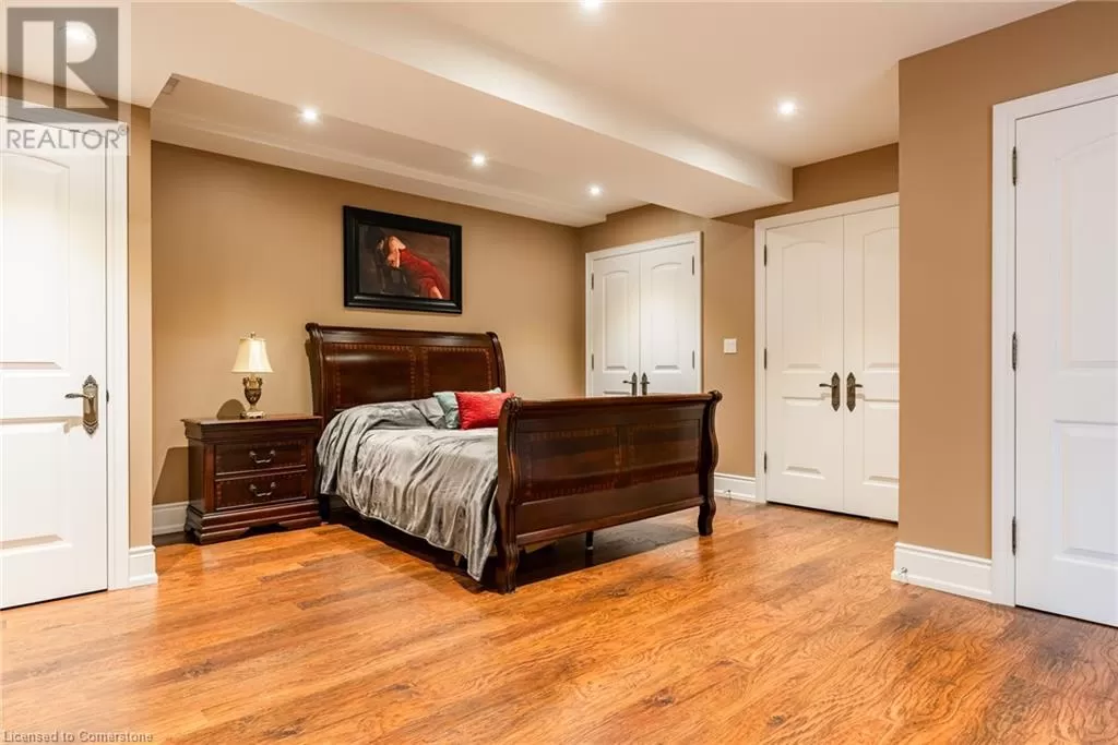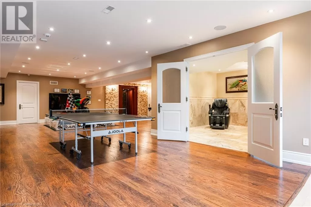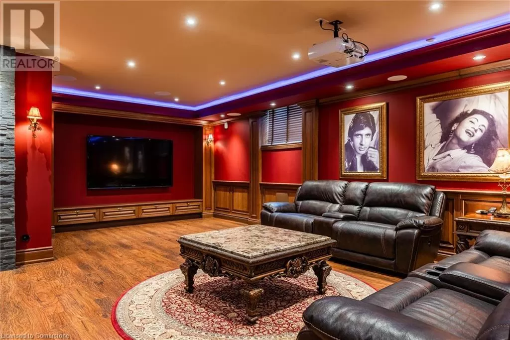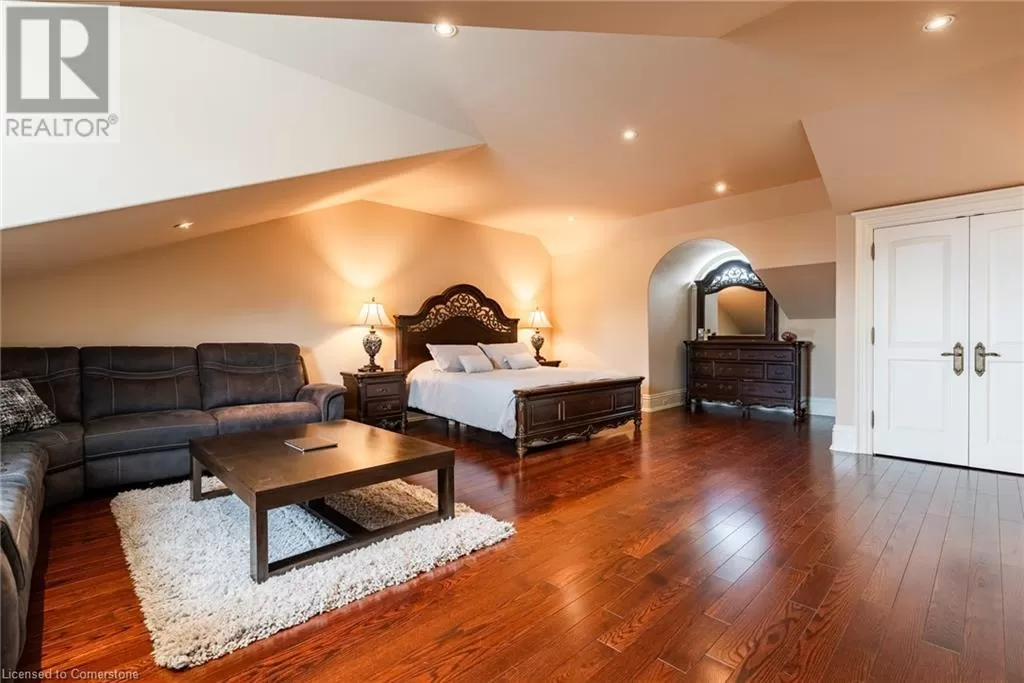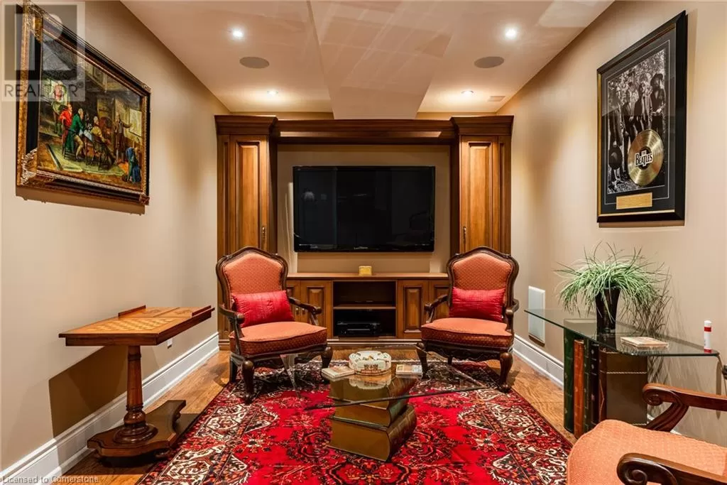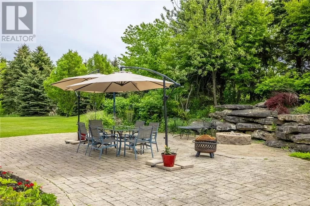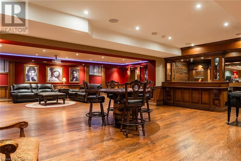 NORTH ON GUELPH LINE, RIGHT ON BLUFFS WAY Impeccably nestled in The Bluffs, this extraordinary estate spans over 11,000 sqft. of luxurious living space on approx two acres of treed property. Blending modern sophistication with traditional elegance, this home offers an unparalleled lifestyle in a breathtaking setting. From the moment you step into the grand foyer, the impeccable craftsmanship and seamless flow set the tone for refined living. Architectural excellence is showcased through soaring coffered ceilings, expansive windows, & an intricate wrought-iron staircase. The chefâs kitchen is a culinary masterpiece, boasting a walk-in pantry, top-tier custom cabinetry, & premium appliances. A spacious breakfast room opens to the beautifully landscaped backyard, where a heated covered lanai provides the perfect setting for outdoor relaxation. The main-floor primary suite is a private retreat, featuring a cozy F/P, his and her walk-in closets, & a lavish 6pc spa-inspired ensuite. Adding to its allure, an adjoining sunroom offers direct access to the backyard, creating a seamless indoor-outdoor experience. A richly appointed home office, complete with wood paneling & built-in cabinetry, provides an ideal workspace. The second level hosts 3 additional bedrooms, while the lower level is designed for ultimate comfort, entertainment, & hosting unforgettable events. Here, youâll find a full bar, oversized wine cellar, & a dance floor, along with a state-of-the-art home theatre, a gym, a gentlemanâs cigar room, & a spa-inspired bath with a stone steam sauna, walk-in shower, & radiant floor heating. A 5th bedroom completes this level, offering flexibility for guests or extended family. For car enthusiasts, the impressive heated 3-car garage is outfitted with 2 lifts, allowing for up to 6 vehicles to be stored with ease. Built-in speakers throughout the home further enhance the ambiance, providing a seamless audio experience indoors & out. Minutes from major highways & Burlingtonâs finest amenities. LUXURY CERTIFIED (id:27476)