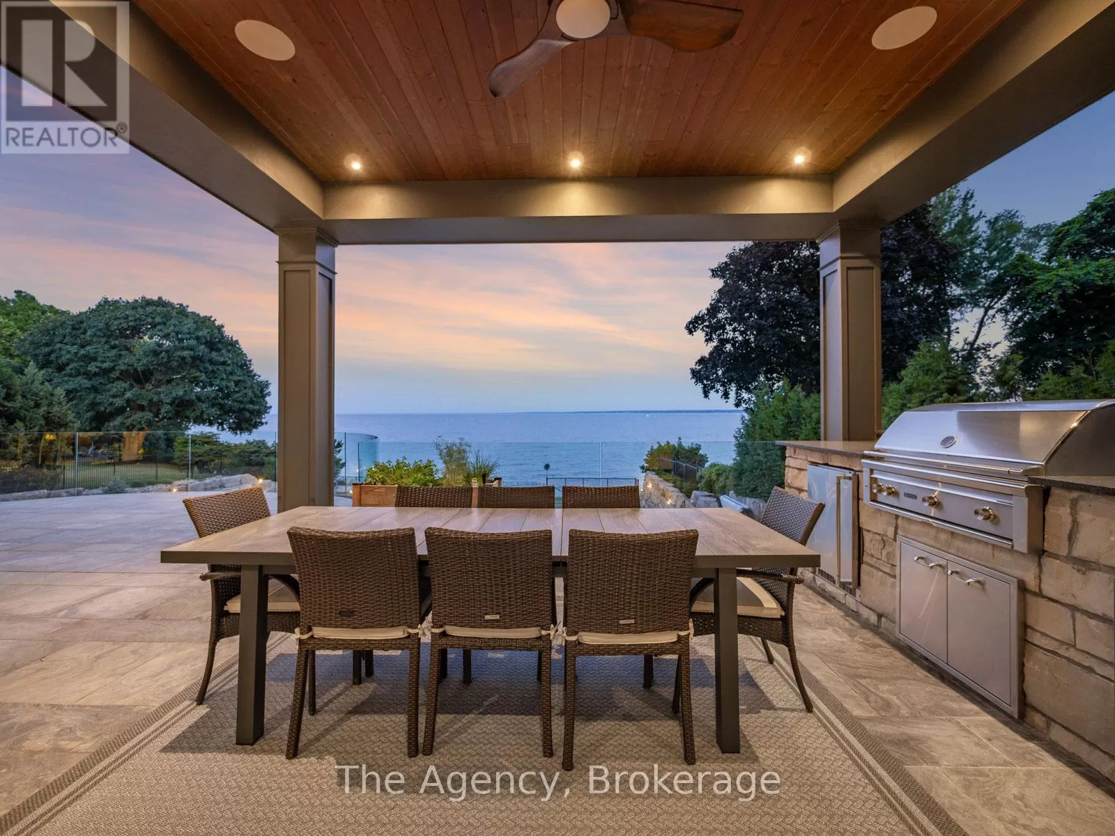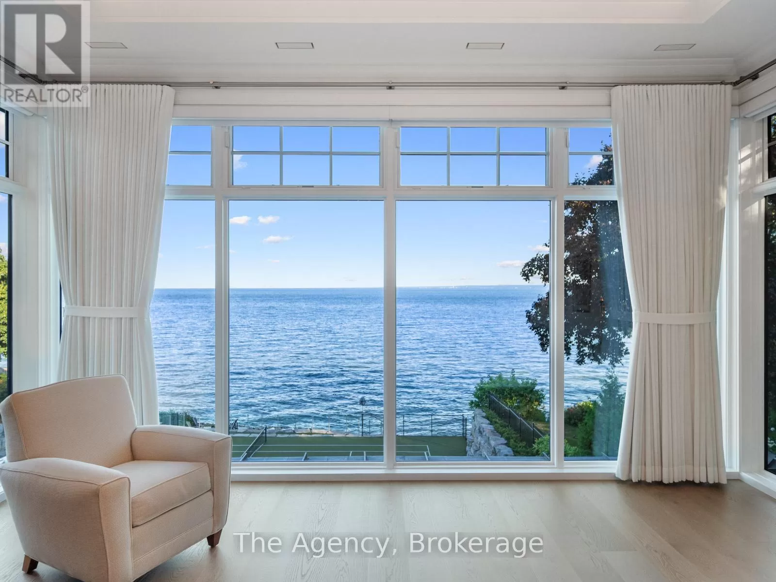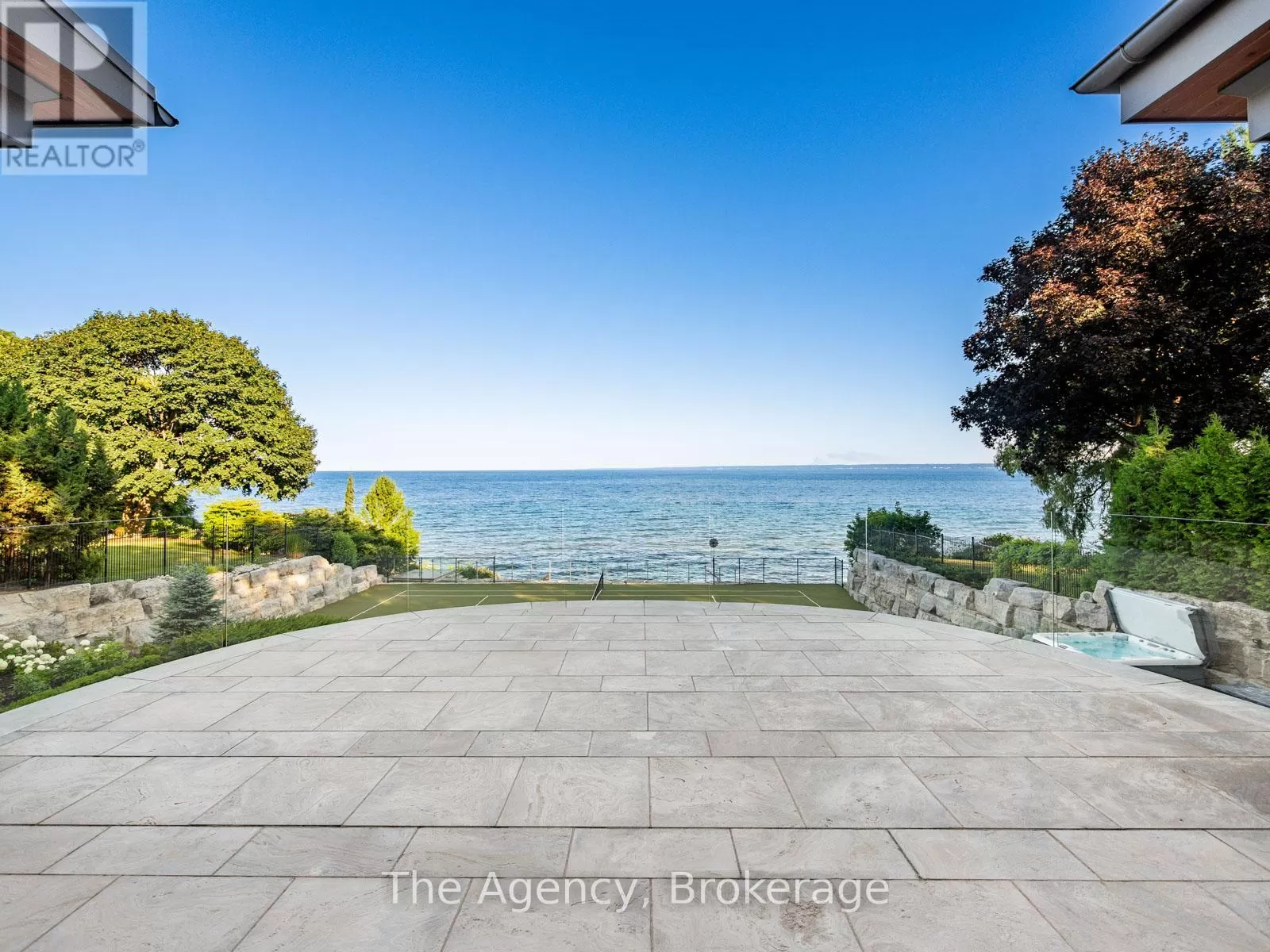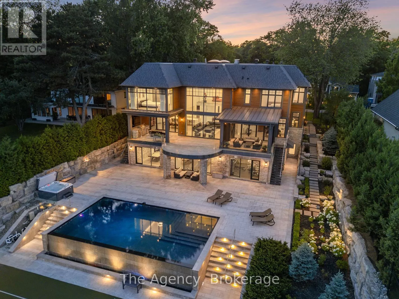 Lakeshore/Secord The Haven. A rare waterfront estate on a private laneway in South Burlington. Set on nearly of an acre with 103 ft of shoreline and full riparian rights, this property offers privacy, direct lake access, 11,417 Sq ft of living space and a lifestyle that feels like a luxury resort without leaving home. Inside, the lake takes centre stage. Floor to ceiling windows in the great room frame the view, anchored by 22-foot ceilings, a dramatic full-height stone fireplace, and a skylight that floods the space with light. A second living room provides another place to unwind, while a private office with 18-foot beamed ceilings and a stone feature wall inspires focus. Designed by architect David Small and built by Rock Cliff Custom Homes, this home is a masterclass in craftsmanship and elegance. Details like radiant heated floors throughout and a heated driveway ensure year-round comfort. Three outdoor terraces extend the living space. One includes a full outdoor kitchen with built-in BBQ, fridge, and bar sink; another is heated and screened for cooler nights. An additional custom stone patio sits at the waters edge. The backyard is a showstopper. An infinity edge pool appears to spill into the lake, while a private tennis court adds to the resort feel. Inside the kitchen features a large quartz island, Sub- Zero, Miele, and Wolf appliances, and custom cabinetry. A generous mudroom and main-floor laundry offer everyday function. Upstairs are four bedrooms, each with its own ensuite. The primary suite enjoys panoramic lake views, a spa-like ensuite, and a custom dressing room with center island. A second laundry room is also on this level. The walk-out lower level includes a lounge and bar, wine cellar, golf simulator, gym with lake views, sauna, tiered theatre, guest suite, and 3 additional bathrooms. An oversized 4-car tandem garage completes the home. Just minutes to downtown Burlington and a short drive to Toronto and Niagara, this is lakeside living without compromise. (id:27476)