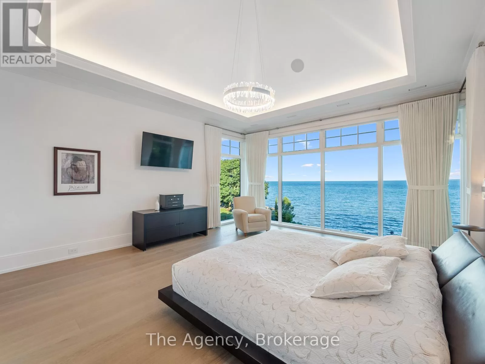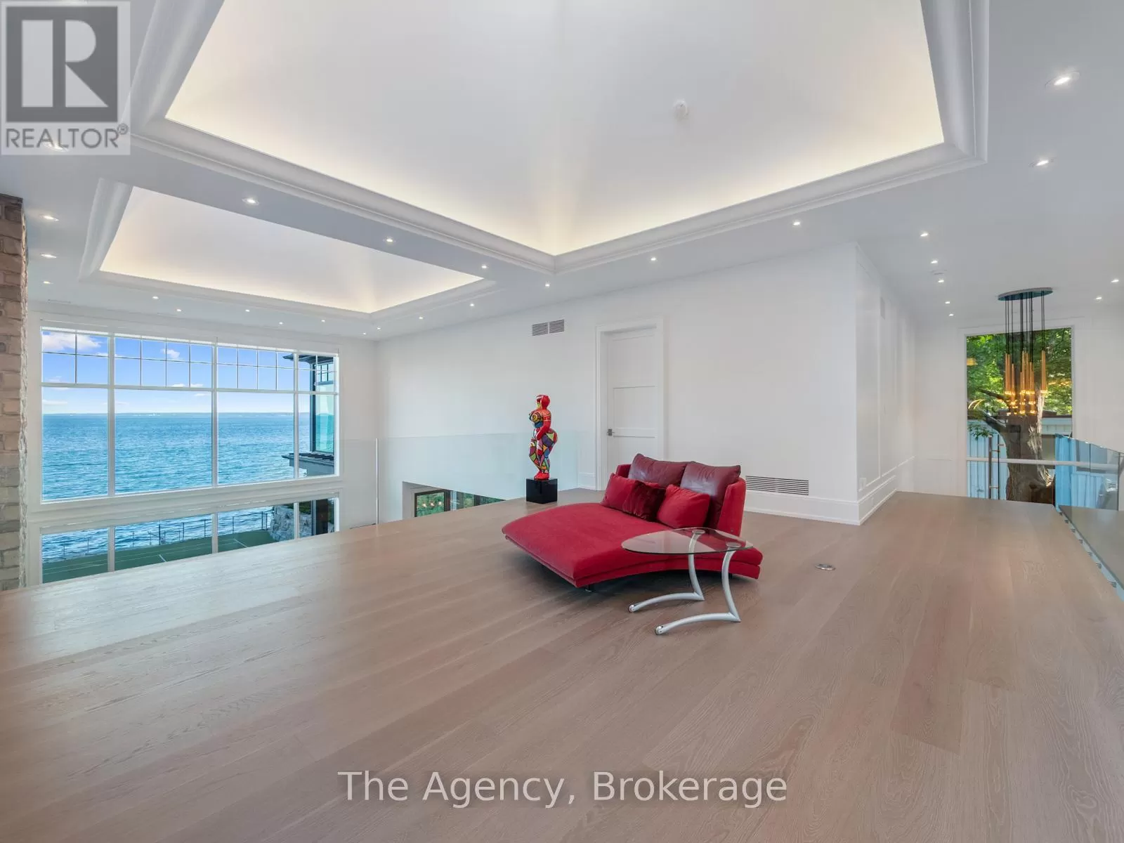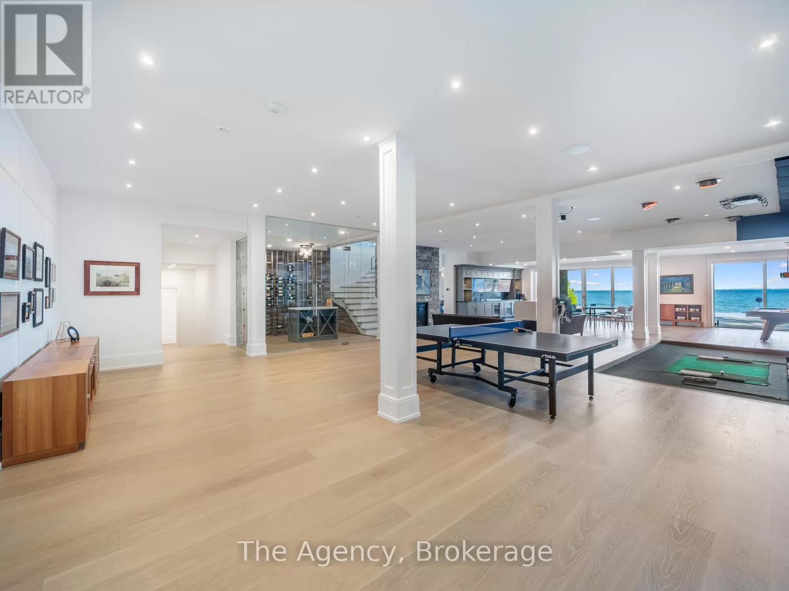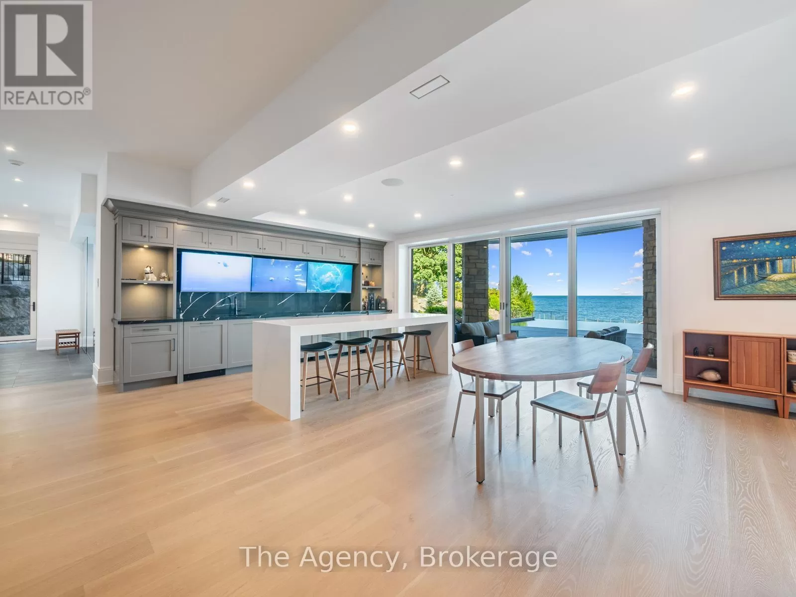 Lakeshore/Secord The Haven. A rare waterfront estate on a private laneway in South Burlington. Set on nearly of an acre with 103 ft of shoreline and full riparian rights, this property offers privacy, direct lake access, 11,417 Sq ft of living space and a lifestyle that feels like a luxury resort without leaving home. Inside, the lake takes centre stage. Floor to ceiling windows in the great room frame the view, anchored by 22-foot ceilings, a dramatic full-height stone fireplace, and a skylight that floods the space with light. A second living room provides another place to unwind, while a private office with 18-foot beamed ceilings and a stone feature wall inspires focus. Designed by architect David Small and built by Rock Cliff Custom Homes, this home is a masterclass in craftsmanship and elegance. Details like radiant heated floors throughout and a heated driveway ensure year-round comfort. Three outdoor terraces extend the living space. One includes a full outdoor kitchen with built-in BBQ, fridge, and bar sink; another is heated and screened for cooler nights. An additional custom stone patio sits at the waters edge. The backyard is a showstopper. An infinity edge pool appears to spill into the lake, while a private tennis court adds to the resort feel. Inside the kitchen features a large quartz island, Sub- Zero, Miele, and Wolf appliances, and custom cabinetry. A generous mudroom and main-floor laundry offer everyday function. Upstairs are four bedrooms, each with its own ensuite. The primary suite enjoys panoramic lake views, a spa-like ensuite, and a custom dressing room with center island. A second laundry room is also on this level. The walk-out lower level includes a lounge and bar, wine cellar, golf simulator, gym with lake views, sauna, tiered theatre, guest suite, and 3 additional bathrooms. An oversized 4-car tandem garage completes the home. Just minutes to downtown Burlington and a short drive to Toronto and Niagara, this is lakeside living without compromise. (id:27476)