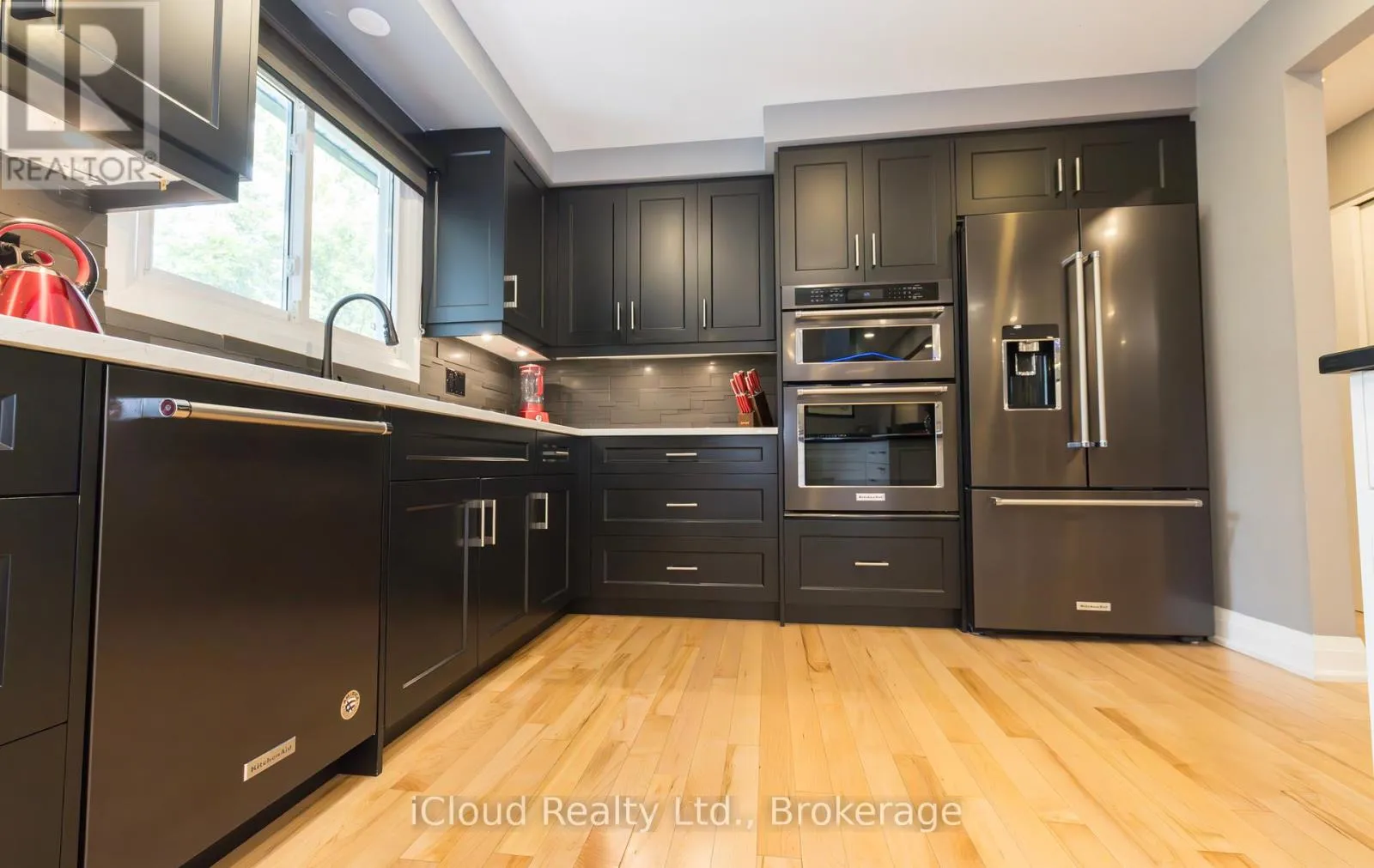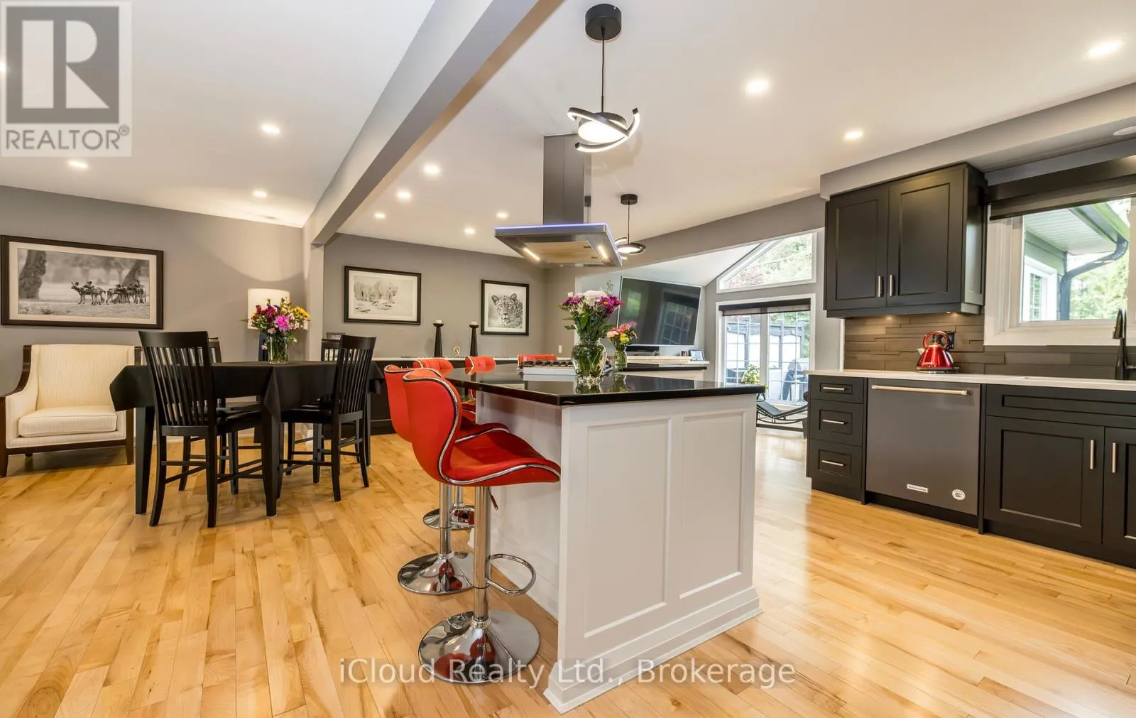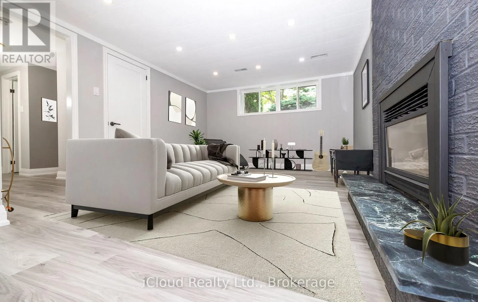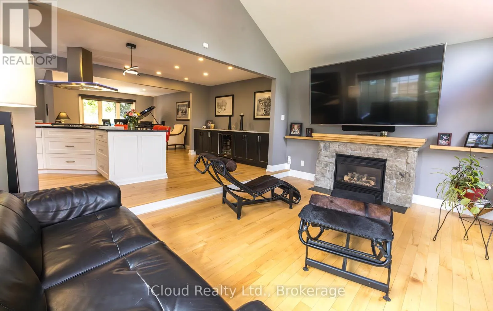 Cross Streets: Guelph Line & Mountain Grove Ave. ** Directions: Guelph Line to Mountain Grove. This upgraded, move-in-ready bungalow delivers over 1,500 sq. ft. of main floor living, combining modern comfort with timeless design. A striking sunken living room addition showcases cathedral ceilings, expansive windows with blackout blinds, and an abundance of natural light, an inviting space for both everyday living and entertaining. At the centre of the home is a chef's kitchen designed for style and function. Granite countertops, a gas cooktop, premium stainless steel venting, and built-in appliances set the stage, while an oversized island with a two-tone finish pairs cappuccino cabinetry with a crisp white breakfast bar. Extra-deep custom cabinets provide smart storage and organization. Maple hardwood flooring and LED pot lights run throughout the main level, complemented by two gas fireplaces that add warmth and character. The fully renovated lower level (2025) includes a sleek 3-piece bath, a large recreation room, and a versatile area perfect for a home office or fourth bedroom. Curb appeal is equally impressive, with double front doors, updated garage doors (2021), and a heated garage finished with epoxy flooring (2025), plus a dedicated workshop/hobby space. Outdoor living is elevated with a low-maintenance composite deck (2024) featuring a sunken hot tub and a new cover for year-round enjoyment. Major updates provide peace of mind: high-efficiency furnace (2020), oversized 5-ton A/C (2022), ProLine commercial-grade water heater (2020), 50-year fibreglass shingles (2012), and exterior sunshades (2020). Set close to parks, top schools, shopping, and transit, this home offers a rare blend of style, thoughtful upgrades, and lasting value. (id:27476)