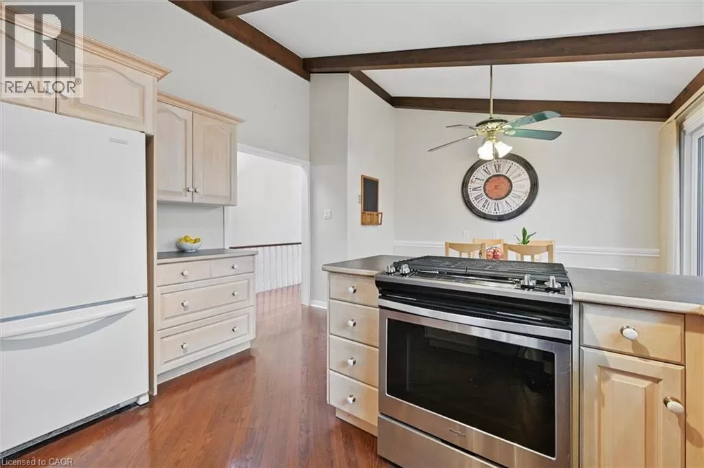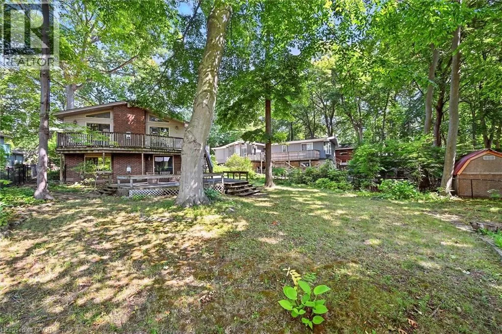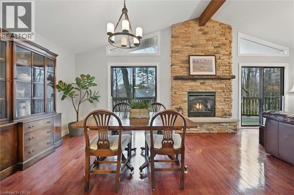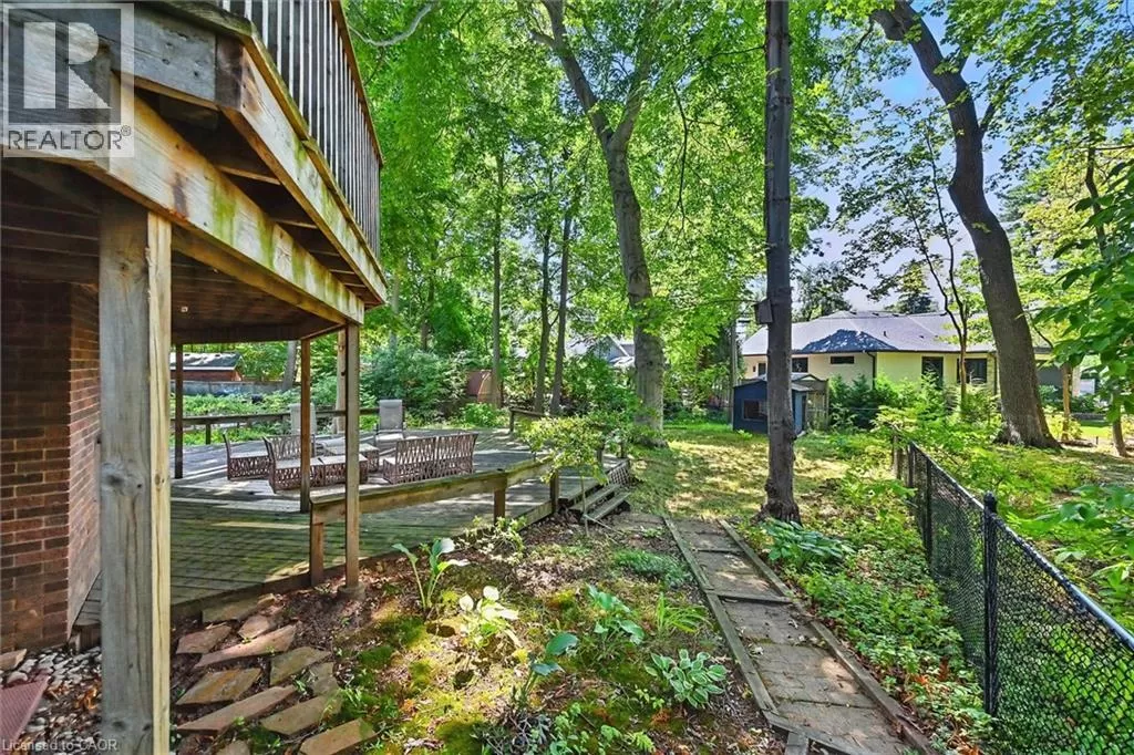 North Shore to King Road Enjoy a unique private cottage setting with all the amenities of city life nearby. Nestled in mature trees with an extra deep lot, this Aldershot home offers high ceilings on 2 floors and a bright, efficient design throughout. The double door entrance leads to a large foyer and main floor with exposed brick, vaulted beamed ceilings, oversized windows and a skylight. The open concept Living and Dining rooms feature gleaming hardwood floors and patio doors leading to a wrap-around multi-level deck. The Kitchen features storage and counter space galore with peninsula and separate breakfast bar area with more patio doors to the deck. The main floor Primary Bedroom features a 3-piece ensuite and oversized closet. Two additional Bedrooms and an updated 4-piece Bathroom complete this level. The Lower level features a spectacular Recreation room with a second fireplace and walkout to the back patio. A renovated 3-piece Bath, Office and Bedroom make it the perfect opportunity for additional family or guests. A separate Laundry room and Utility room with garage access offer even more storage space. With the Bruce Trail in close proximity and Lake Ontario down the road, this fabulous family home is a bird and nature loverâs dream with walkable access to schools, parks, trails, golf, waterfront and shopping. (id:27476)