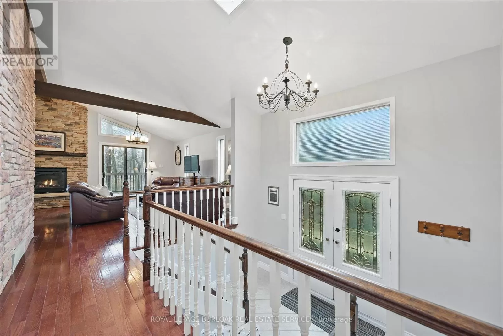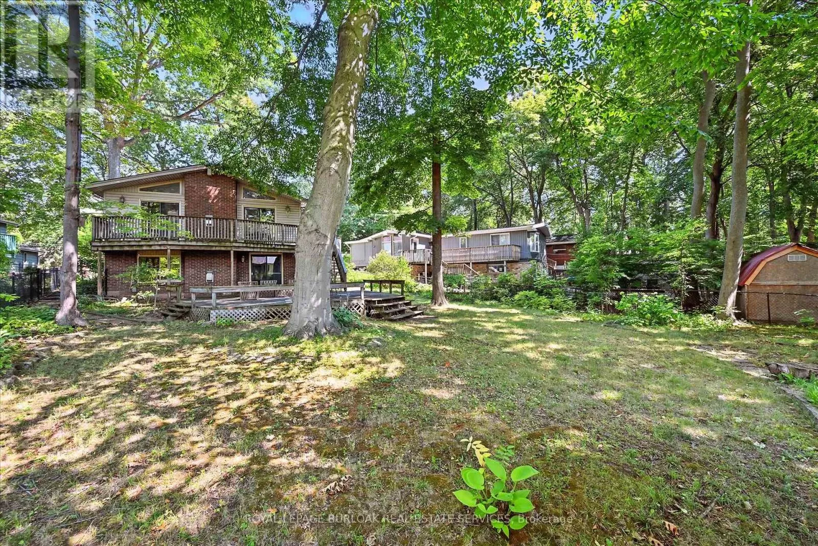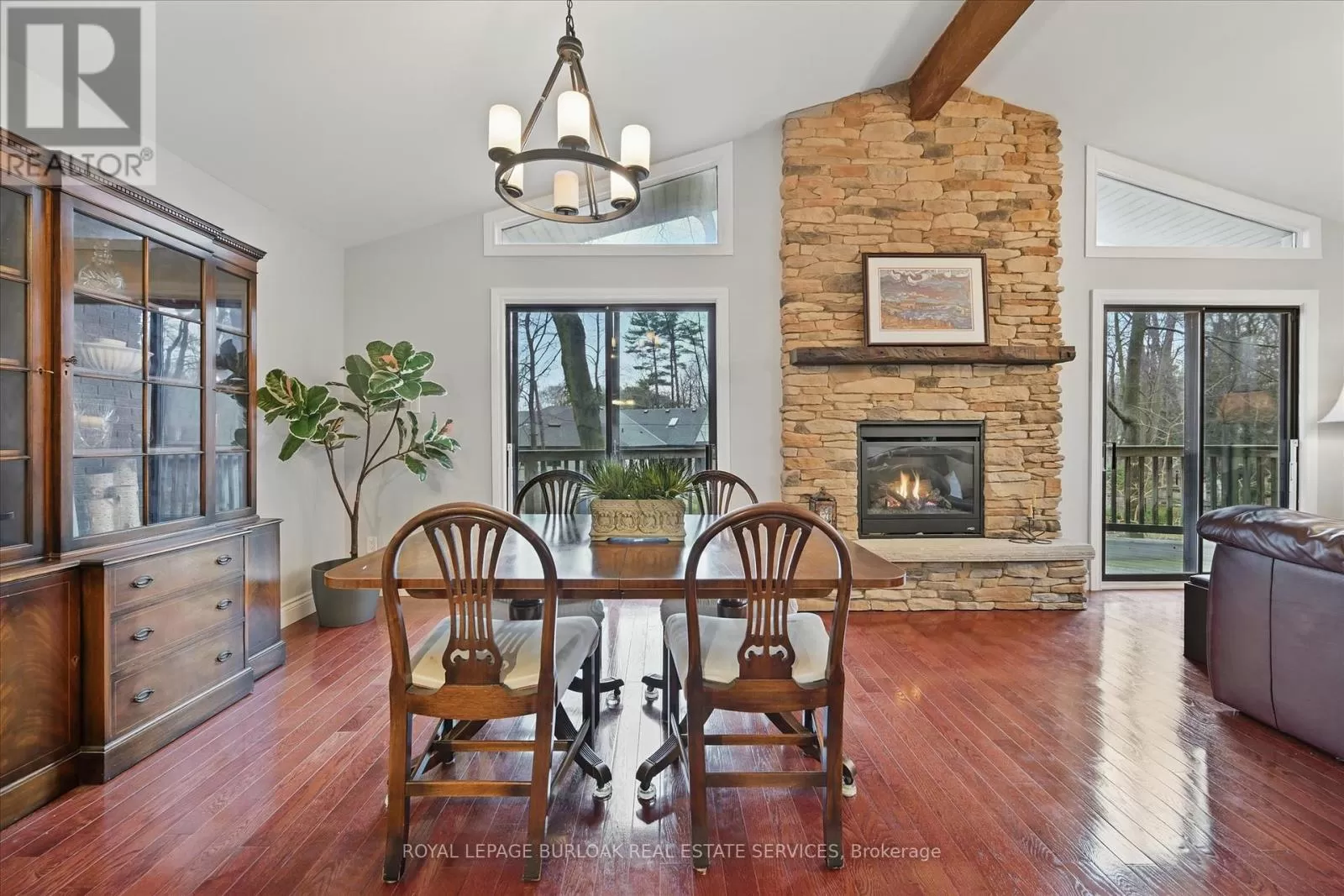 North Shore & King Enjoy a unique private cottage setting with all the amenities of city life nearby. Nestled in mature trees with an extra deep lot, this Aldershot home offers high ceilings on 2 floors and a bright, efficient design throughout. The double door entrance leads to a large foyer and main floor with exposed brick, vaulted beamed ceilings, oversized windows and a skylight. The open concept Living and Dining rooms feature gleaming hardwood floors and patio doors leading to a wrap-around multi-level deck. The Kitchen features storage and counter space galore with peninsula and separate breakfast bar area with more patio doors to the deck. The main floor Primary Bedroom features a 3-piece ensuite and oversized closet. Two additional Bedrooms and an updated 4-piece Bathroom complete this level. The Lower level features a spectacular Recreation room with a second fireplace and walkout to the back patio. A renovated 3-piece Bath, Office and Bedroom make it the perfect opportunity for additional family or guests. A separate Laundry room and Utility room with garage access offer even more storage space. With the Bruce Trail nearby and Lake Ontario steps away, this fabulous family home is a bird and nature lovers dream with walkable access to schools, parks, trails, golf, waterfront and shopping. (id:27476)