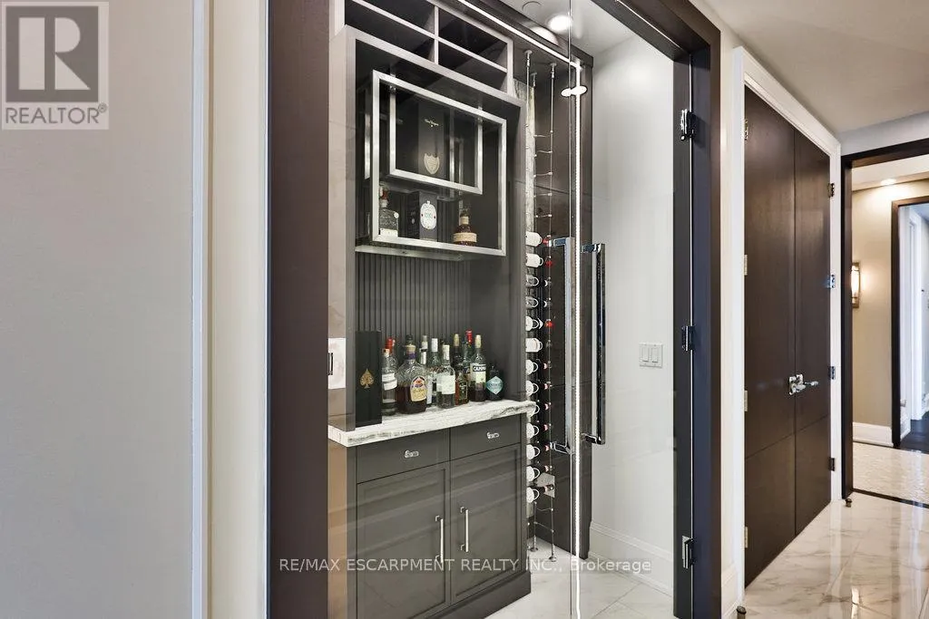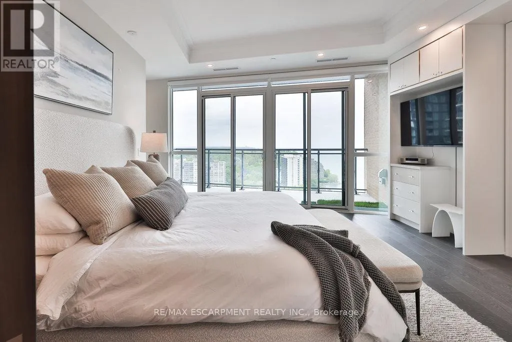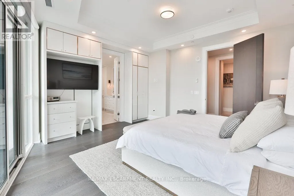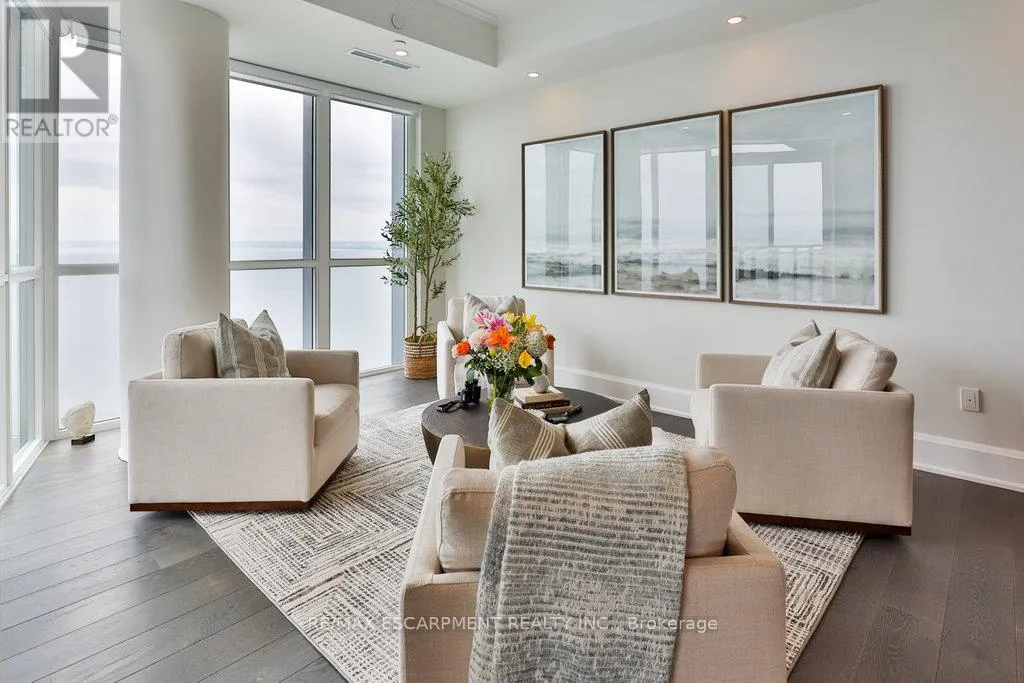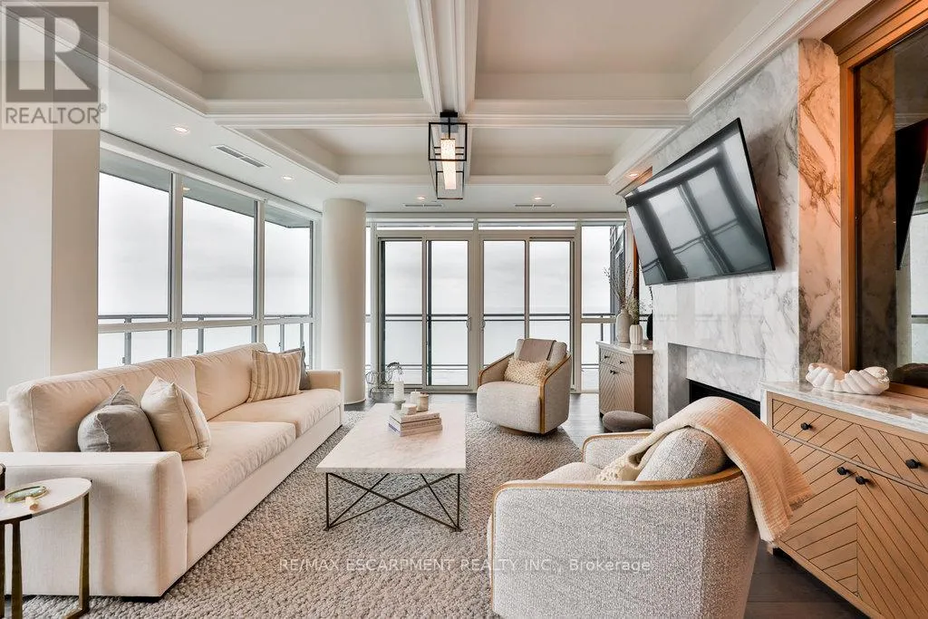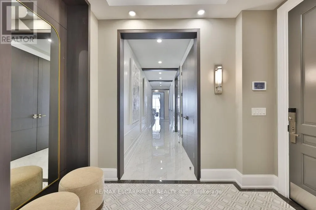 Cross Streets: Brant and Lakeshore. ** Directions: BRANT ST TO LAKESHORE RD. Occupying the entire east side of the Bridgewater Private Residences with The Pearl Hotel, this 3,234 sq ft sub-penthouse offers rare scale, privacy, and panoramic views. Available fully furnished and accessorized just bring your bags and move in. Uninterrupted sightlines span Lake Ontario south to Niagara, east to the CN Tower, and north over Burlington's downtown and the Escarpment. Dual entrances separate living and bedroom wings. Three bedrooms with private ensuites, a home office, wine cellar, and walk-in laundry with sink. Wide-plank hardwood, Restoration Hardware lighting, and a standout primary ensuite with heated floors, gold fixtures, and a lake-facing walk-in shower. Dining area with custom bar and second dishwasher. A glass-wrapped lounge hovers over the shoreline with front-row views. Includes three-car parking. Residents enjoy gym, spa, indoor pool, Isabel's, café, room service, weekly events, and private access to The Pearl Hotel. Steps to the lake and Burlington's best. Luxury Certified. (id:27476)