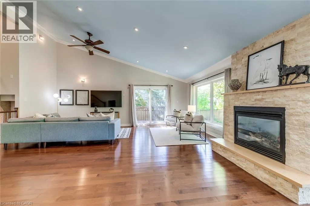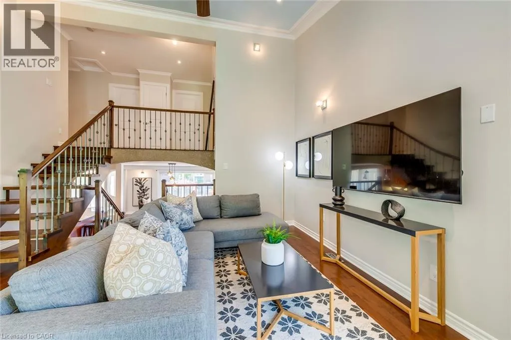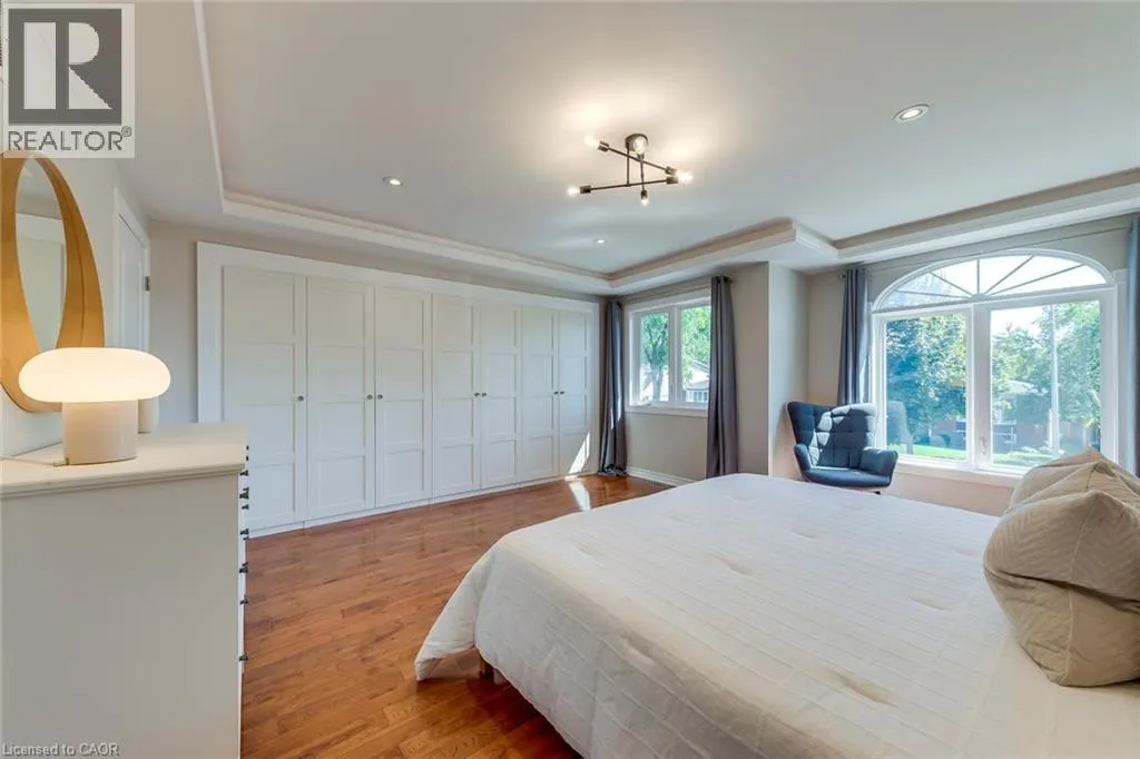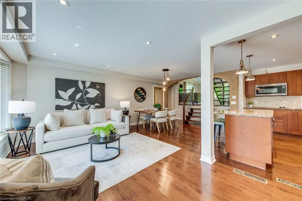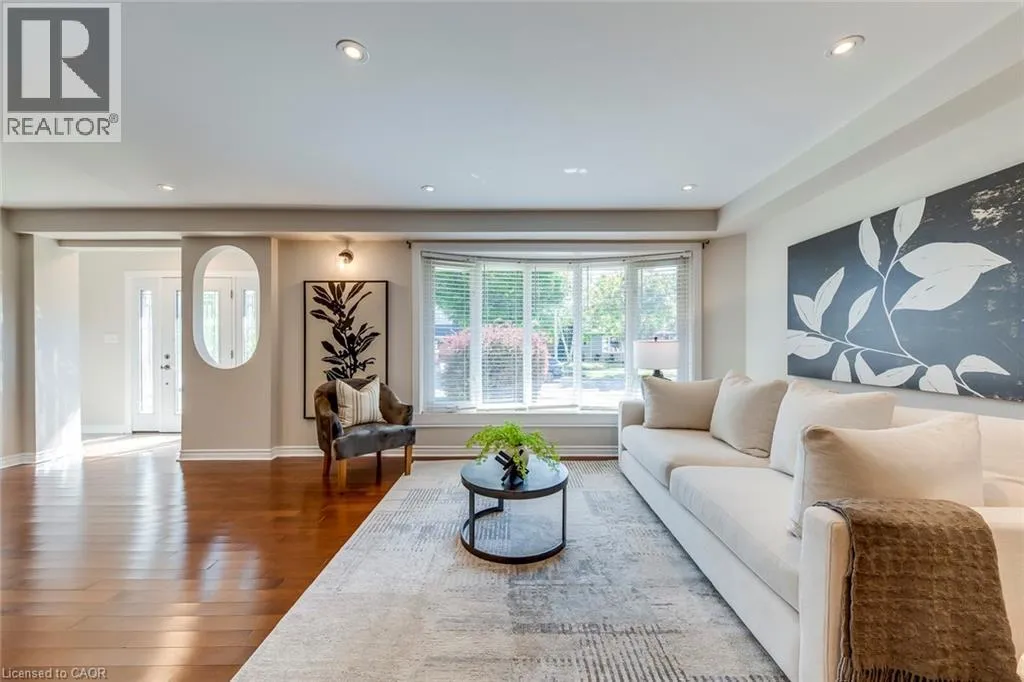 Pinedale to Mullin to Cindy This spacious 3+1 bedroom, 4-bathroom custom-built home sits on a quiet street in Burlingtonâs sought-after Pinedale, just minutes from parks, schools, shopping, and major highways. Offering nearly 2,680 sqft above grade plus a fully finished basement, itâs ideal for growing families. The modern stucco exterior with large windows adds striking curb appeal. Inside, the main floor features an open-concept layout with a bright living room and a large eat-in kitchen showcasing hardwood cabinetry, a generous island, stone counters, and premium stainless steel appliances. The upgraded laundry/mud room provides access to both the garage and backyard. A raised second level impresses with soaring cathedral ceilings, massive windows, and a versatile family/dining space. An elegant open-riser staircase leads to the third floor with a luxurious primary suite offering wall-to-wall custom closets, oversized windows, and a spa-like ensuite with glass shower. Two additional bedrooms share a renovated 4-piece bath. The finished basement boasts above-grade windows, a spacious rec room with wet bar, a fourth bedroom, and full bath. Outdoors, the backyard offers space to relax or entertain amid mature trees and established landscaping. The location is unmatchedâ15 minutes on foot to Fortinos, Shoppers, and Appleby Plaza restaurants; five playgrounds within walking distance; and easy access to Centennial Bikeway, downtown Burlington, the lakefront, Burloak Waterfront Park, and GO transit. Just a short drive to RioCan Centre with shops, restaurants, cinema, and a soon-to-open Costco. Recent upgrades include front and back decks stained (2025), interlock patio (2025), fridge (2024), washer (2022), and microwave (2022). (id:27476)