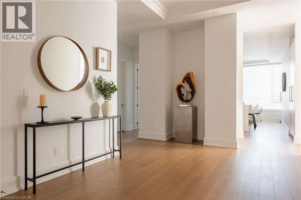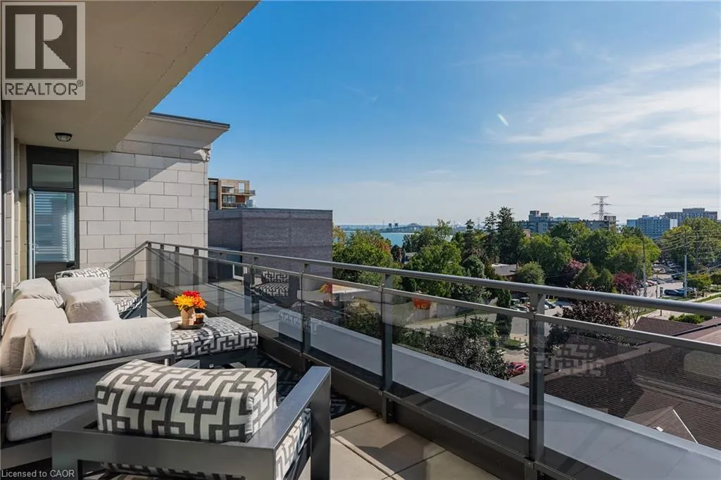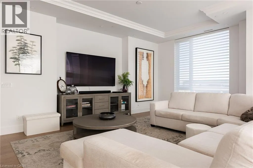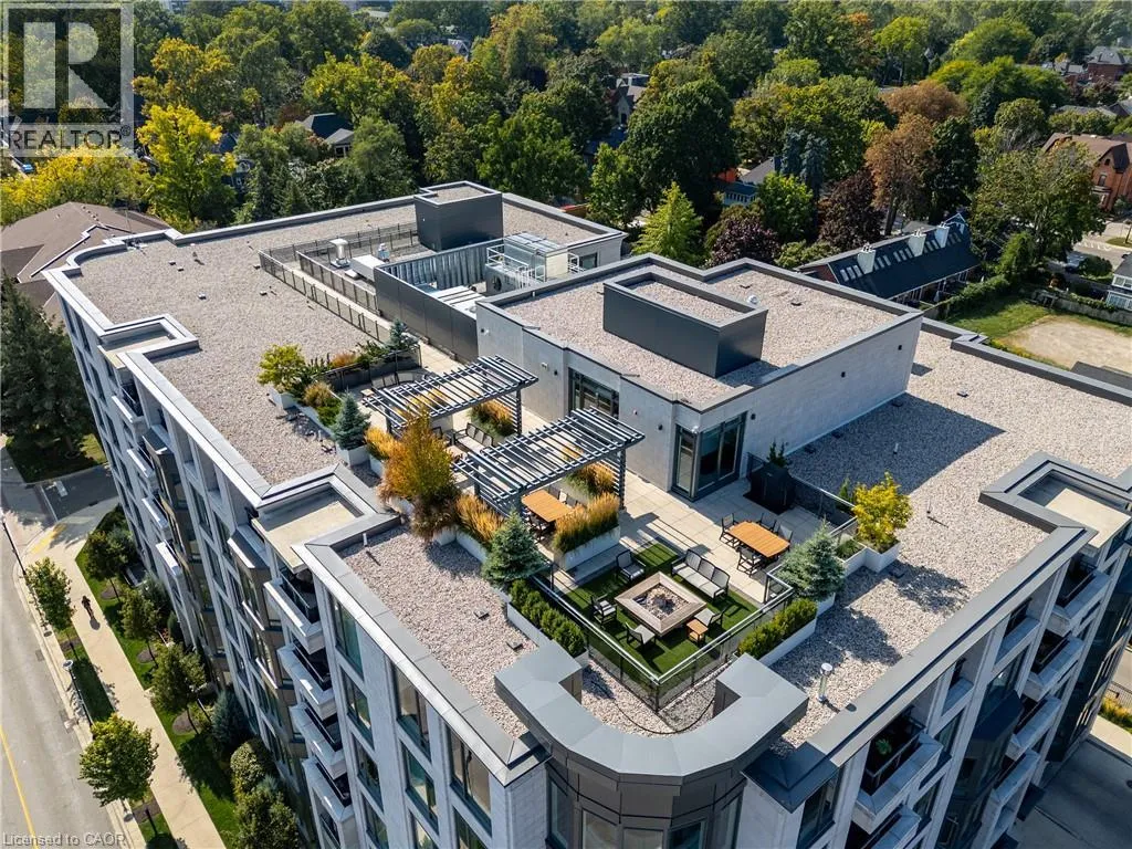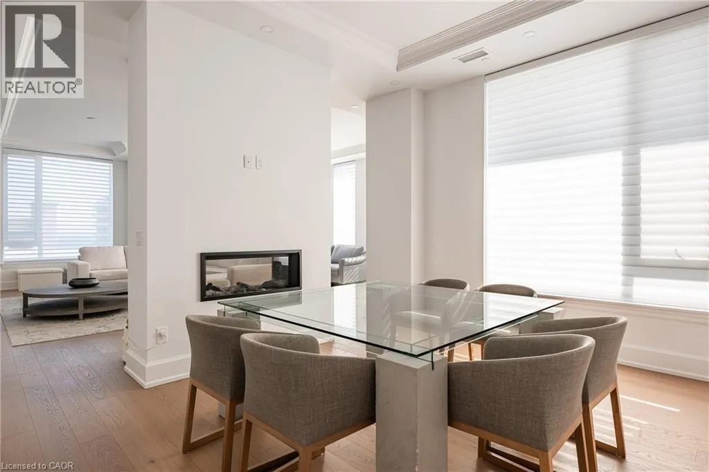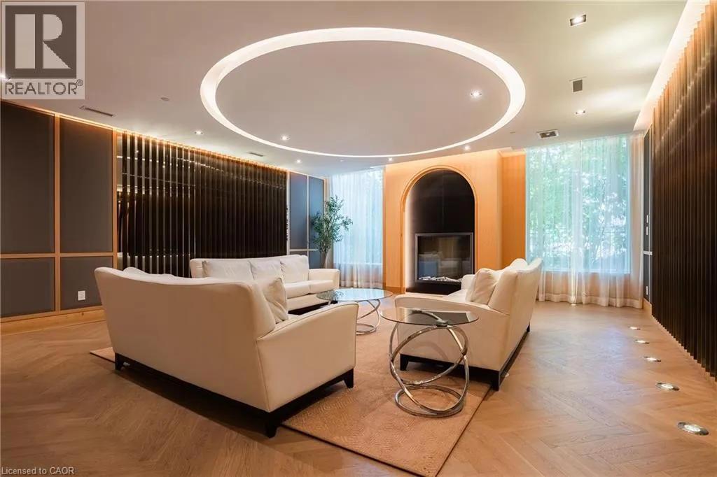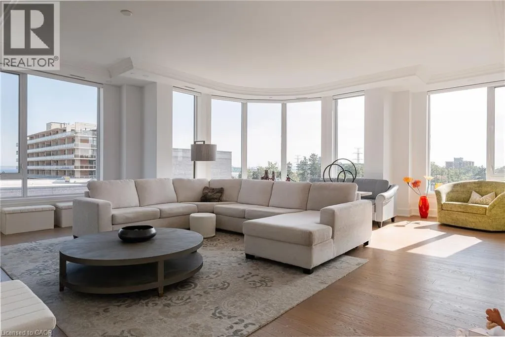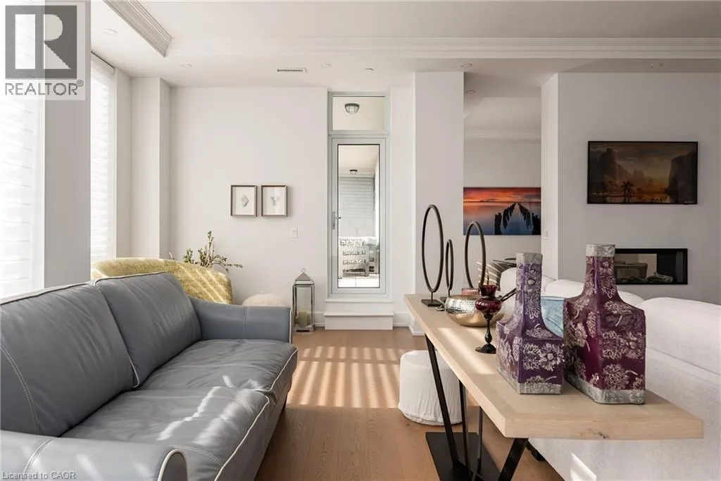 Lakeshore/Locust/Elgin Spanning an impressive 2,554 square feet, this penthouse at the prestigious Saxony offers the ultimate in refined condominium living. Designed with both scale and sophistication, the suite showcases 10-foot ceilings, expansive principal rooms, and a versatile 2+1 bedroom layout, with the den being large enough to be a third bedroom. The great room spans nearly 28 feet, seamlessly connecting to a generous 300 sq. ft. balcony where southwest exposure frames vibrant sunsets and city views. A double-sided fireplace and open dining space create an elegant yet flexible floor planâideal for entertaining! The kitchen, anchored by premium integrated appliances and generous prep surfaces, flows naturally into both dining and living areas. Custom closets and automated blinds underscore the thoughtful upgrades throughout. The primary suite impresses with a walk-in closet and a spa-inspired ensuite, while the second bedroom and den offer equal comfort for family or guests. This residence is complemented by three oversized parking spaces, including an EV charger, along with a large private storage locker. Exclusive building amenitiesâfitness studio, rooftop lounge, and concierge servicesâfurther elevate the experience. Positioned steps from the lake, the Burlington Performing Arts Centre, and the cityâs best shops and restaurants, this penthouse combines the privacy of a home with the convenience of downtown living. (id:27476)