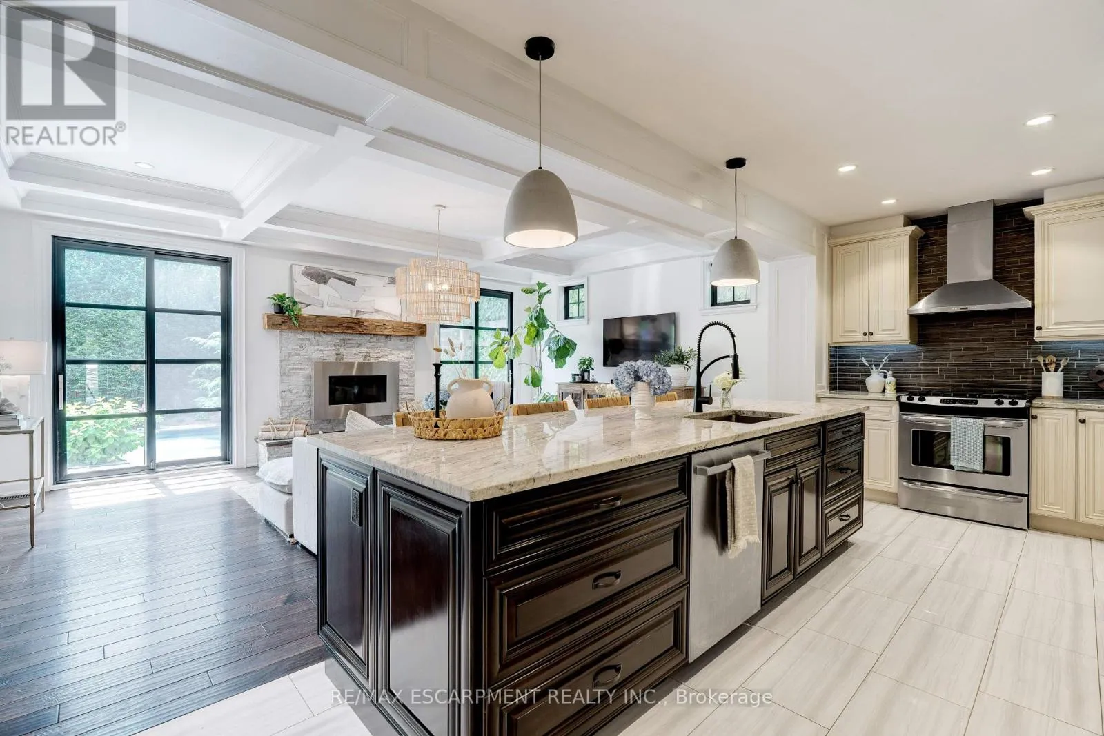 Cross Streets: Drury Lane & Courtland. ** Directions: Drury Lane to Courtland Dr. Curb appeal that draws you in, and a backyard you'll never want to leave! Welcome to Burlington's desirable core, where this 4+1 bedroom, 3.5 bathroom home delivers space, function, and a backyard that feels like a private escape! Inside, hand-scraped hardwood floors lead you through sun-filled spaces, starting with a formal dining room perfect for gatherings. The well-appointed kitchen features quality cabinetry, granite counters, and an oversized island that anchors the home. It opens to a generous great room with a coffered ceiling, stone fireplace, and dual walk-out to the backyard. A main floor bedroom or office, mudroom with laundry and garage access, and an a stylish powder room complete the main level. Upstairs, the primary suite features a walk-in closet and an ensuite with a soaker tub overlooking the yard and a glass shower, plus two additional bedrooms and a full bath. The finished lower level offers a spacious family room, additional seating area, the fifth bedroom, and a full bath. Step outside, and it only gets better: an incredibly private, meticulously landscaped backyard with mature trees, lush gardens, dozens of flourishing hydrangeas, elegant stonework, and low-maintenance turf. The oversized porch with built-in BBQ area, in-ground pool (newer liner, pump, and cartridge filter), waterfall feature, and covered outdoor lounge with gas fireplace make it the perfect space to gather or unwind. Truly, a home that captures attention! Luxury Certified. (id:27476)