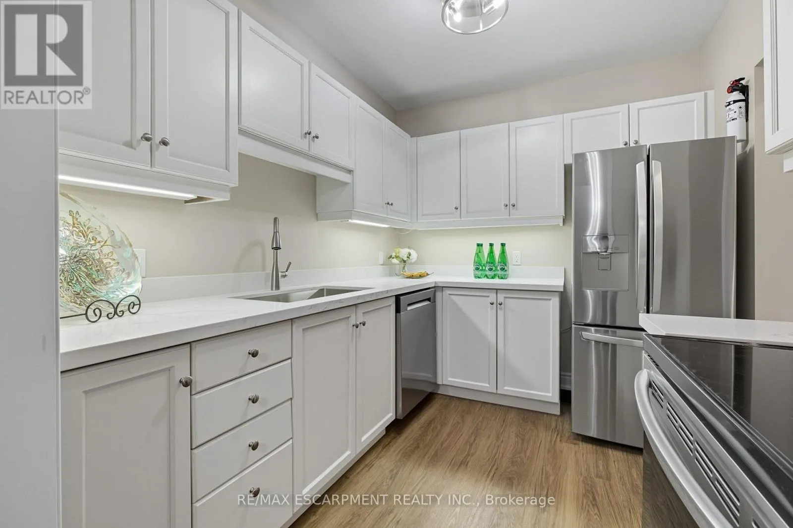 Cross Streets: Brant and QEW. ** Directions: Exit Brant Street from QEW, North to Amherst Heights Drive, Right to address. Welcome to this beautifully newly renovated large one-bedroom, two-bathroom condo with serene garden views. This move in ready home provides a serene retreat with modern touches throughout. Parking spot #16 and locker #104. Visitors parking has access to EV chargers. Step inside to find 9 foot ceilings, freshly painted interiors and stylish, updated vinyl flooring that flows seamlessly through the living spaces. The spacious living area is filled with natural light and is overlooking a peaceful field adorned with seasonal flowers, and trees. This balcony with views offer privacy and tranquility. The kitchen has been thoughtfully updated with designer finishes, offering ample cabinetry, quartz countertops, under mount sink and LG fridge with ice maker and filtered water, LG glass top range, built in microwave and fan, and LG dishwasher. These appliances have just been installed and never been used. Condo Fee is $639 per month includes FIBE cable and internet, parking, water, heat and A/C via a heat pump you own, building maintenance, and dial up security entrance. Adjacent to the entry door is washer/dryer closet. The generously sized bedroom includes 2 closets, a walk-in and standard. There is room for a desk. The Spa like en-suite bathroom newly installed carara porcelain tile, shower and tub combination. A second 2-piece bathroom adds flexibility for guests or work-from-home living. With its tranquil setting, modern updates, and thoughtful layout, this condo is an ideal choice for those seeking a low-maintenance lifestyle with all the comforts of home. The second floor is most sought after. You can move in immediately and live the good life. (id:27476)