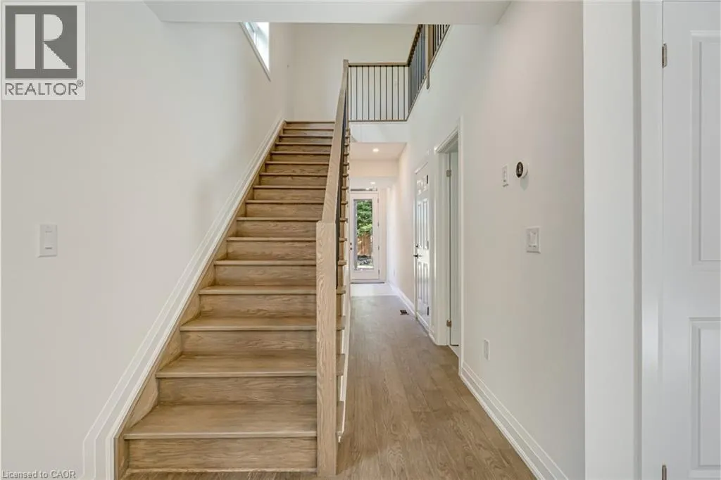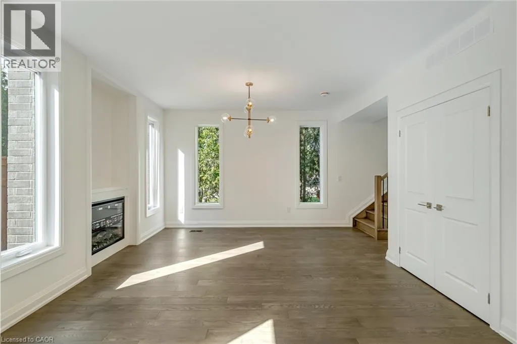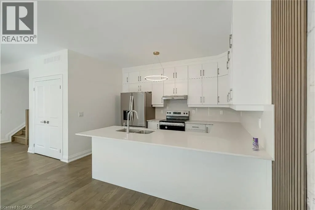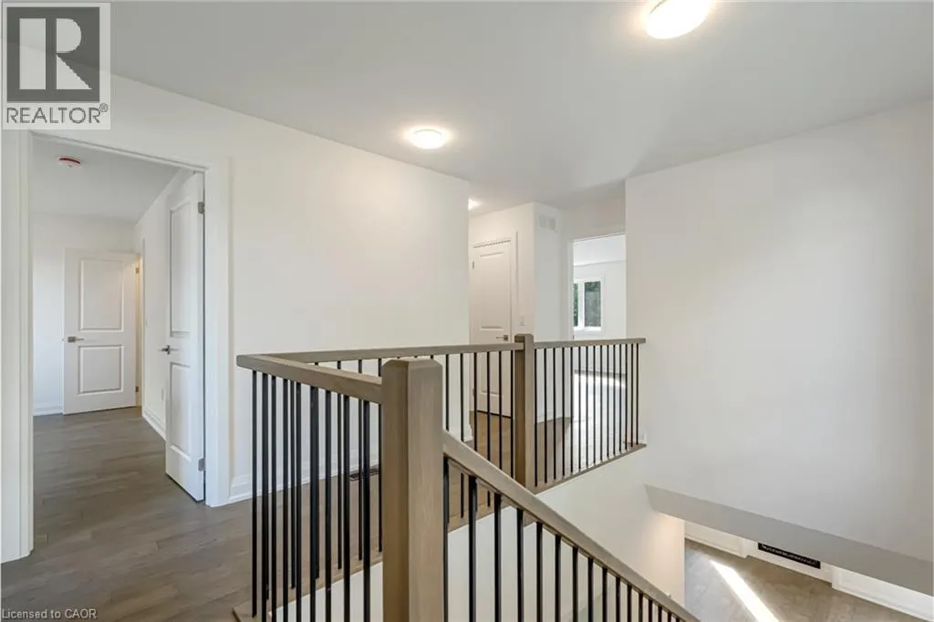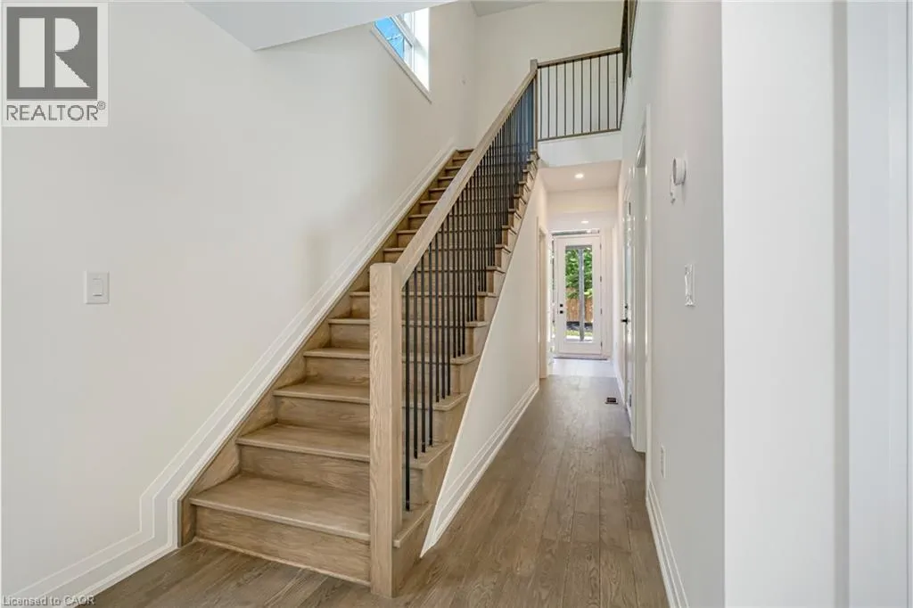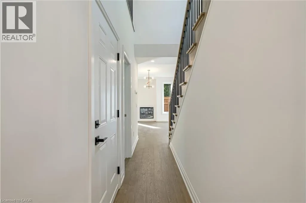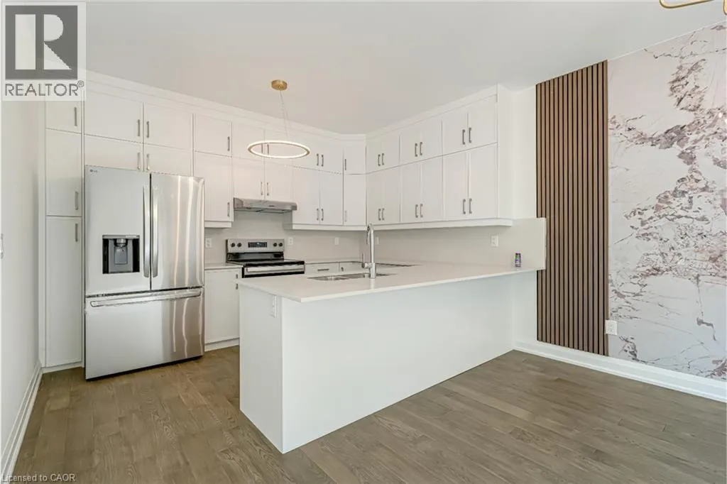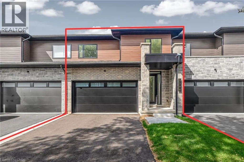 NORTH ON WALKERS LINE PAST UPPER MIDDLE ON THE WEST SIDE Brand-new executive town home never lived in! This stunning 1,799 sq. ft. home is situated in an exclusive enclave of just nine units, offering privacy and modern luxury. Its sleek West Coast-inspired exterior features a stylish blend of stone, brick, and aluminum faux wood. Enjoy the convenience of a double-car garage plus space for two additional vehicles in the driveway. Inside, 9-foot ceilings and engineered hardwood floors enhance the open-concept main floor, bathed in natural light from large windows and sliding glass doors leading to a private, fenced backyard perfect for entertaining. The designer kitchen is a chefs dream, boasting white shaker-style cabinets with extended uppers, quartz countertops, a stylish backsplash, stainless steel appliances, a large breakfast bar, and a separate pantry. Ideally located just minutes from the QEW, 407, and Burlington GO Station, with shopping, schools, parks, and golf courses nearby. A short drive to Lake Ontario adds to its appeal. Perfect for down sizers, busy executives, or families, this home offers low-maintenance living with a $349.83/month condo fee covering common area upkeep only, including grass cutting and street snow removal. Don't miss this rare opportunity schedule your viewing today! Tarion Warranty! (id:27476)