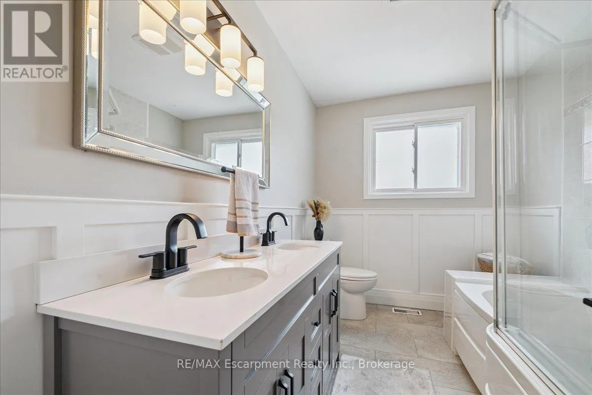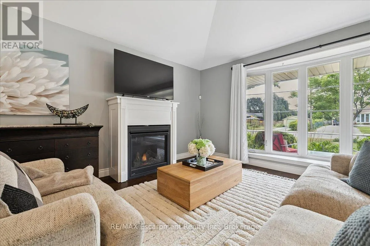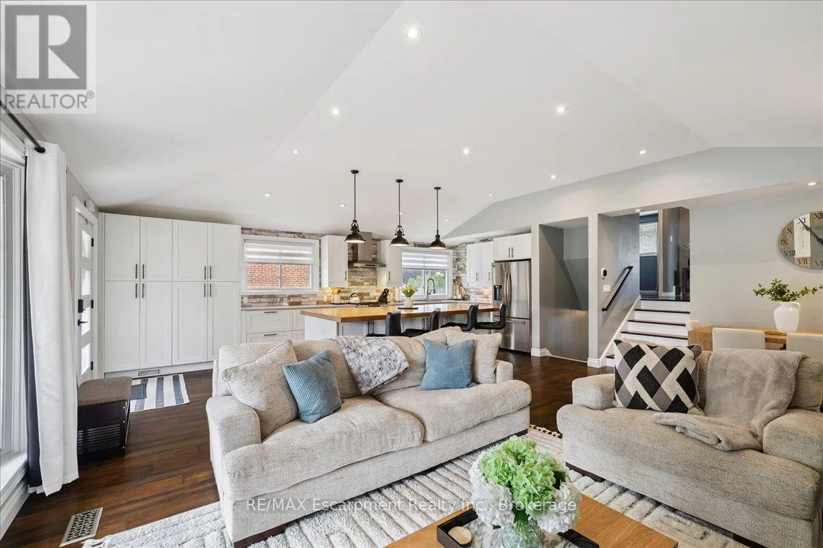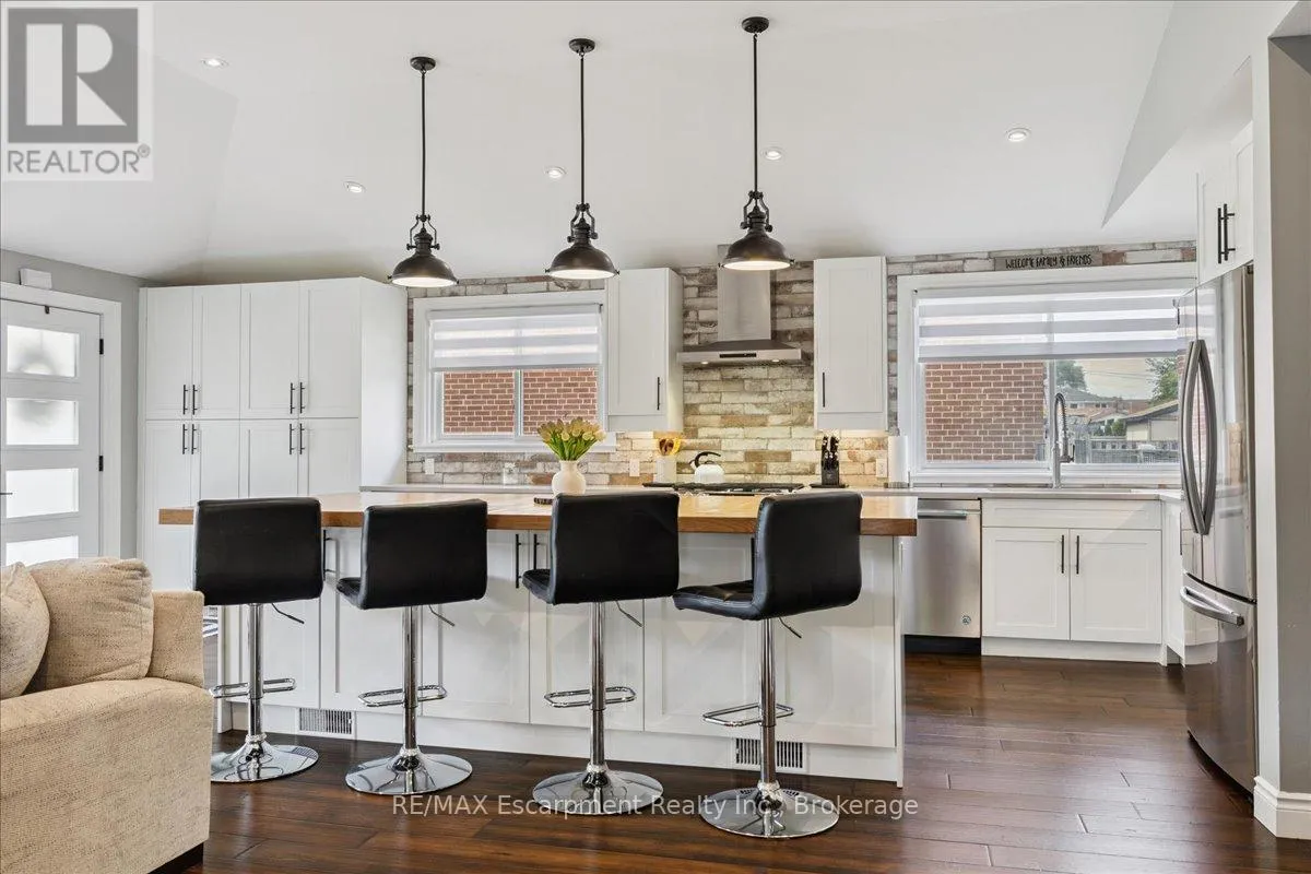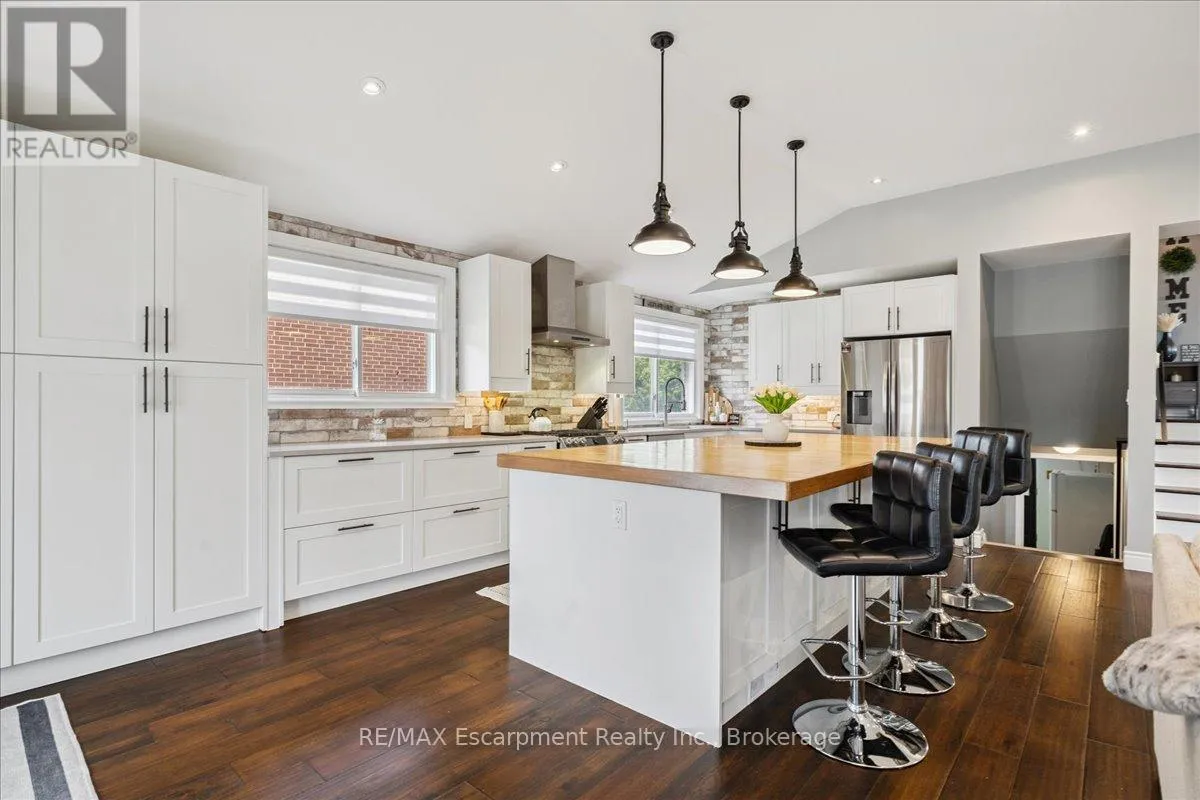 Brant/Prospect Beautifully updated and exceptionally well-designed, this 4-level backsplit offers a surprising amount of space and versatility in one of Burlington's most desirable central neighbourhoods just minutes from downtown, the lakefront, schools, parks, and shopping. Thoughtfully renovated, it boasts 3+1 bedrooms and 3 bathrooms, blending functionality with refined design elements throughout. The open-concept main floor impresses with a custom tray ceiling for architectural depth and sophistication. At the heart of this elegant home, is a striking kitchen featuring a substantial island with seating for six, stainless appliances, a gas range, built-in wine fridge, deep pot drawers, and extensive pantry-style cabinetry. Perfect for culinary enthusiasts and effortless entertaining! The adjoining living and dining areas are anchored by a gas fireplace with natural light from a large bow window. Garden doors open to a side patio perfect for outdoor dining or games nights with friends. Upstairs you'll find three bedrooms with updated wood flooring and a stylishly remodelled 4-piece bathroom. On the first lower level, a vintage-inspired reclaimed brick fireplace creates a cozy atmosphere in the family room. This level also includes a full 3-piece bathroom and a large utility room ideal for storage, hobbies or a home workshop - with direct walk-up access to the backyard. The second lower level has been transformed into a stunning primary or nanny suite with a spa-like bathroom featuring dual vanities, a two-person shower, and two closets (including a walk-in) for exceptional storage. And finally, the fully fenced backyard features an inground pool with concrete surround offering a fantastic opportunity for personalization and creativity. Located in a family and pet-friendly area within walking distance of the lake, Burlington's downtown shops and restaurants, the mall, library, and parks, this home shows a solid 10+ and is ready to impress even the most discerning buyer! (id:27476)
