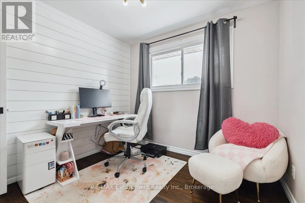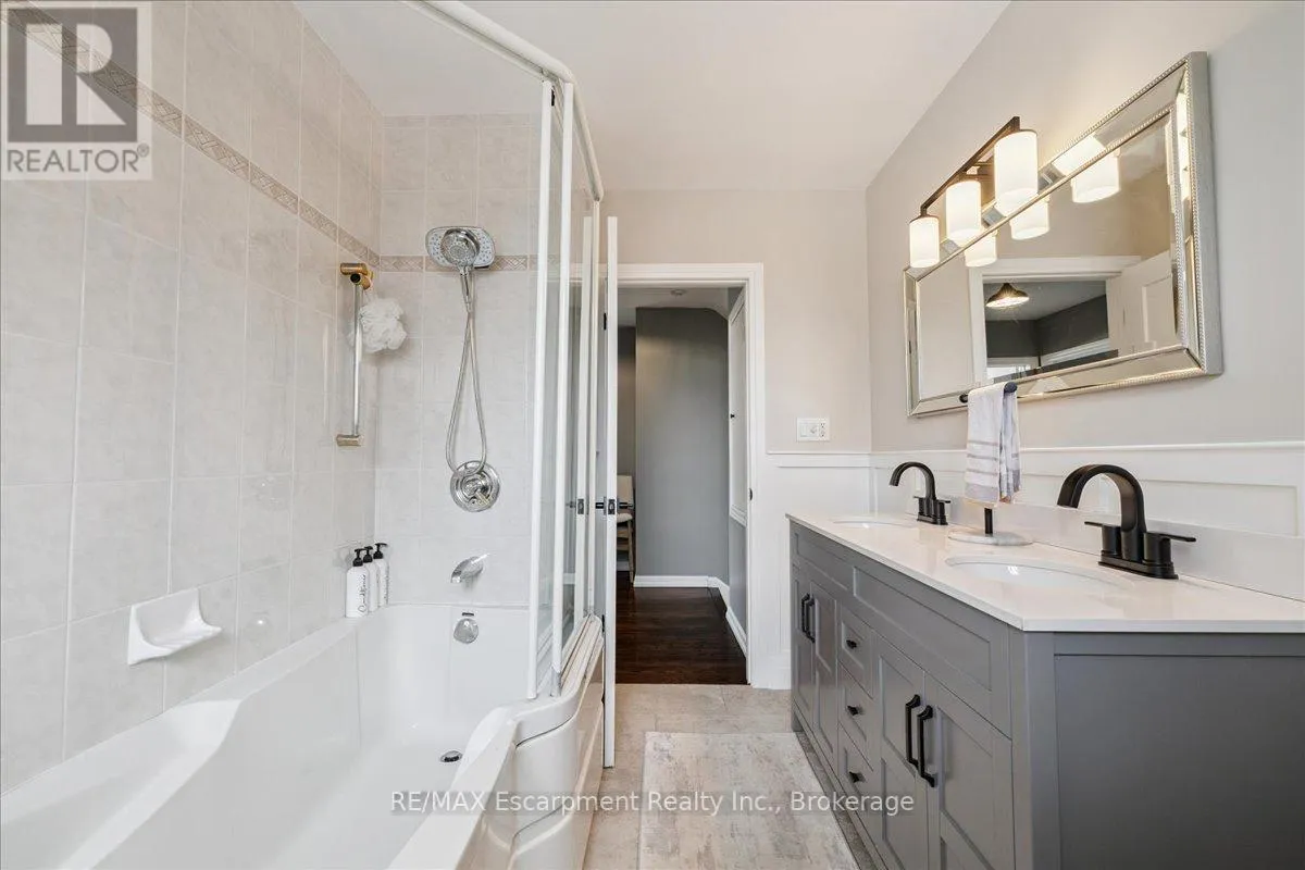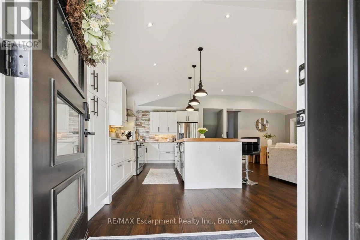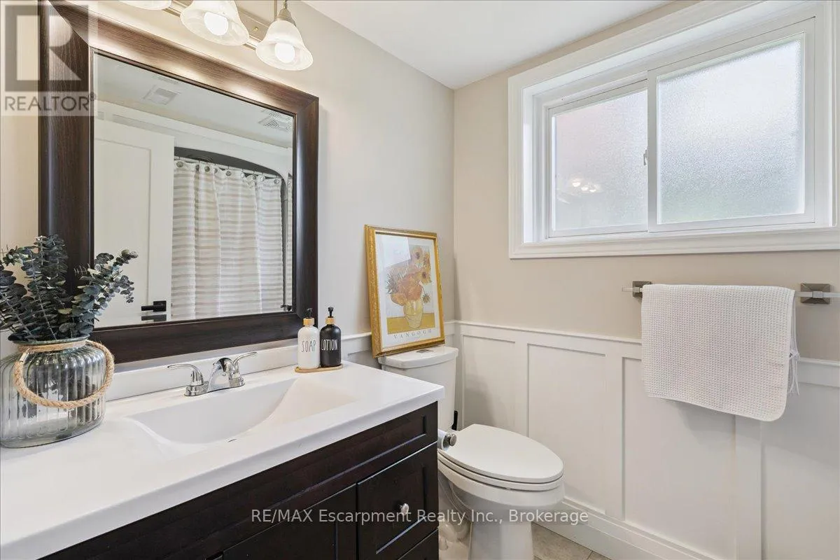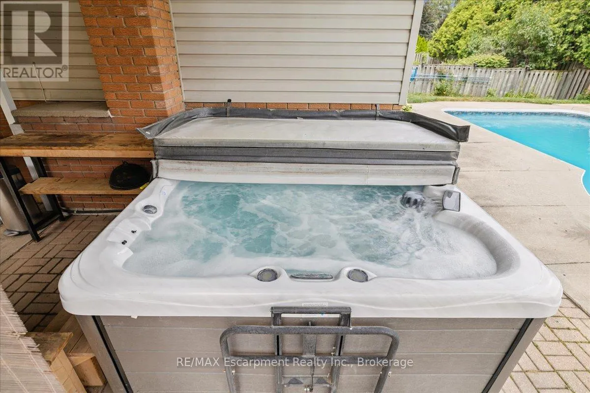 Brant/Prospect Beautifully updated and exceptionally well-designed, this 4-level backsplit offers a surprising amount of space and versatility in one of Burlington's most desirable central neighbourhoods just minutes from downtown, the lakefront, schools, parks, and shopping. Thoughtfully renovated, it boasts 3+1 bedrooms and 3 bathrooms, blending functionality with refined design elements throughout. The open-concept main floor impresses with a custom tray ceiling for architectural depth and sophistication. At the heart of this elegant home, is a striking kitchen featuring a substantial island with seating for six, stainless appliances, a gas range, built-in wine fridge, deep pot drawers, and extensive pantry-style cabinetry. Perfect for culinary enthusiasts and effortless entertaining! The adjoining living and dining areas are anchored by a gas fireplace with natural light from a large bow window. Garden doors open to a side patio perfect for outdoor dining or games nights with friends. Upstairs you'll find three bedrooms with updated wood flooring and a stylishly remodelled 4-piece bathroom. On the first lower level, a vintage-inspired reclaimed brick fireplace creates a cozy atmosphere in the family room. This level also includes a full 3-piece bathroom and a large utility room ideal for storage, hobbies or a home workshop - with direct walk-up access to the backyard. The second lower level has been transformed into a stunning primary or nanny suite with a spa-like bathroom featuring dual vanities, a two-person shower, and two closets (including a walk-in) for exceptional storage. And finally, the fully fenced backyard features an inground pool with concrete surround offering a fantastic opportunity for personalization and creativity. Located in a family and pet-friendly area within walking distance of the lake, Burlington's downtown shops and restaurants, the mall, library, and parks, this home shows a solid 10+ and is ready to impress even the most discerning buyer! (id:27476)
