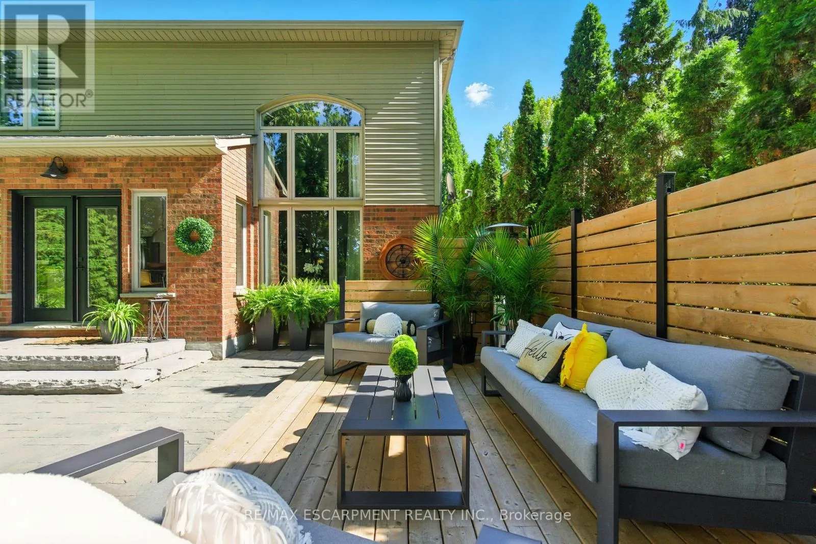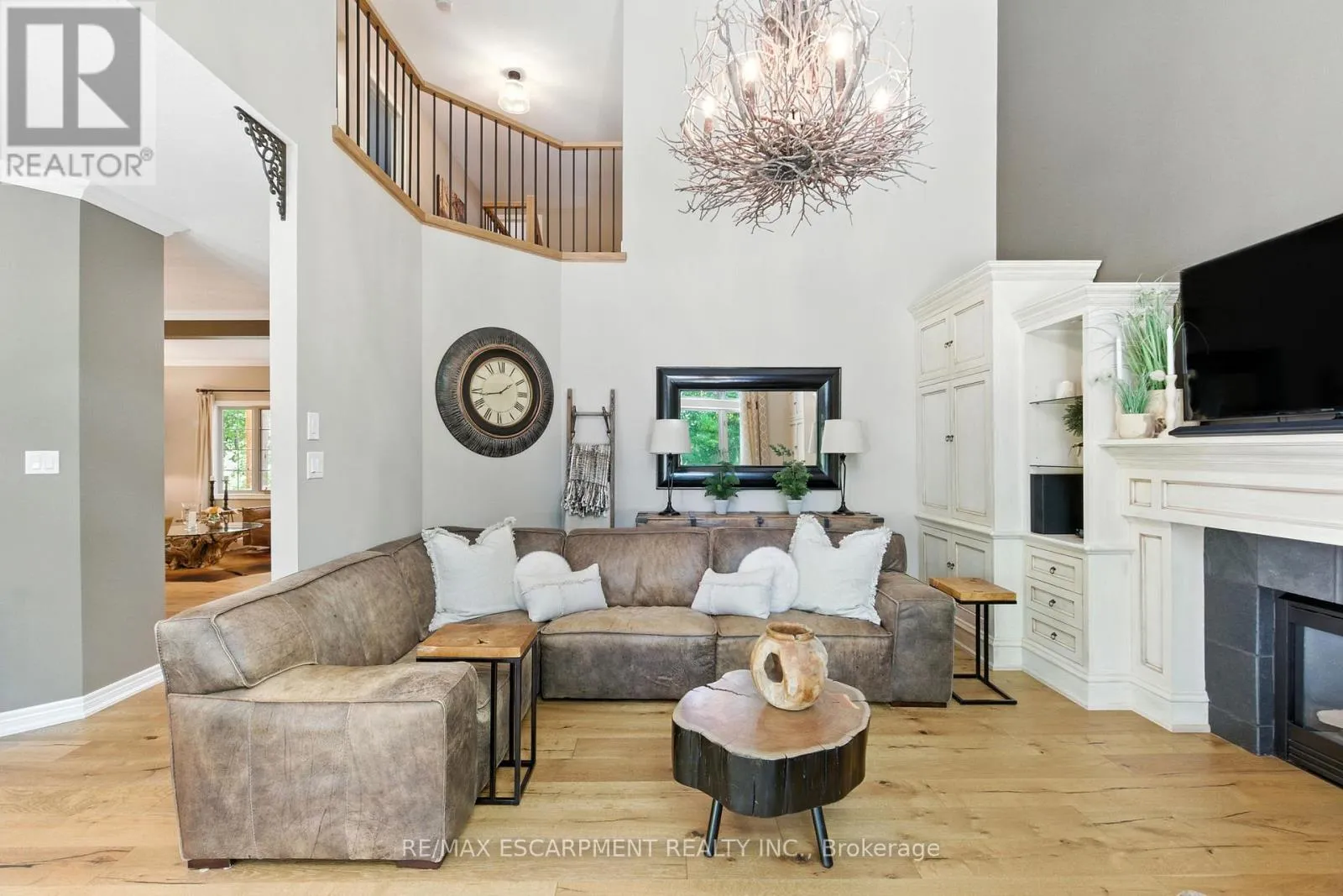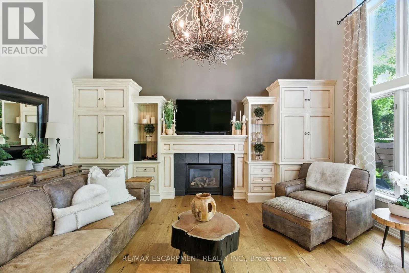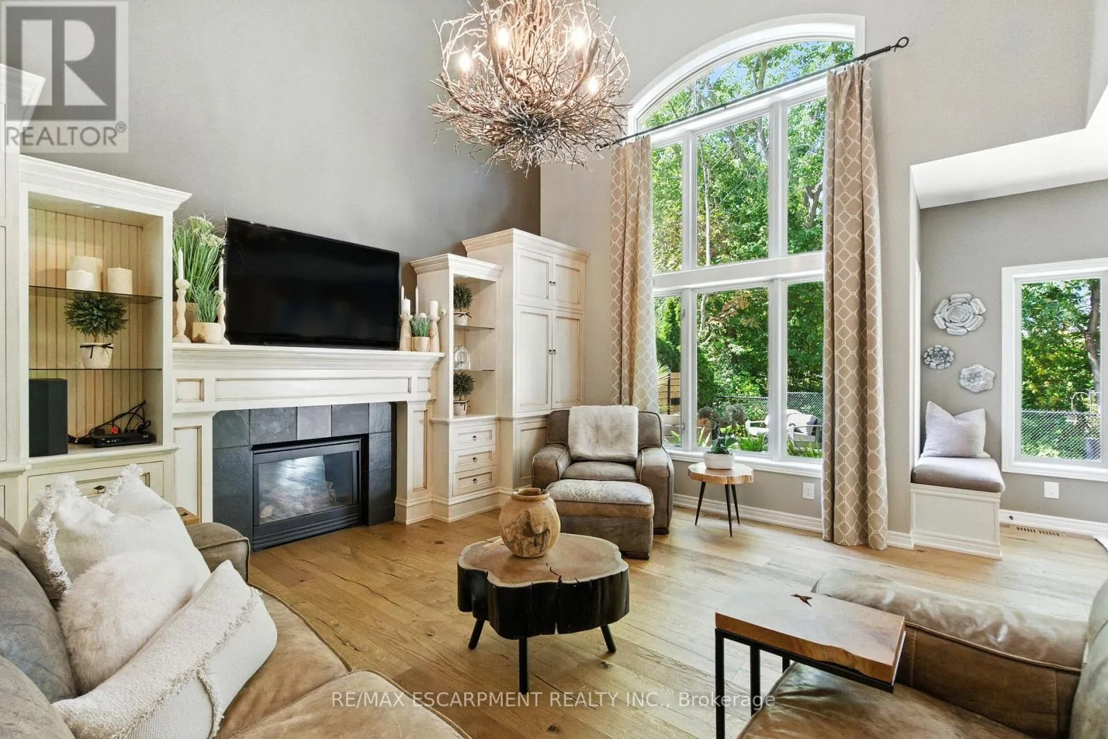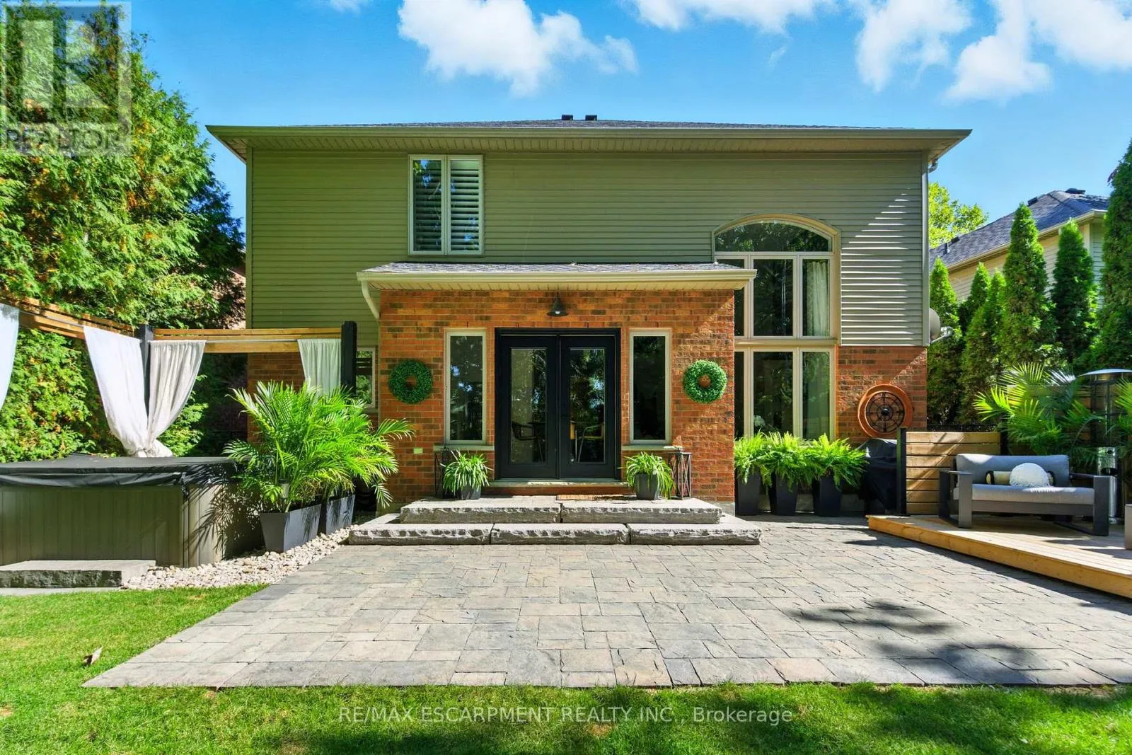 Cross Streets: -. ** Directions: PLAINS RD W TO UNSWORTH AVE TO SANDCHERRY DR. A rarity on Sandcherry! Tucked away in a desirable, tranquil subdivision, 587 Sandcherry Drive leaves a lasting impression from the very first glance. With beautiful gardens and mature trees and a quiet elegance, this home has a presence that feels both welcoming and peaceful. Step inside to find a residence that impresses across the nearly 2,900 square feet of above grade living. Engineered oak floors stretch across the main level, guiding you from one generous space to the next. The formal dining and living area offer grandeur, while the two-storey family room - anchored by a gas fireplace - feels like the perfect perch for gathering. And then there's the kitchen. Here, you'll find a kitchen that anticipates every want, with gorgeous white cabinetry, stainless steel appliances, casual dining area and a walk out to the backyard. Upstairs, the primary suite leans into quiet luxury with a soft brick feature wall, a fireplace for moody evenings, and a walk-in closet that feels more like a boutique than storage. The ensuite, flooded with natural light, offers a shower for two and an extended vanity - equal parts indulgent and practical. Two more bedrooms complete this level, one with direct access to the main bath. An additional 1,000 square feet of living space is found in the fully finished basement, where a quiet space has been designed for an at-home office, plus a family room and a powder room. But the real secret is the backyard. Private, enveloped by greenery and designed for lingering. One side offers a hot tub for restorative nights under the stars, while the other hosts a deck for long summer dinners. And beyond the fence? Direct access to the Royal Botanical Gardens nature, quite literally, in your own backyard. A home that balances elegance and ease. A retreat that feels both grounded and elevated. And yes, a rarity that wont be waiting long. RSA. (id:27476)