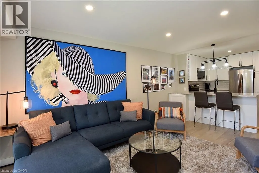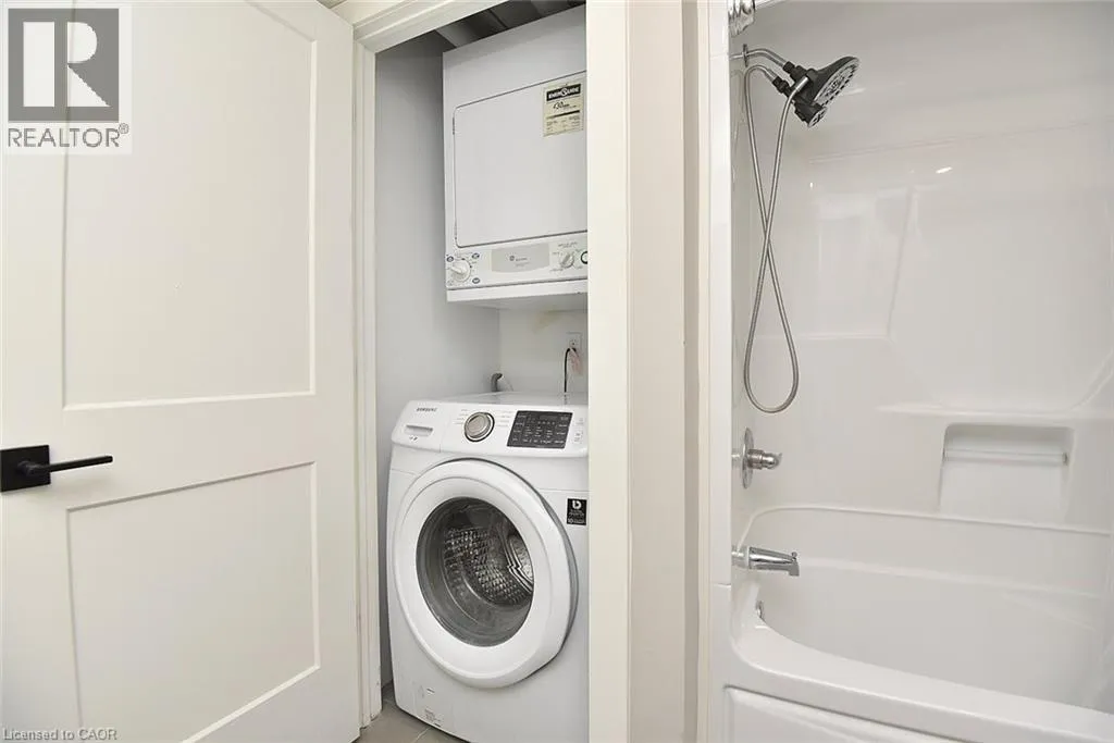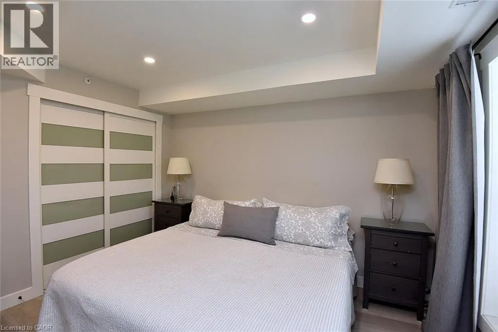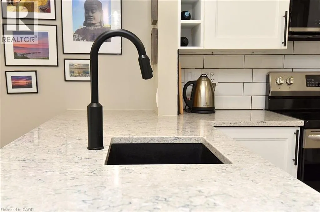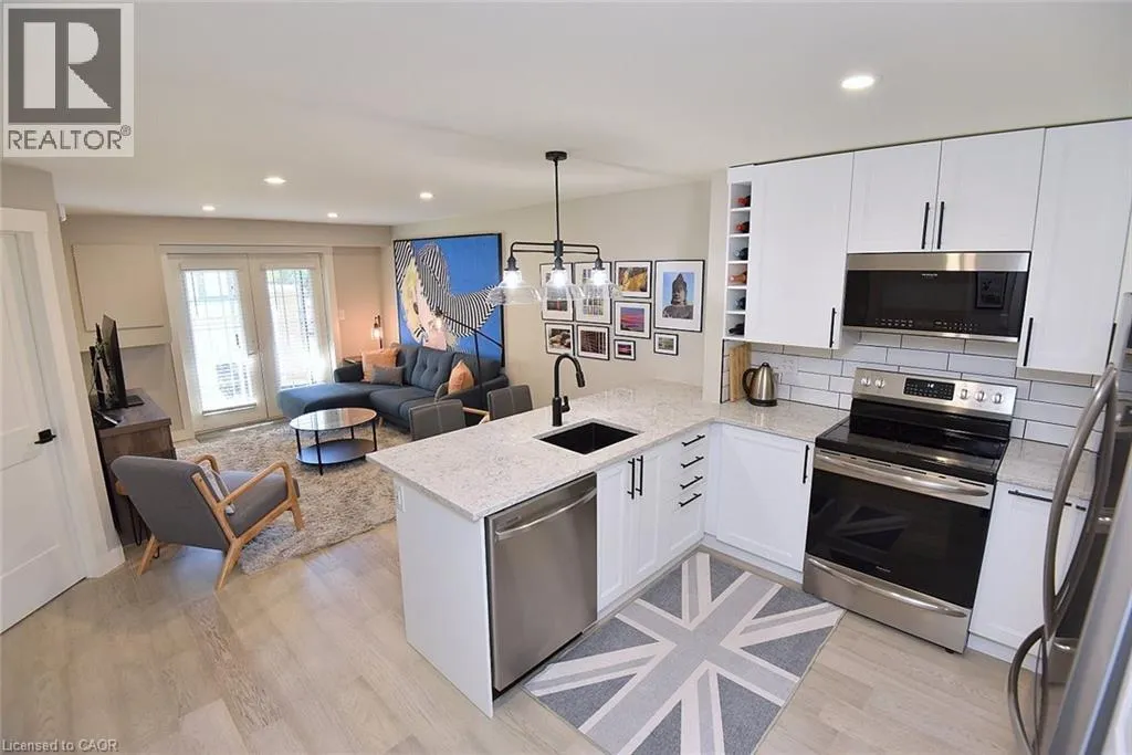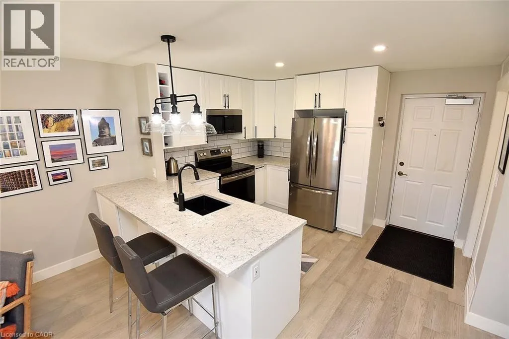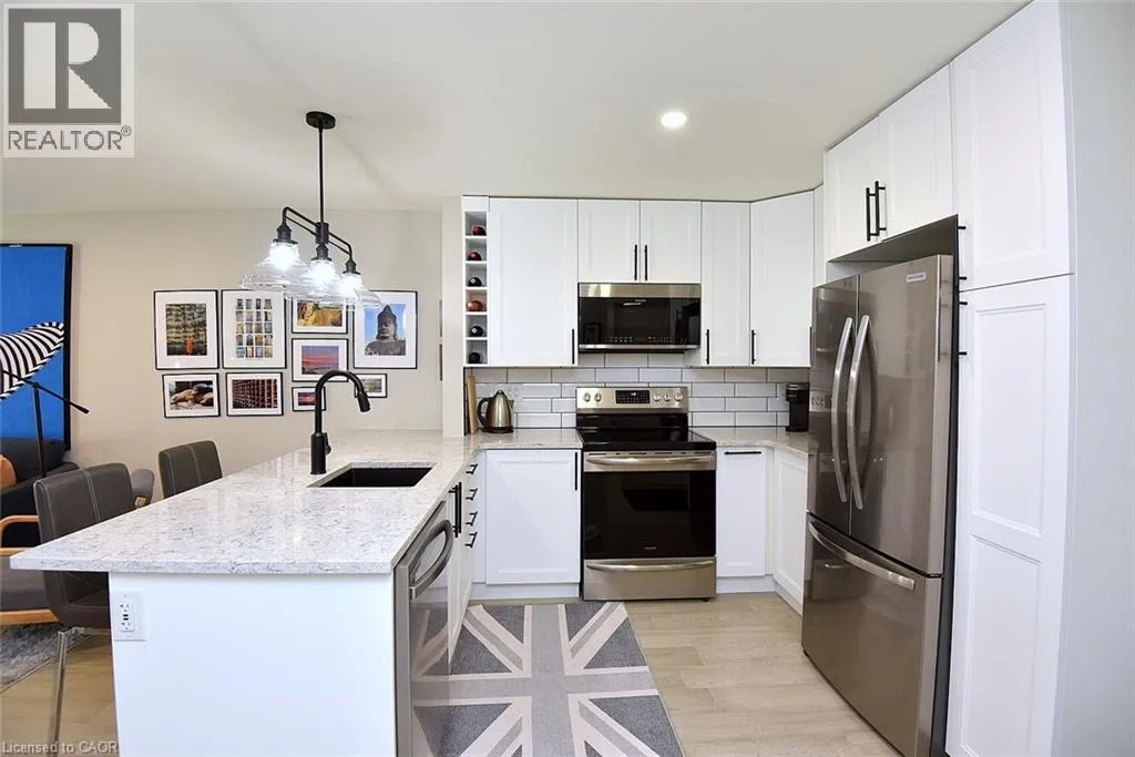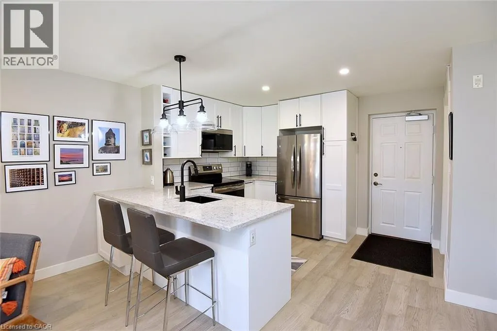 Appleby Line, north of Upper Middle Road Welcome to Uptown Orchard condos. This fully renovated upscale 1 bedroom condo is the perfect blend of modern design, premium finishes and effortless comfort, offering a private retreat in the heart of the city. Step inside this lovely condo to discover a thoughtfully designed open-concept layout. The spacious living area features engineered hardwood floors, custom pot lights and a seamless flow into the kitchen space that boasts a new classic white kitchen with black accents, chef approved stainless steel appliances & Silestone counters. This is a lovely space to entertain family and friends. Enjoy the 4 piece bathroom with tub/shower combo, white vanity, ceramic floors and in-suite laundry. Comes complete with 1 underground parking space and a storage locker. Whether you're a first time buyer, busy professional or savvy investor, this turnkey property offers a rare opportunity to own a piece of upscale urban living. Close proximity to everything you need. This condo is a dream, with nothing left to do but move in and enjoy. Burlington has many amenities to enhance your lifestyle. (id:27476)